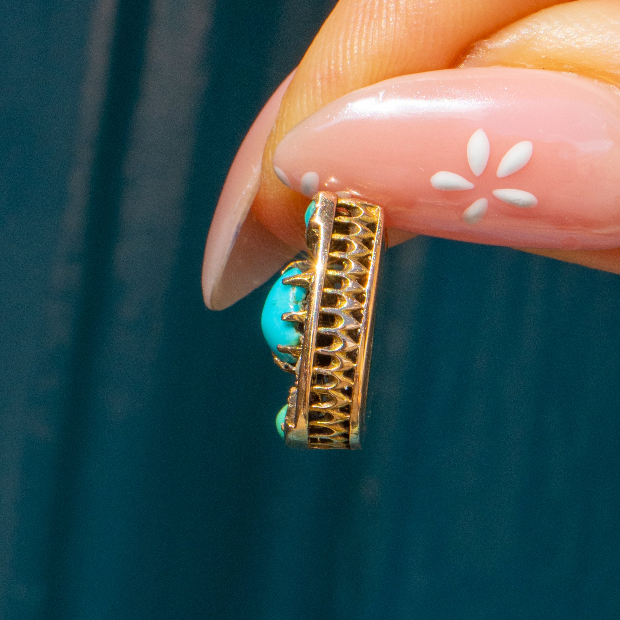 This Victorian 15ct Gold Turquoise Diamond horseshoe pendant is one of the prettiest lucky charms we have ever laid eyes on! Crafted from solid 15ct Gold, this antique pendant is home to sparkly rose-cut Diamonds, with a combined weight of 0.25ct, and four Robin's egg blue Turquoise cabochons.