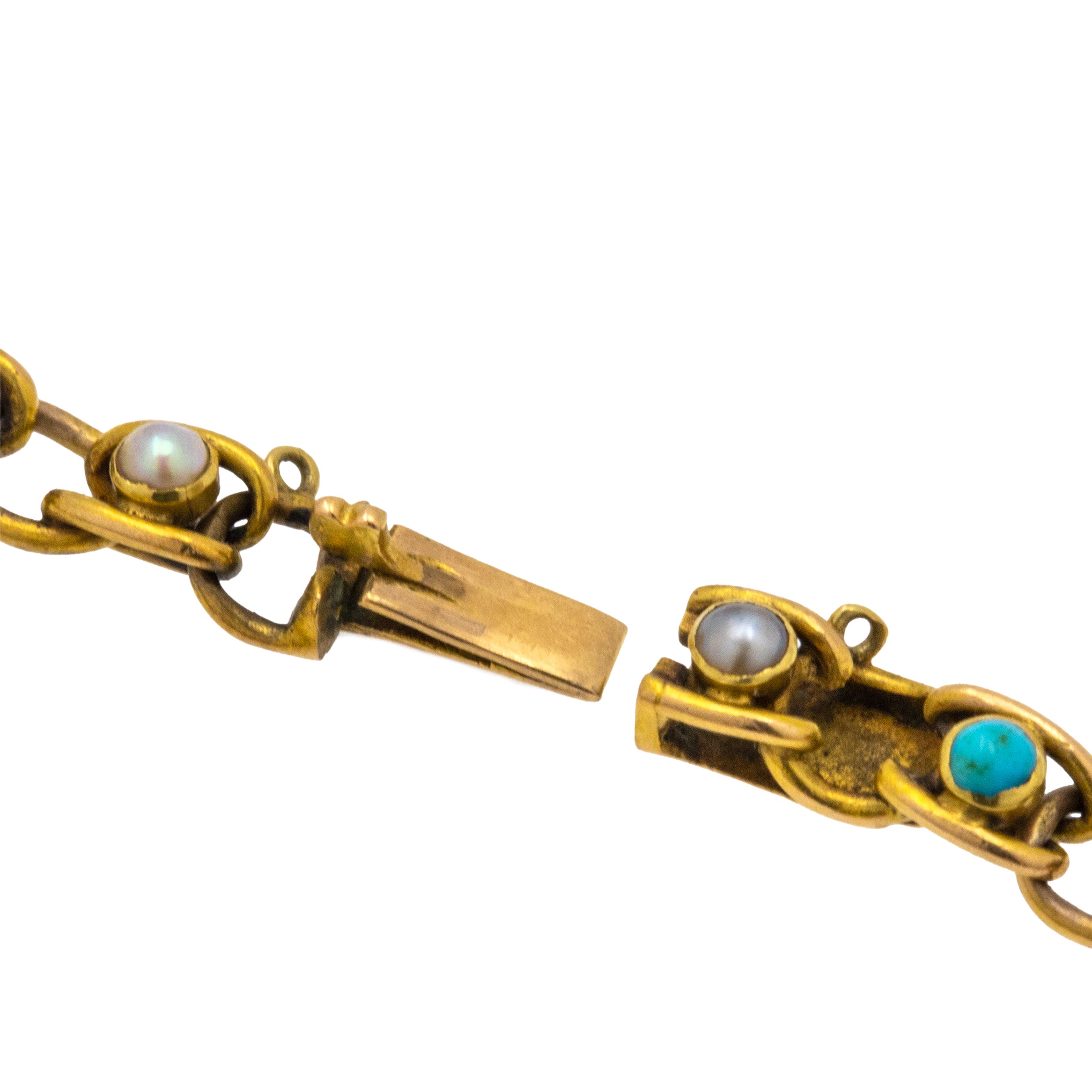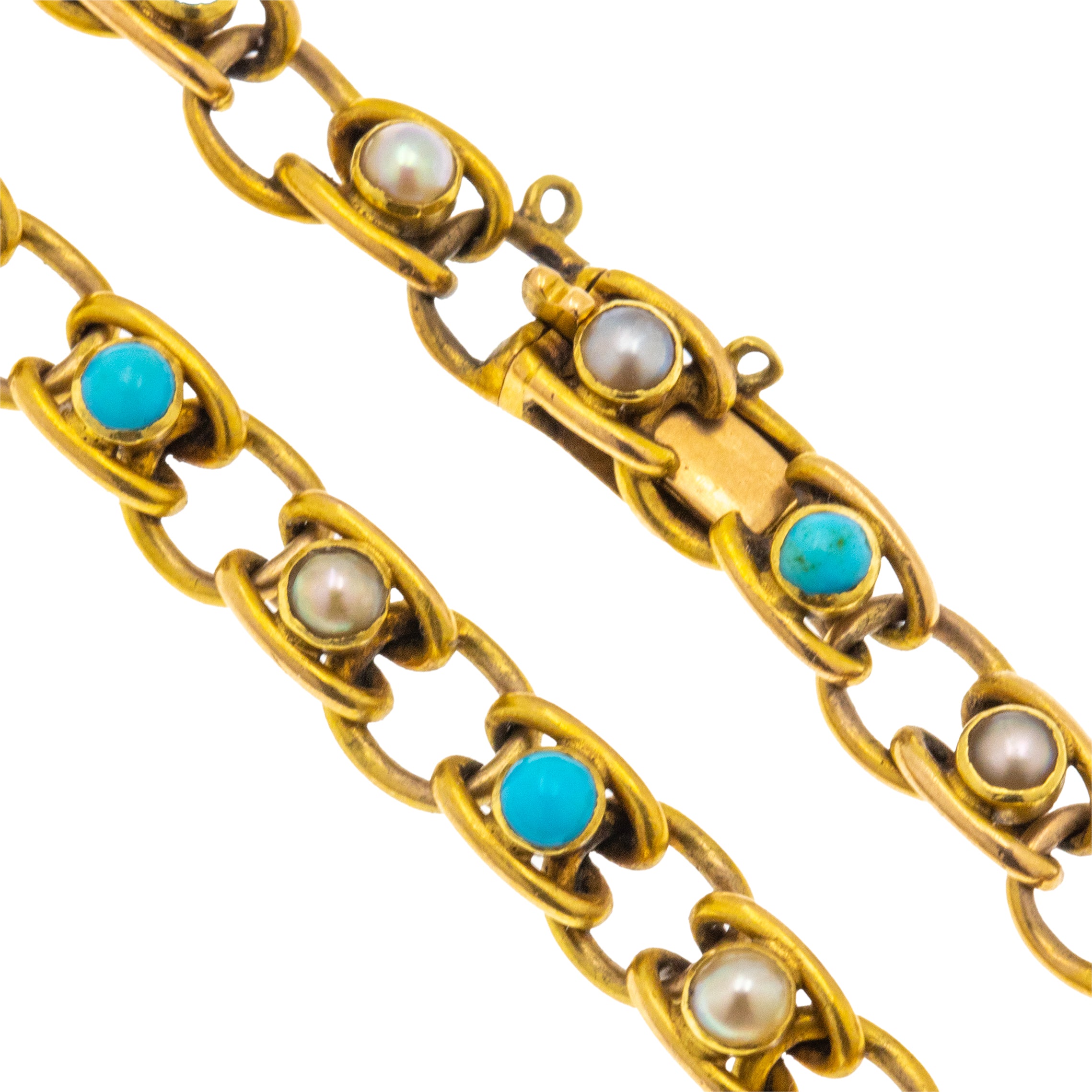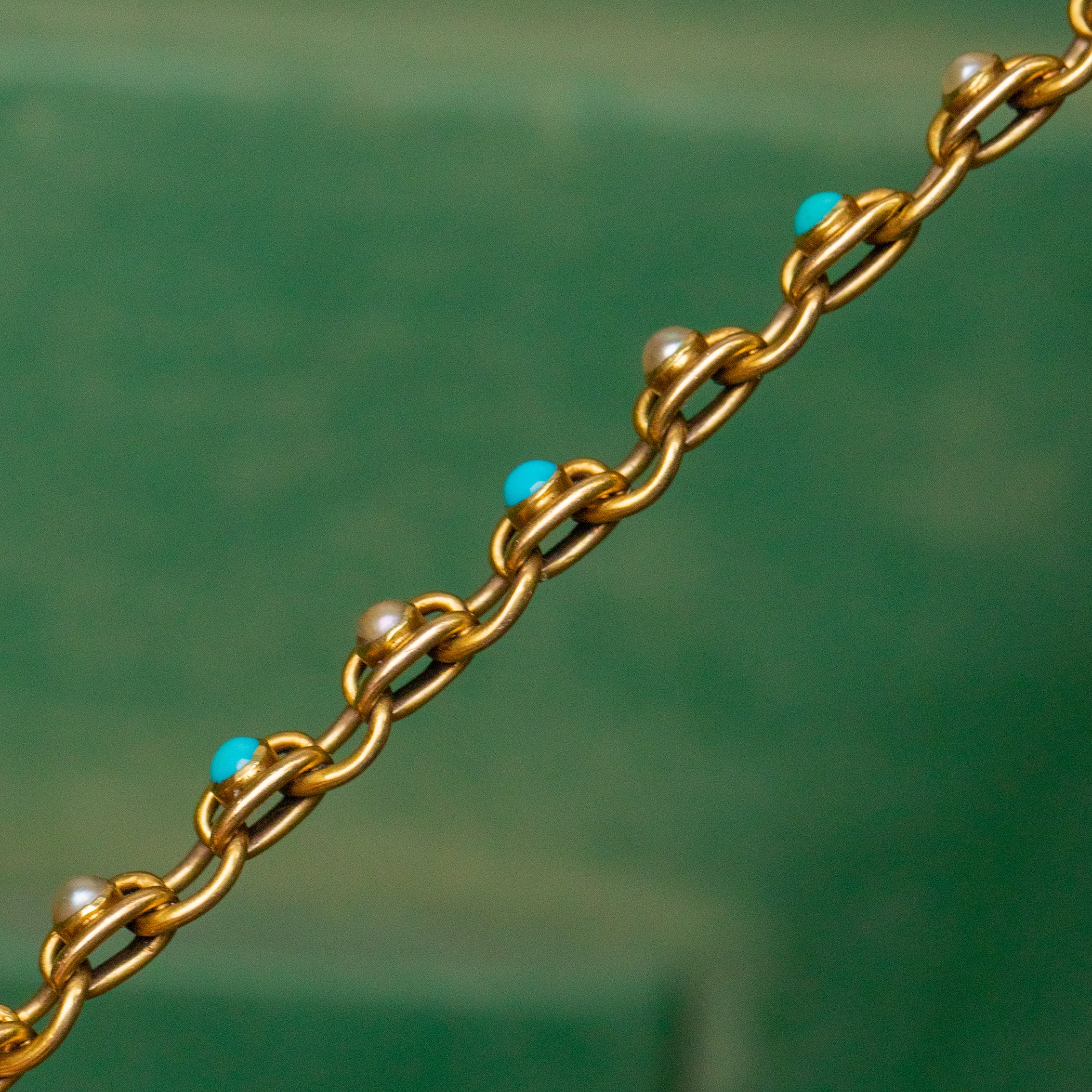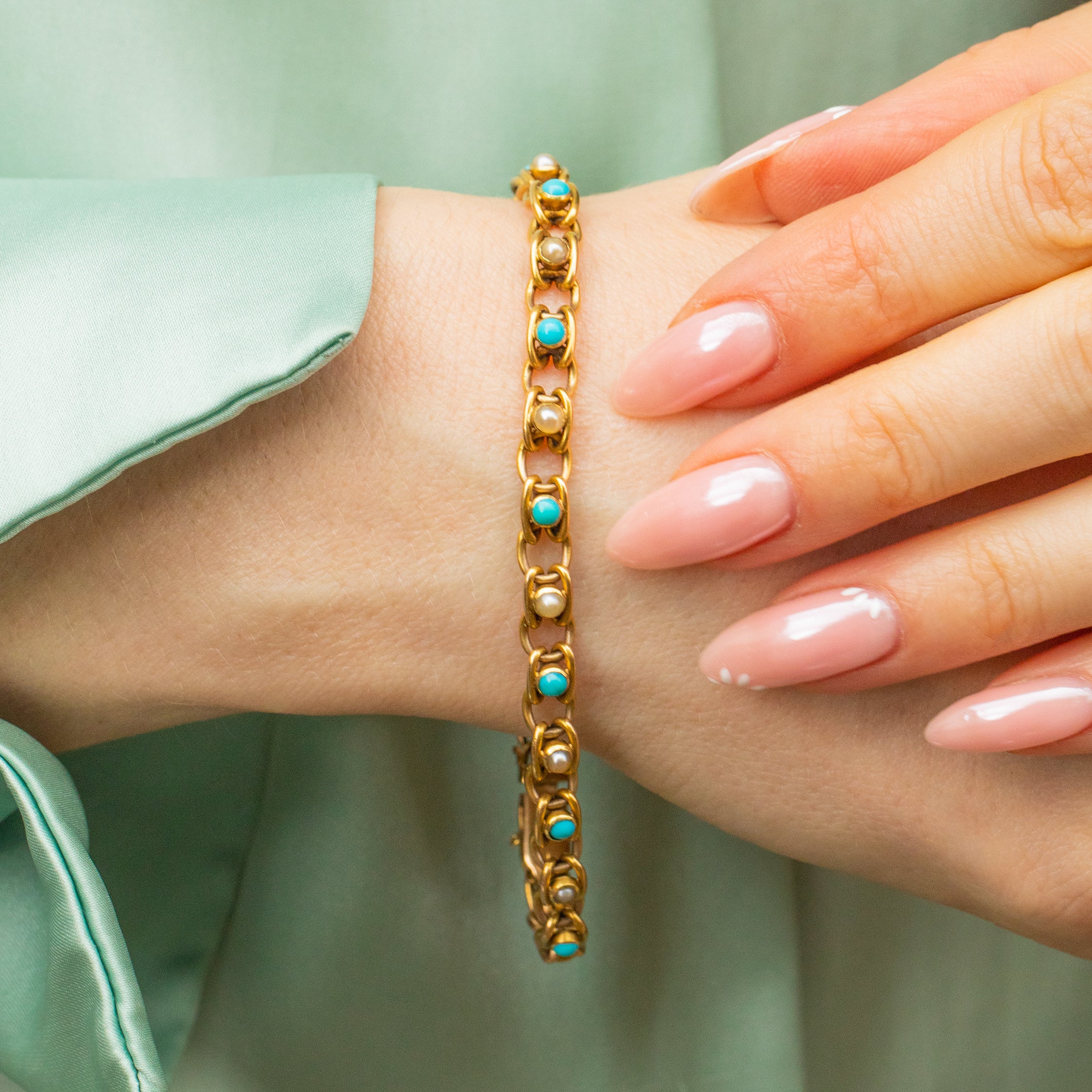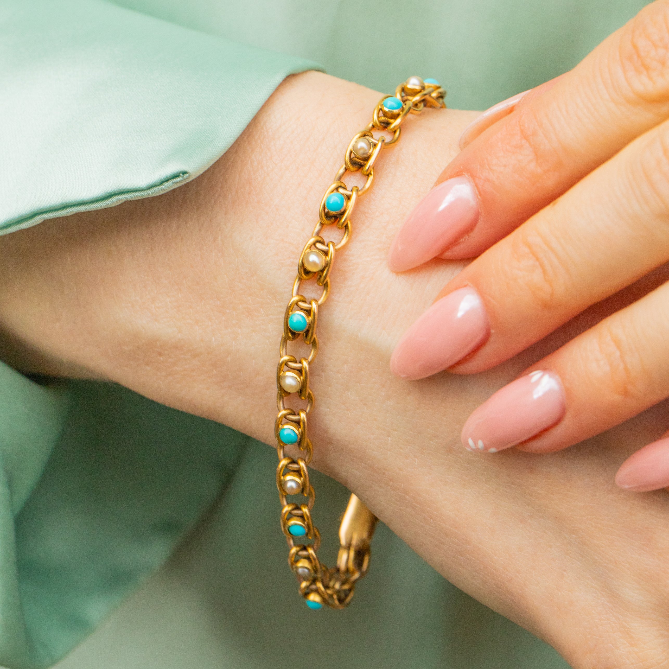 EXCELLENT. This Victorian 15ct Gold Turquoise Pearl bracelet is in excellent condition. The links on the bracelet are smooth, securely attached, and have remained robust. The Pearls and Turquoise are secure and each one has its own unique hue, an homage to their natural heritage. The bracelet closes securely and can be worn confidently. There are two discreet hoops near the clasp, where a safety chain was once attached, but this is no longer the case - if you'd prefer extra peace of mind we can organise a safety chain to fit with the piece, just get in touch to discuss it further!