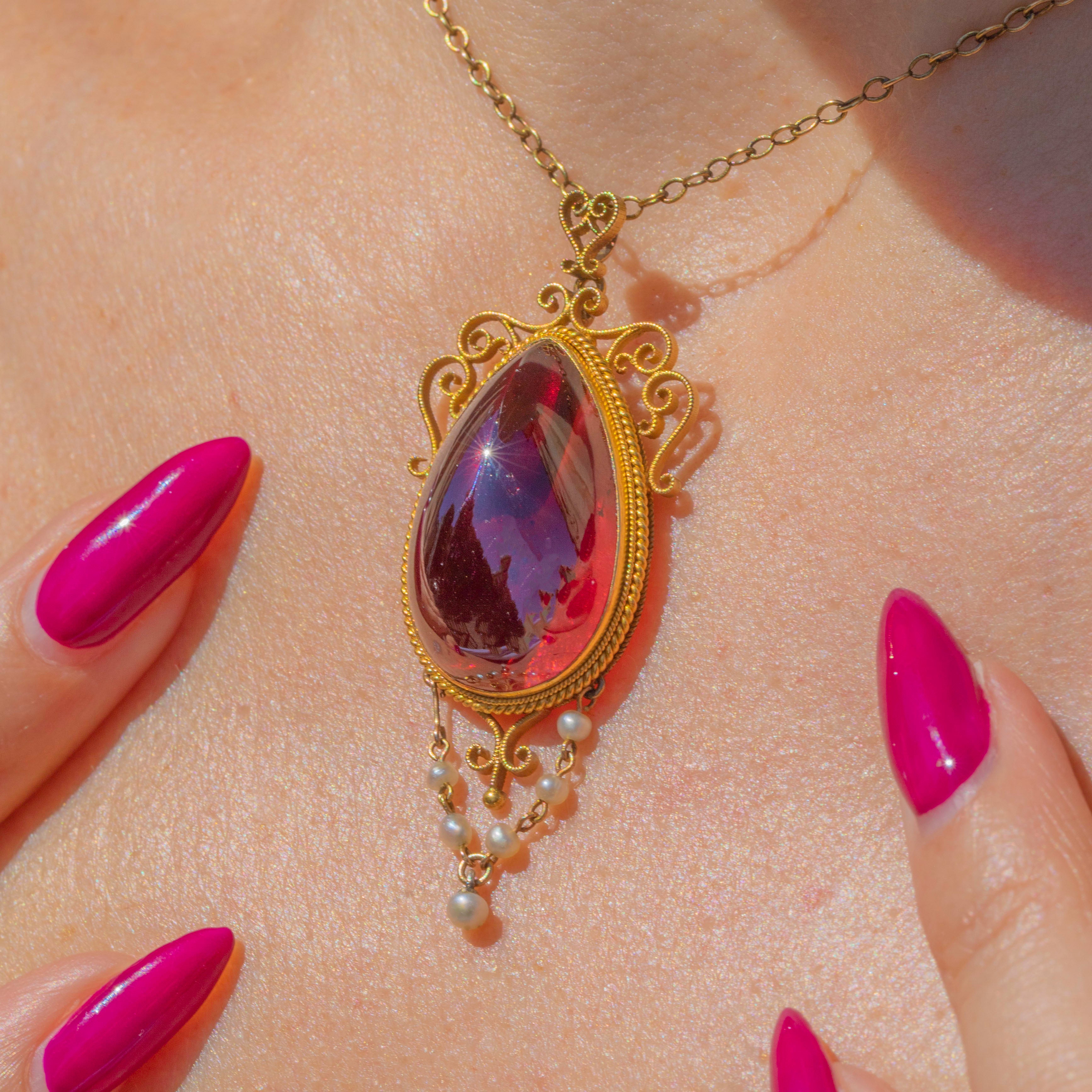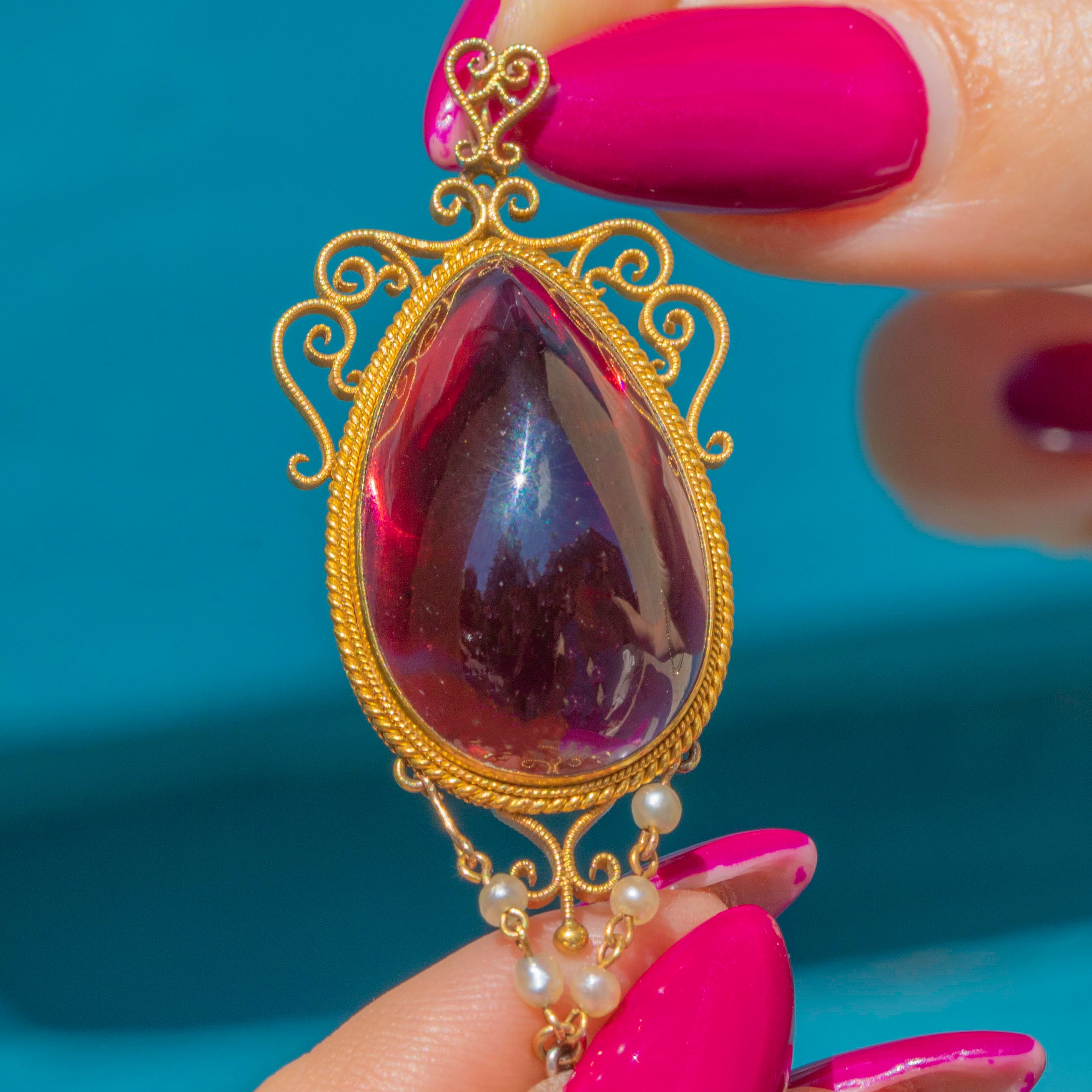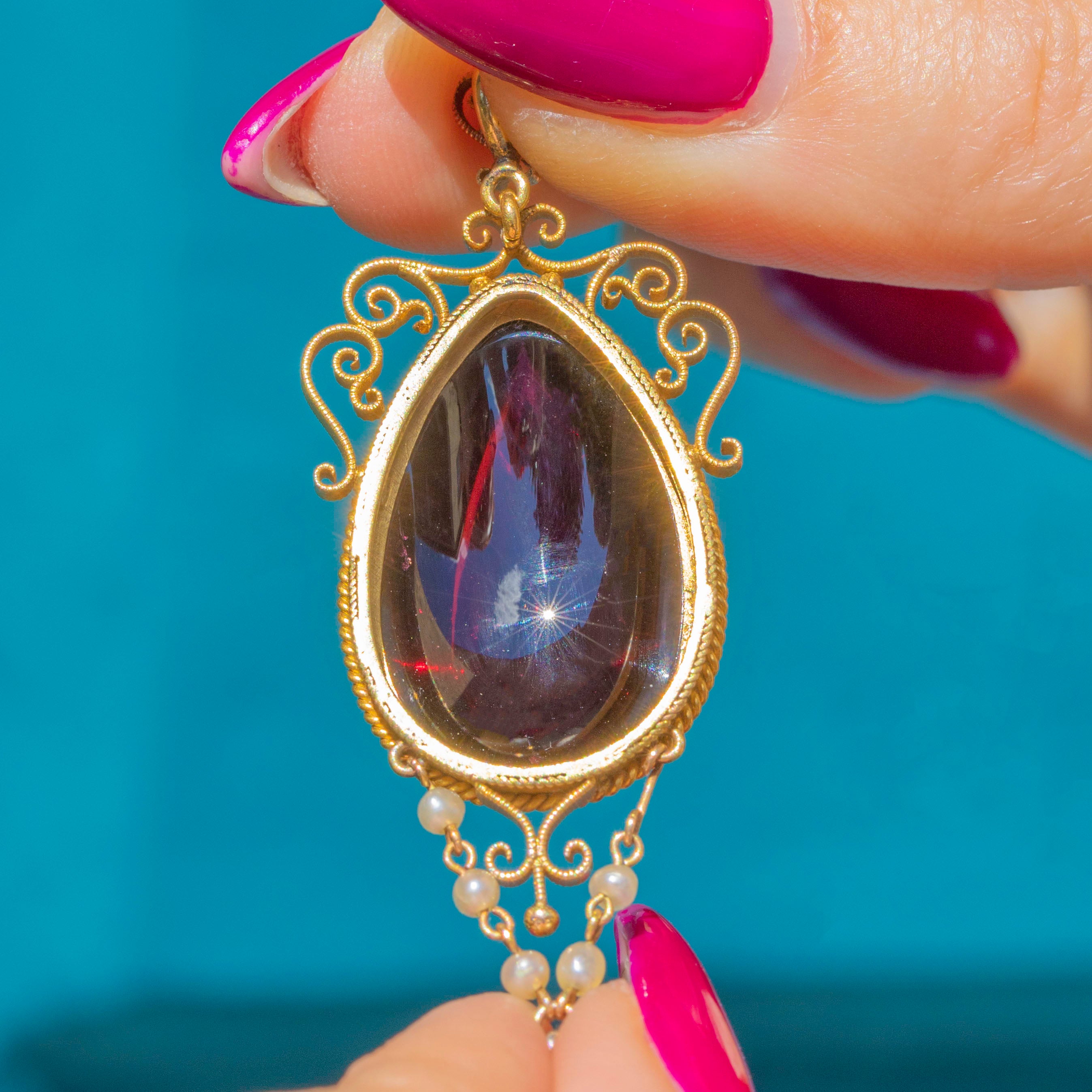 VERY GOOD-EXCELLENT: Her delicious 42.80ct Garnet is breathtaking, securely set in her 18ct Gold setting, with streaks of magnificent natural inclusions throughout. While she has a few minuscule signs of wear on her surface, this is only noticeable under very close inspection. Her Pearls have kept their wonderful opalescent glow, without any wear to their nacre. Complete with an intricately detailed chunky bale, she can be suspended from a chain of choice and worn with the utmost confidence!