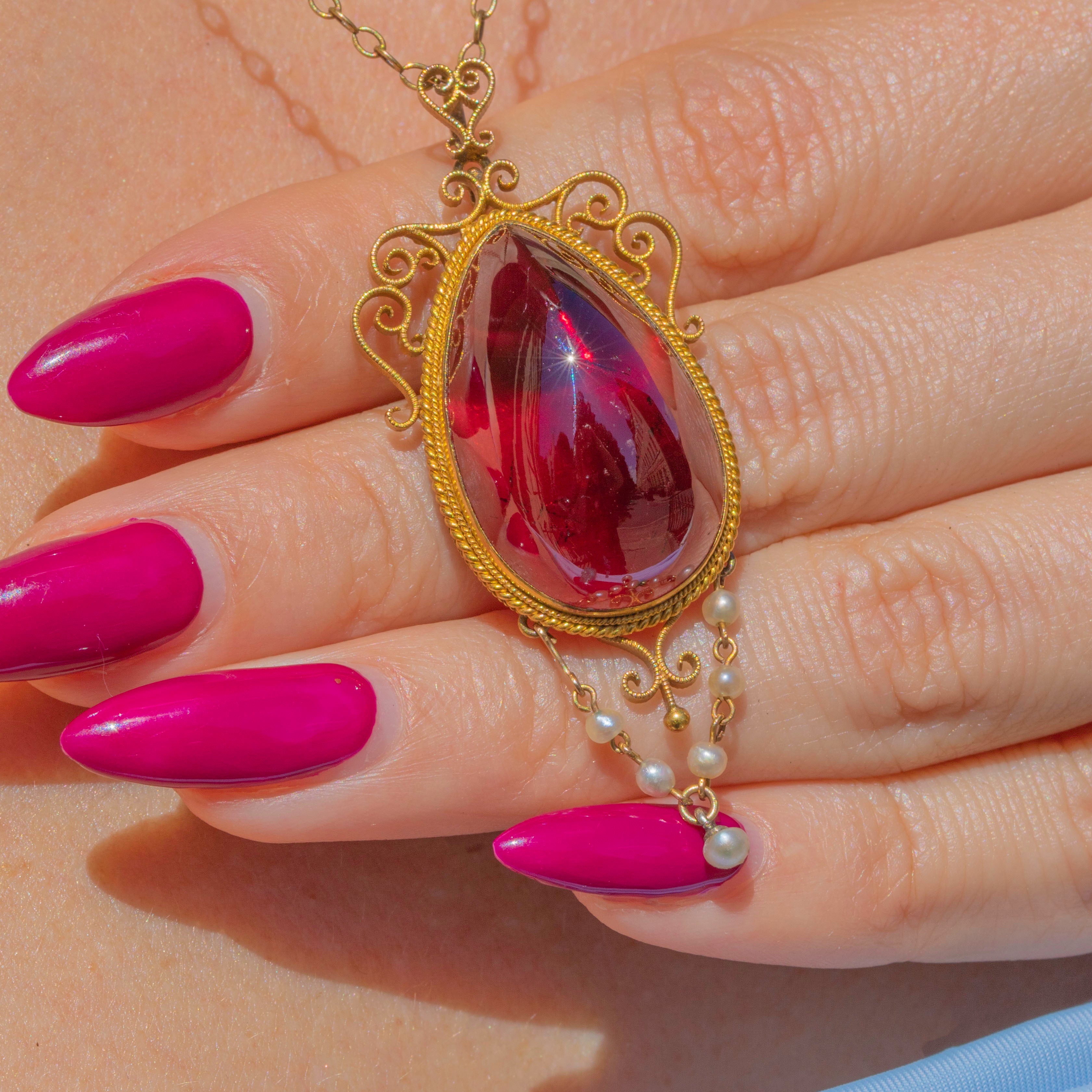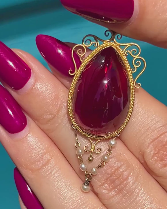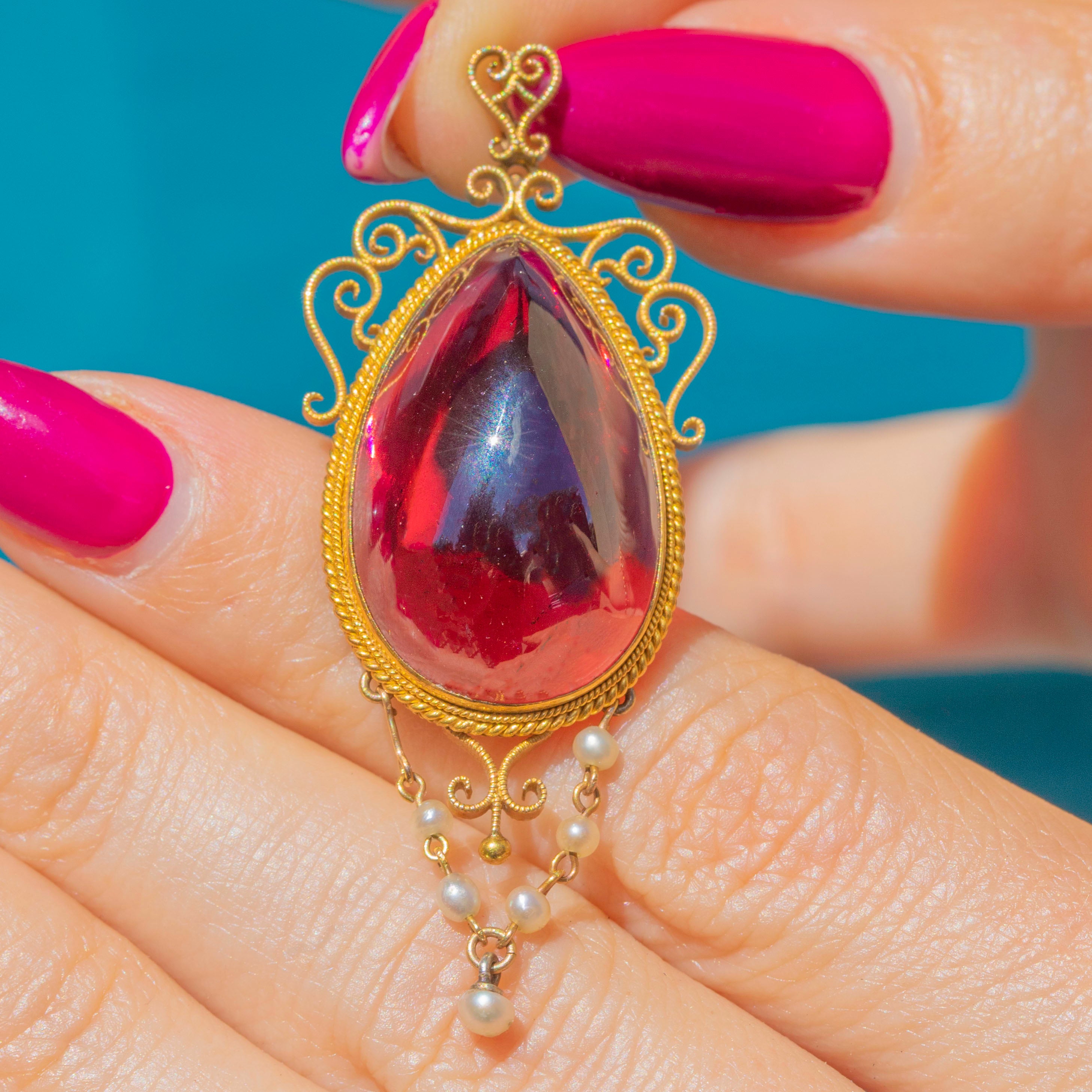 VERY GOOD-EXCELLENT: Her delicious 42.80ct Garnet is breathtaking, securely set in her 18ct Gold setting, with streaks of magnificent natural inclusions throughout. While she has a few minuscule signs of wear on her surface, this is only noticeable under very close inspection. Her Pearls have kept their wonderful opalescent glow, without any wear to their nacre. Complete with an intricately detailed chunky bale, she can be suspended from a chain of choice and worn with the utmost confidence!