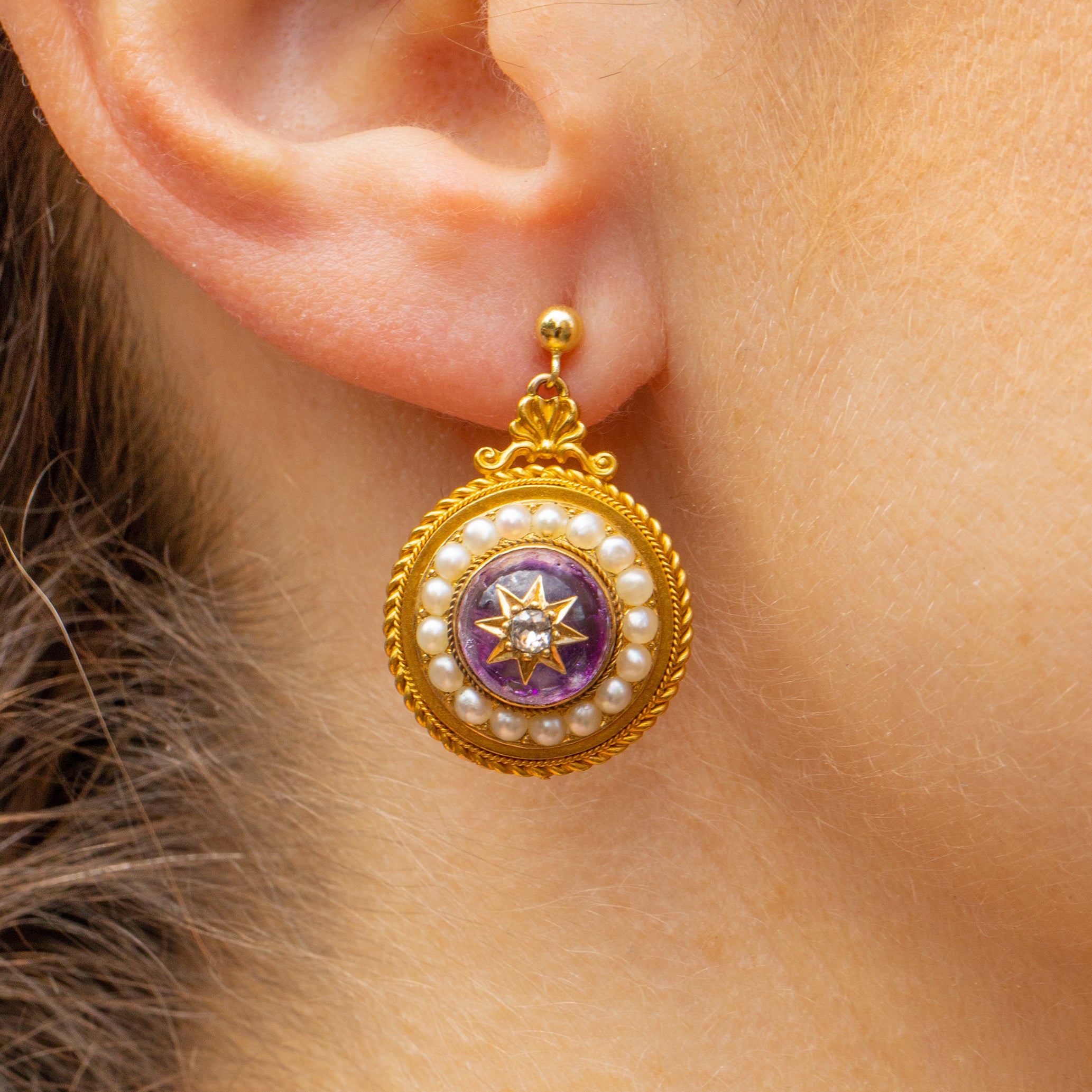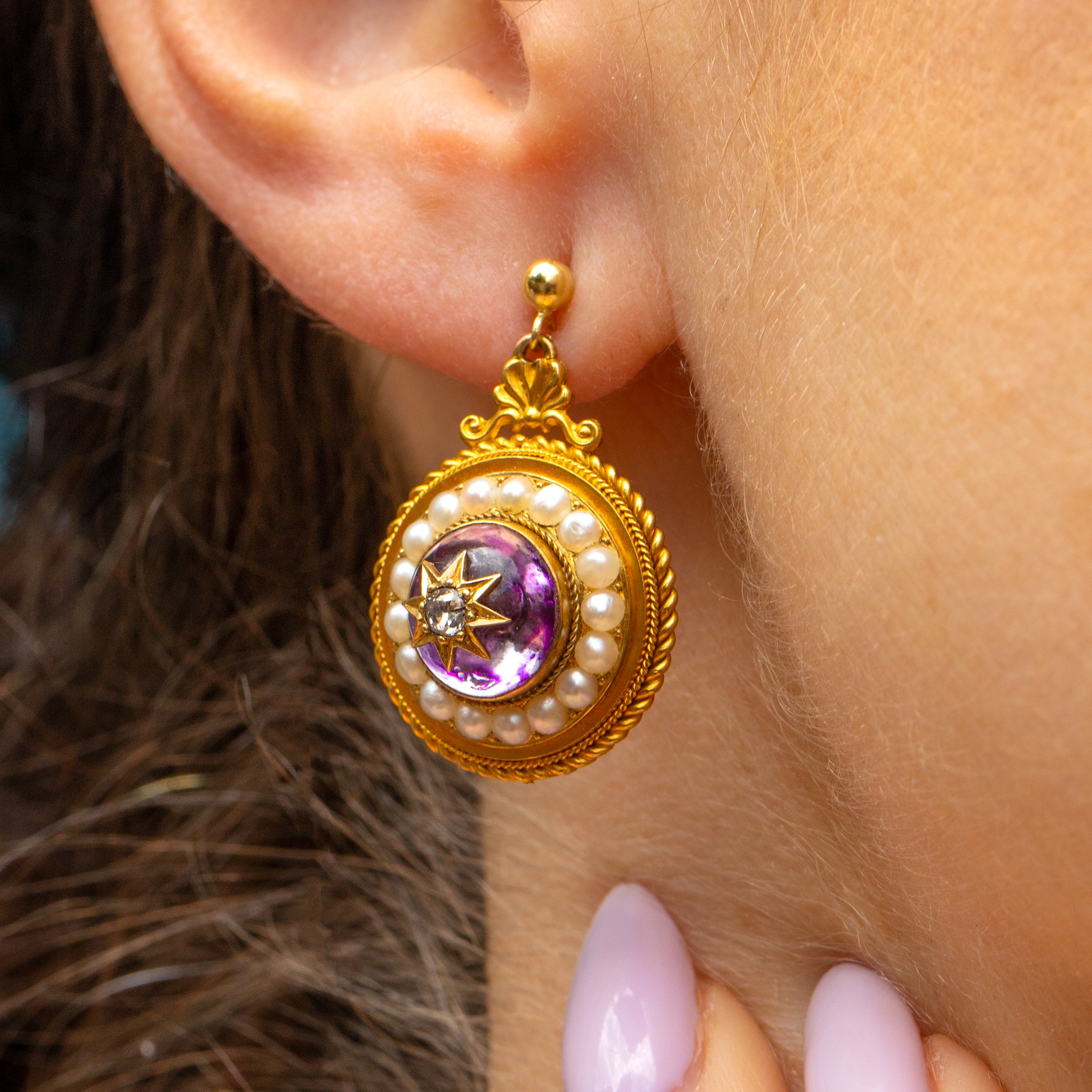 EXCELLENT. These Victorian 18ct Gold Amethyst cabochon Diamond star earrings are in excellent condition. Each component is securely connected and the 18ct Gold has retained a rich saturation. There is some minimal wear on the back of each earring, but nothing of concern considering their grand age. The Amethysts and Diamonds are both secure, with no notable damage, and the pink-toned foil adds a stunning radiance to the Amethyst orbs! No chips, cracks or damage of any kind. The sea of Pearls offer a harmonious shimmer, each one securely set with a wonderful nacre of ivory and cream tones. With tight-fitting butterfly backs, you can wear these Victorian Gold earrings with confidence and style.