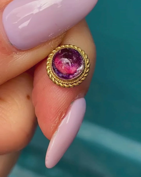 VERY GOOD-EXCELLENT. This Victorian 18ct Gold Amethyst charm is in very good to excellent condition. From the front, this Amethyst charm is in fabulous condition with a plump Amethyst cabochon and pristine rope details bordering it. To the back there is some subtle wear from a previous conversion from a stick pin, however, carried out expertly this has caused minimal damage. A new treasure ready to become a part of your jewellery collection.