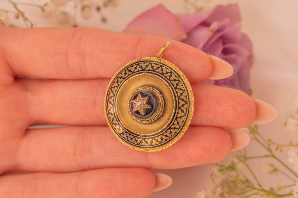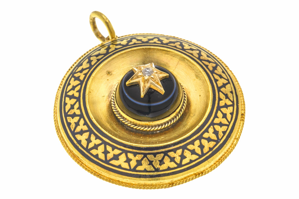 This Victorian 18ct Gold Banded Agate Enamel Diamond pendant is a striking jewel! Inlaid with a domed Banded Agate and an old-cut antique Diamond star accent, this incredible Etruscan revival pendant will transform you into a warrior queen.