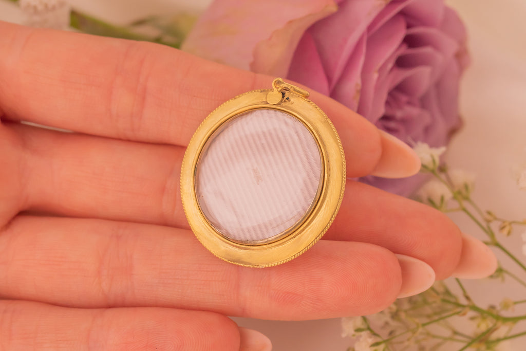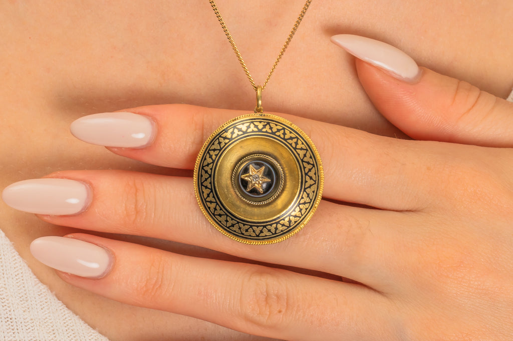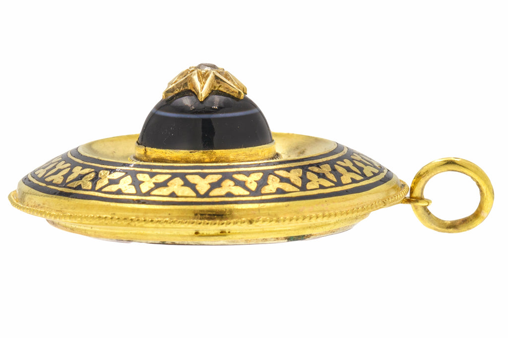 VERY GOOD-EXCELLENT: This Victorian 18ct Gold banded Agate Enamel Diamond pendant is in wonderful condition. Starting life as a brooch, she has been expertly converted into a pendant locket, where you can remove the back and place your own photos. With such minimal signs of this conversion, it's as though she has always been destined to be a pendant. Under close inspection, you will see abrasions around where the jump ring has been added. The jump ring is soldered ensuring secure wear at all times. This Etruscan revival pendant will add bundles of character to your jewellery box.