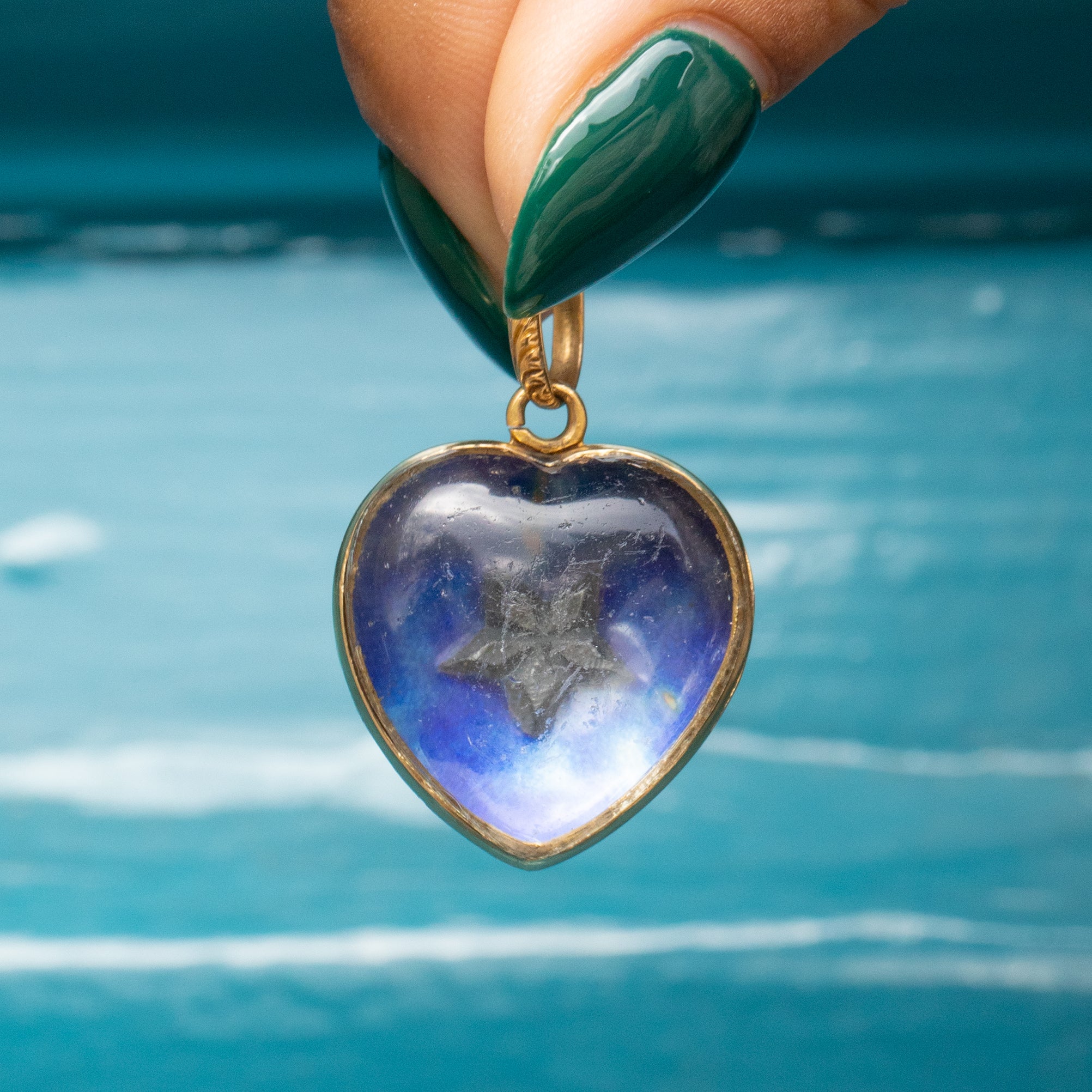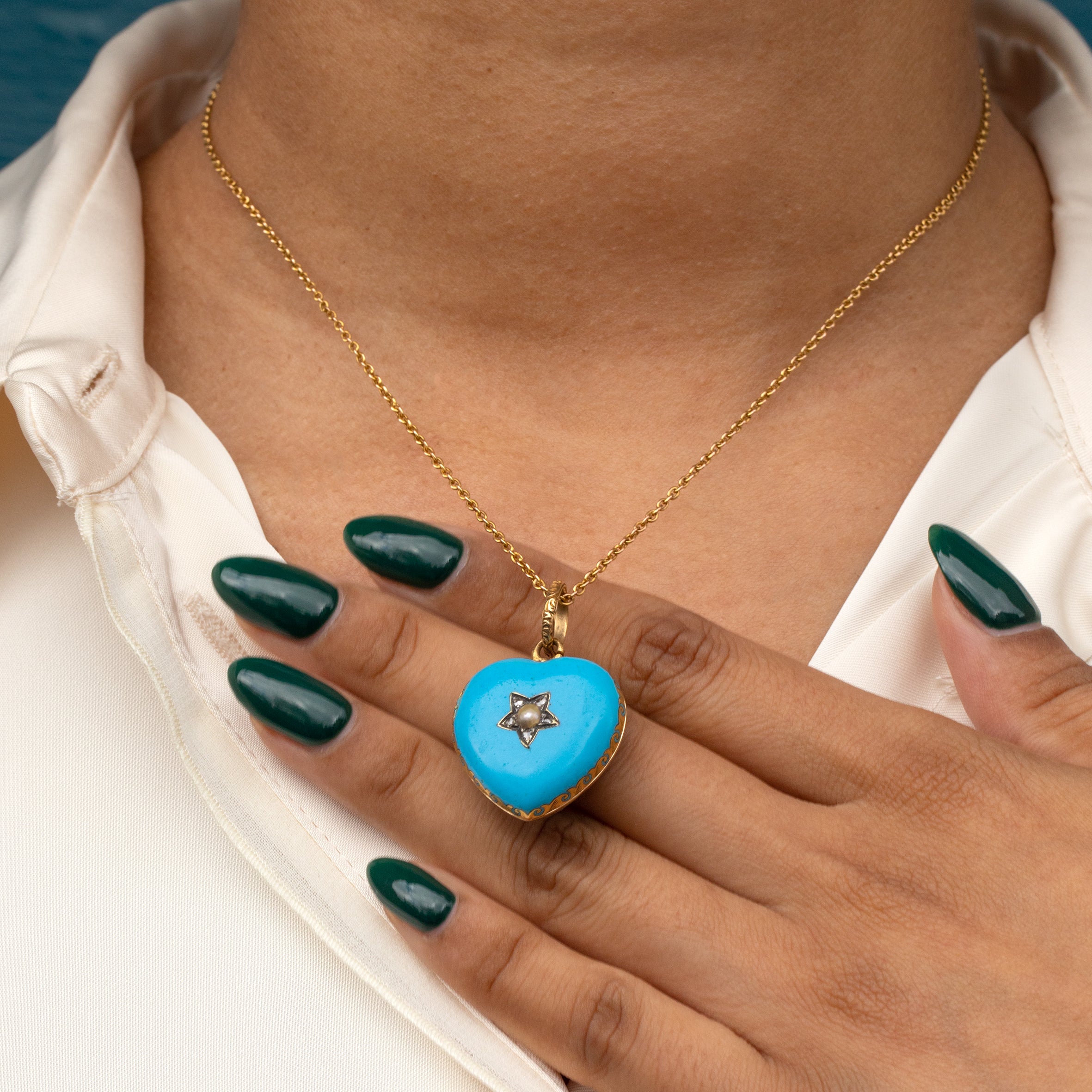 VERY GOOD. This Victorian 18ct Gold blue Enamel Pearl Diamond star heart locket is in very good condition. The locket is in great shape and smooth to the touch. The Pearl is creamy and securely held within its setting. The Diamonds are all present with only some minor nibbles to note, however, they are all securely held in their settings. The Enamel has the most vibrant duck egg blue hue with some age-related wear to note, most notably the top corner of the heart, but this is not particularly noticeable face-on. The Glass panel has some scratches across its surface, which is to be expected from a piece her age. The hinge is in perfect working order and will keep the contents securely inside, and complete with a generous jump ring, you can wear this striking antique locket confidently!