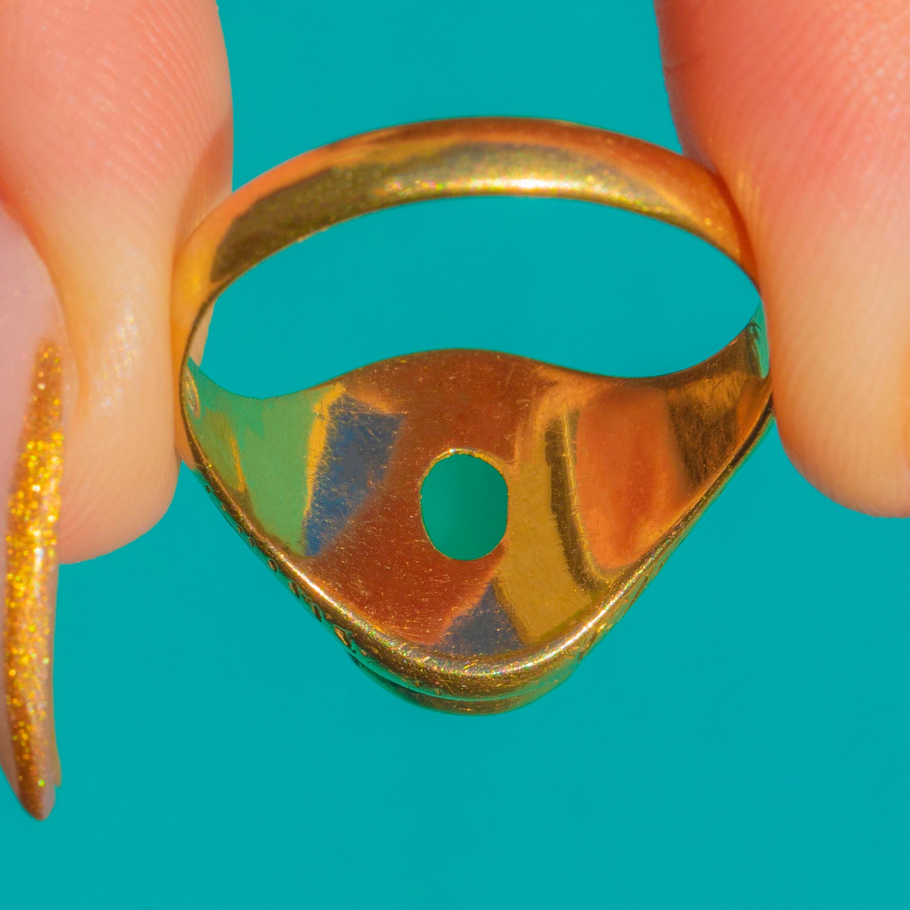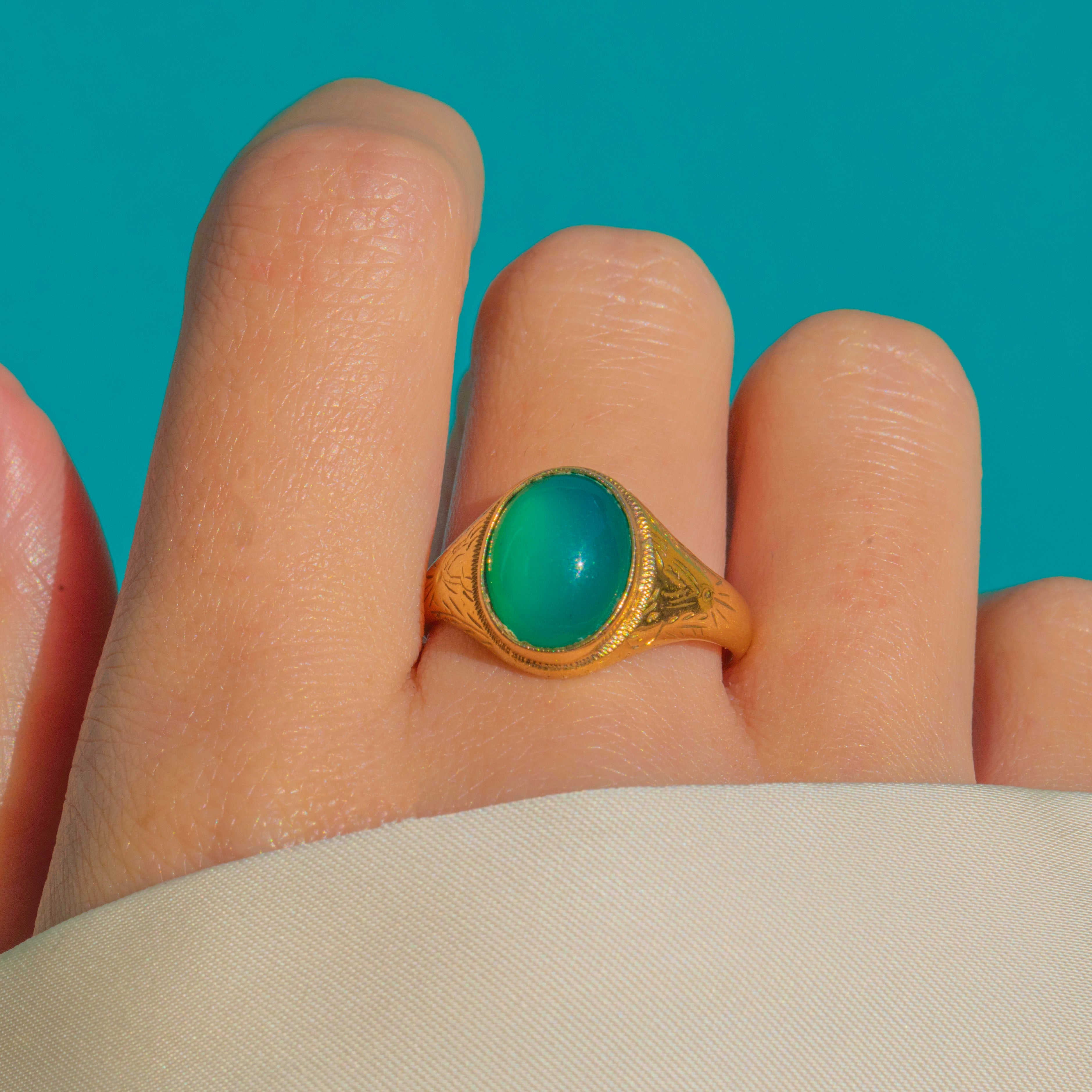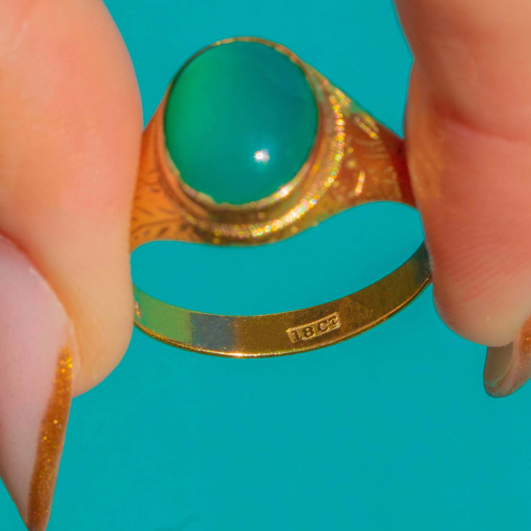 EXCELLENT: The Chrysophrase is smooth and glossy with no chips or cracks visible under close inspection. The 18ct Gold setting and tapered band are in lovely condition with crisp outlines and the engravings are still visible, with only light surface wear in keeping with age. No signs of thinning, damage or repairs, and the ring presents beautifully on the hand.