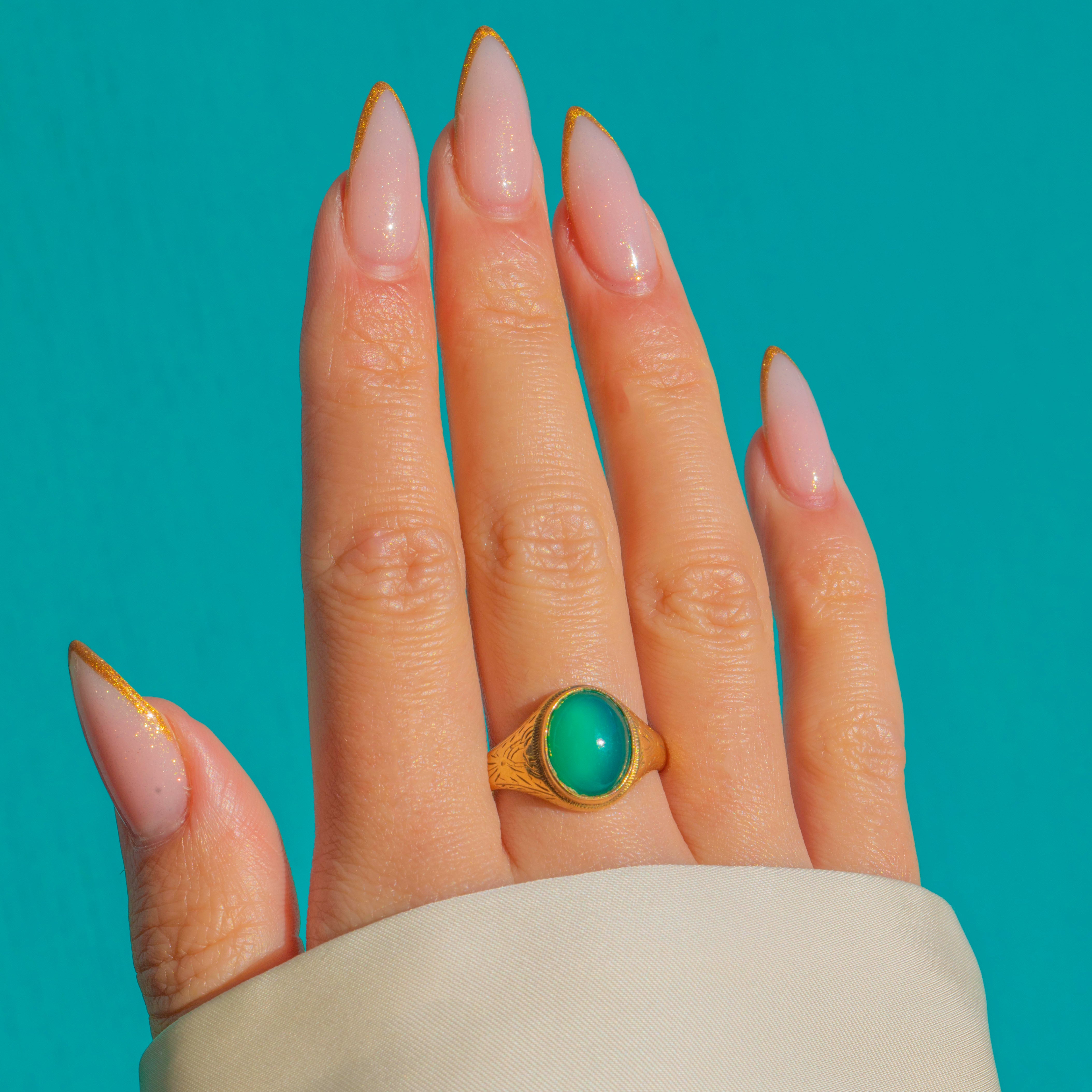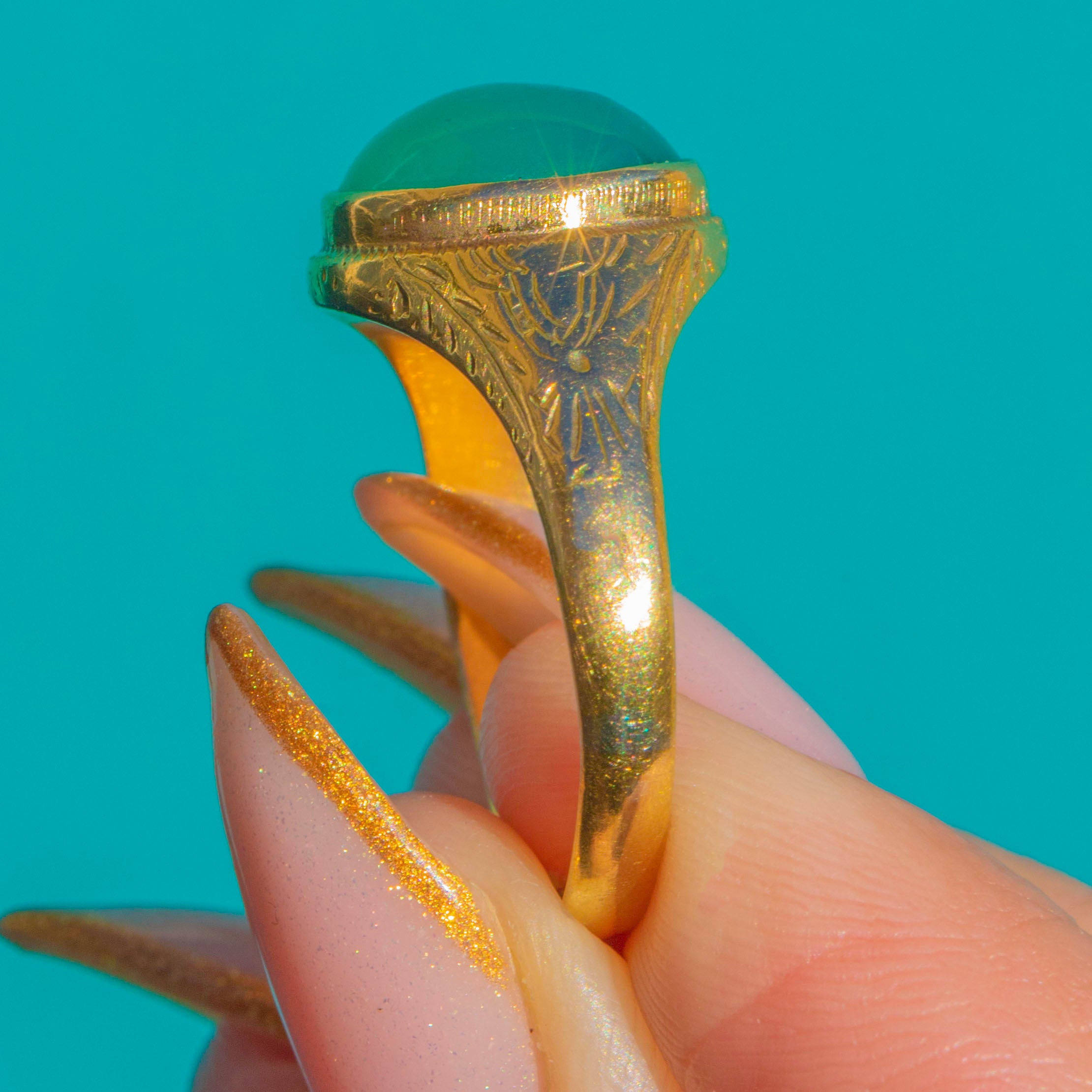 This antique late Victorian 18ct Gold Chrysophrase ring is a bold, colourful statement from the Aesthetic era. The luminous green Chrysophrase cabochon is securely set in a smooth and beautifully hand-engraved, tapering Gold bezel that feels luxurious and substantial on the hand.