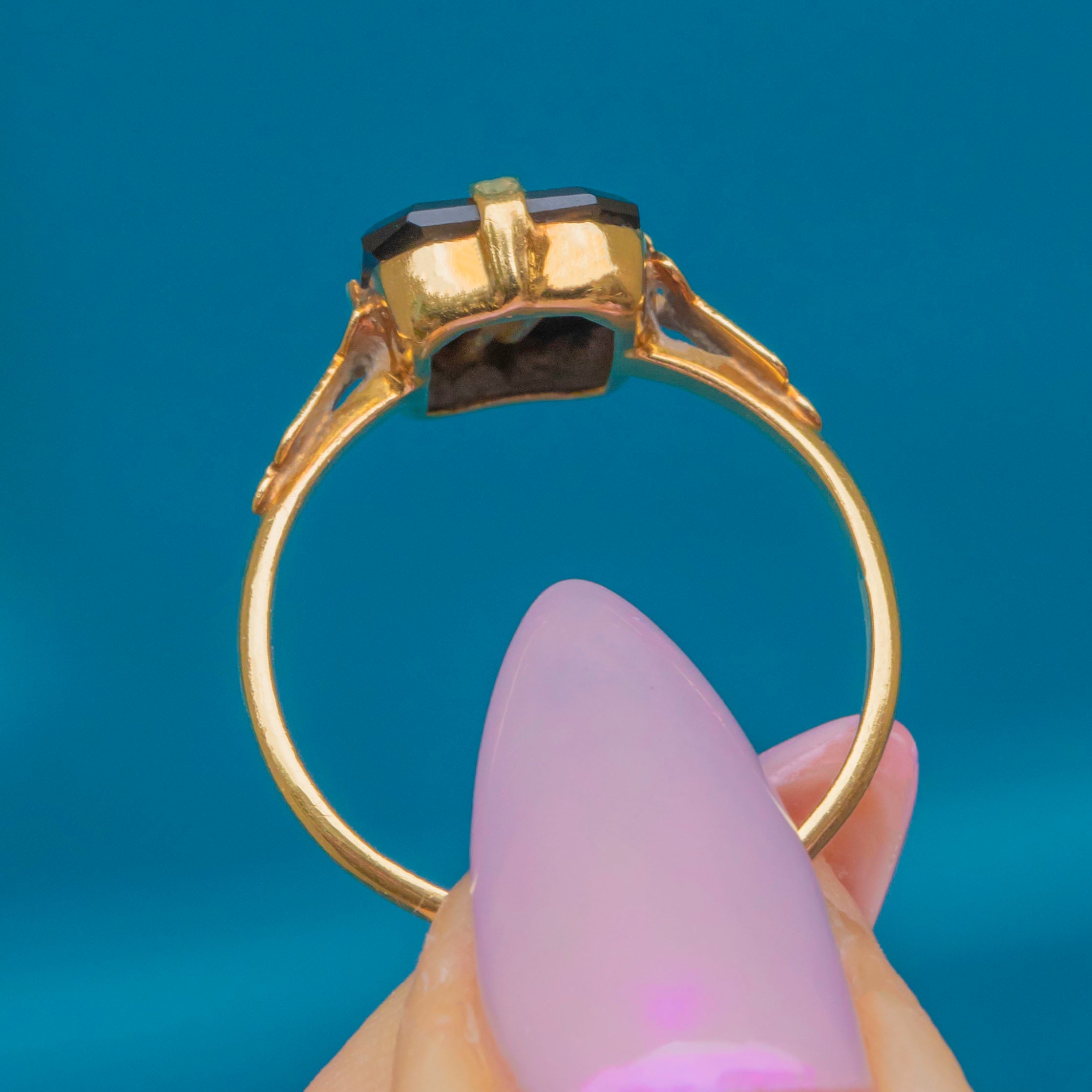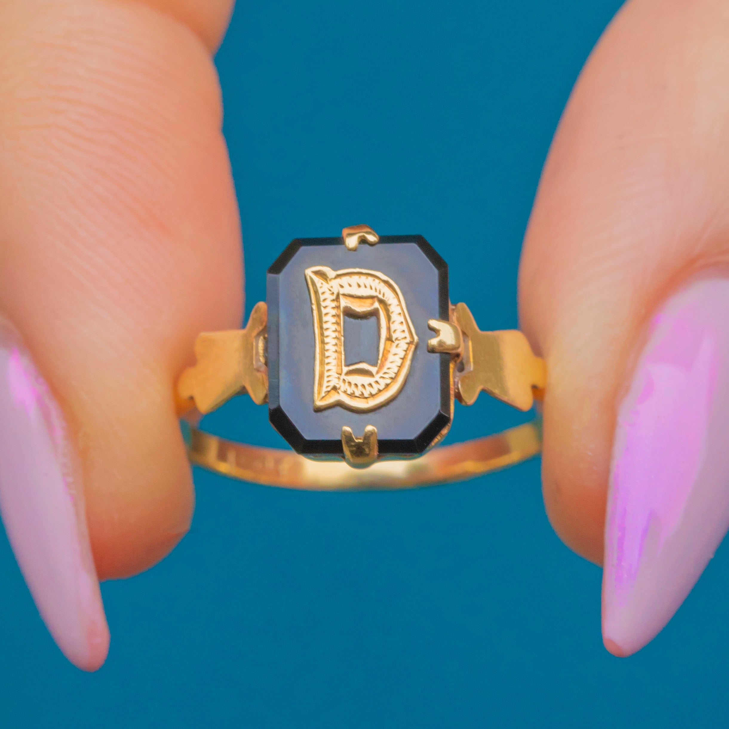 This elegant Victorian mourning ring is crafted in rich 18ct Gold and set with a polished black Onyx panel engraved with the letter “D”. The bold contrast between gleaming Gold and glossy black Onyx is timeless, embodying both sentiment and refinement.