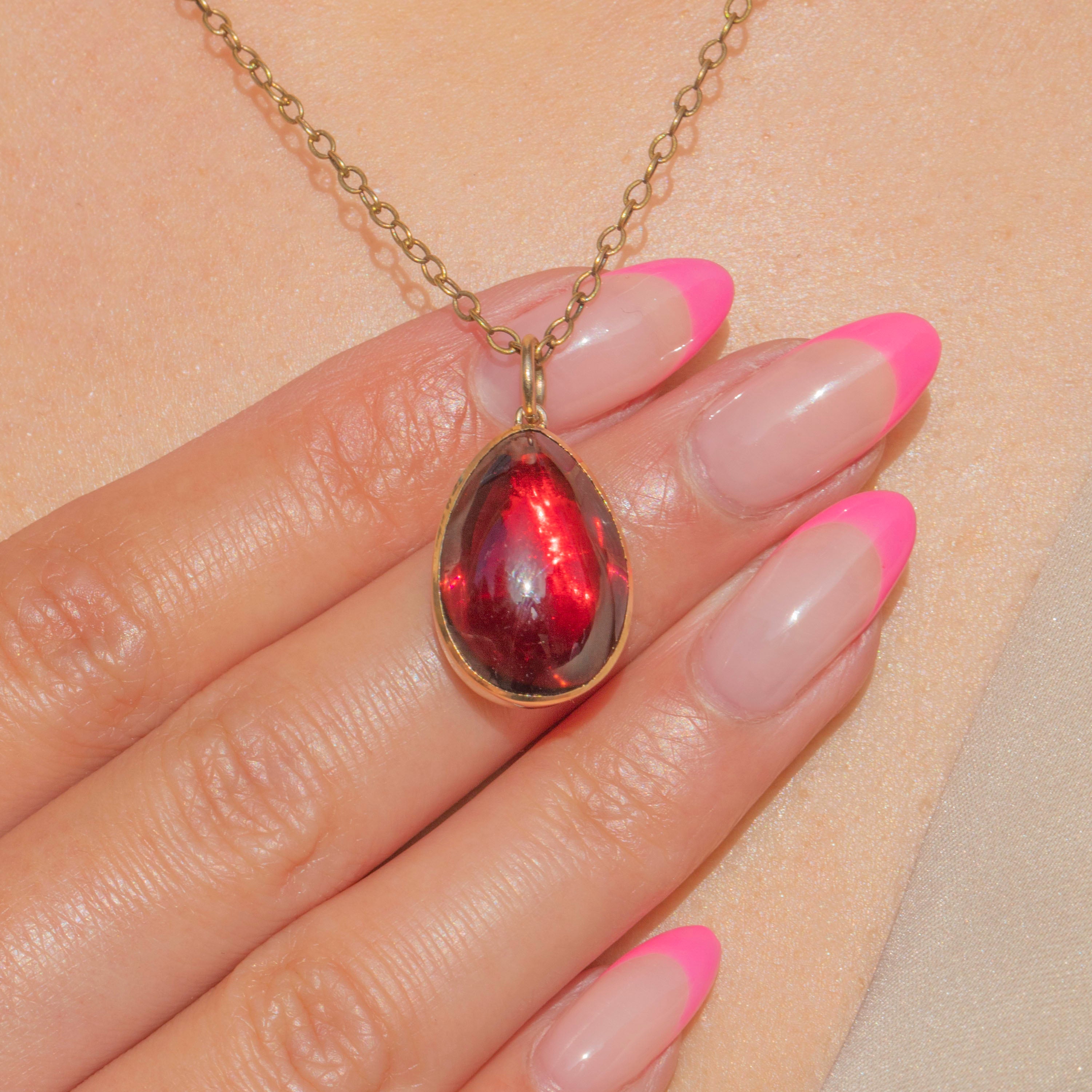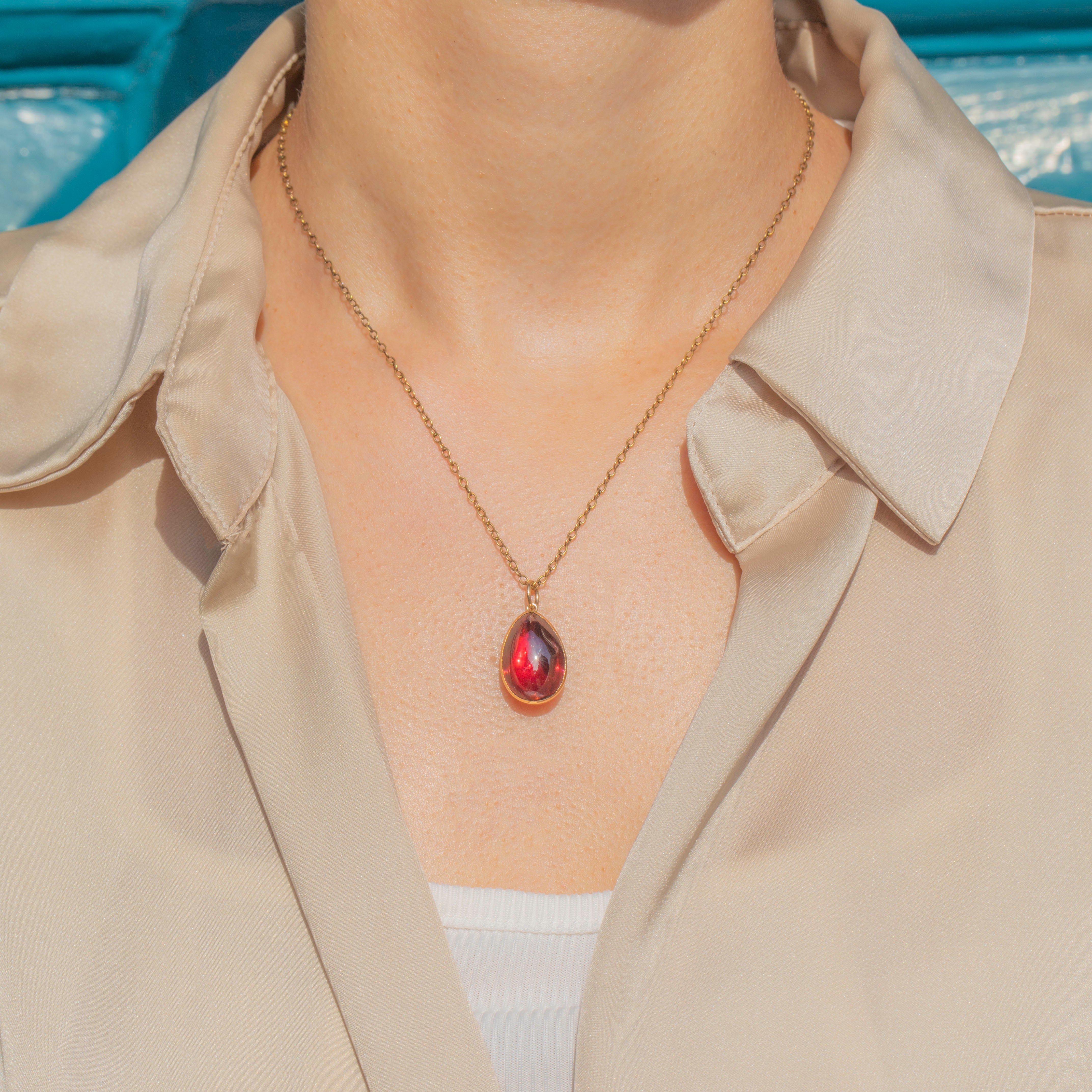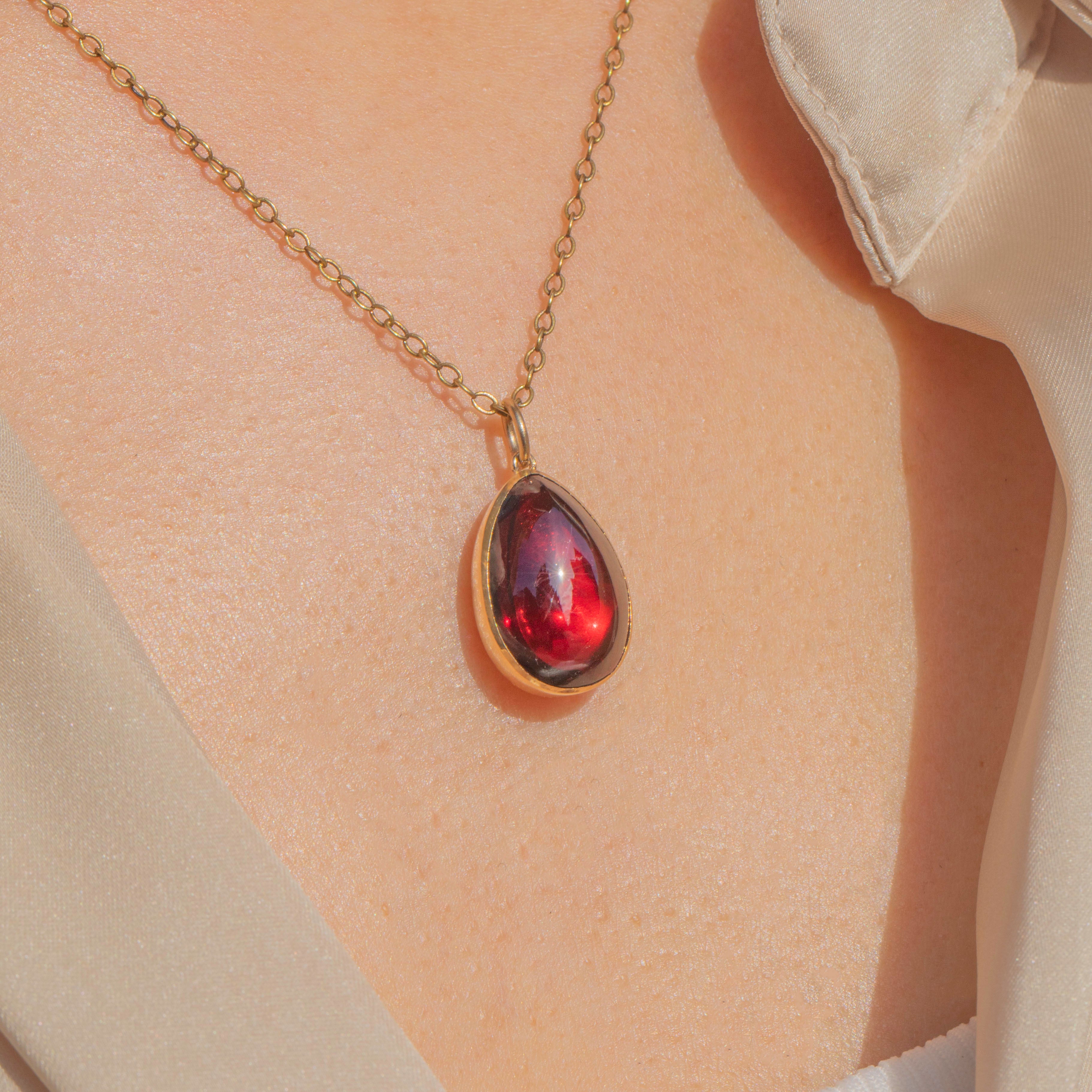 VERY GOOD-EXCELLENT: This antique pear drop 18ct Gold 4.05ct Garnet cabochon pendant is in great condition. Her Garnet is radiant, with only minor surface scratches visible under a loupe. There are some small spots of discolouration to the Gold bezel, though this is expected with age. With a securely soldered jump ring, you can wear this Victorian pendant with ease.