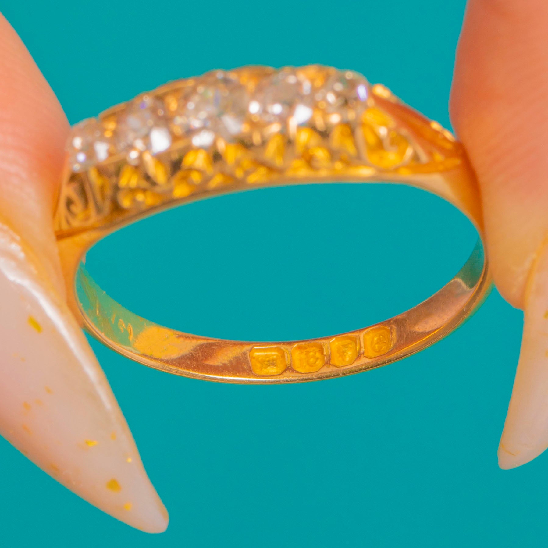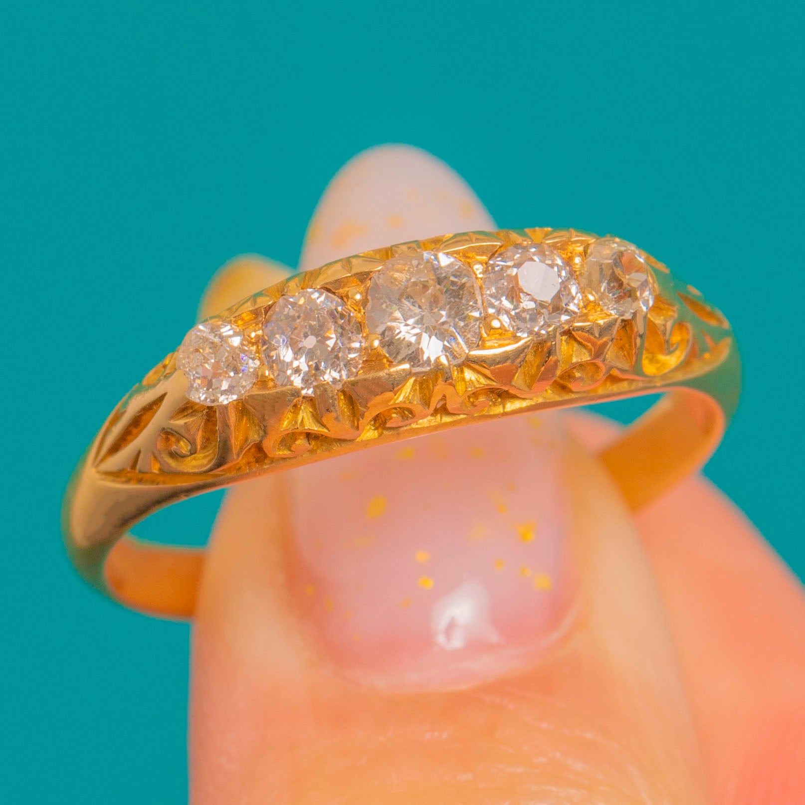 A delicate Victorian five‑stone ring set with graduated old‑mine cut Diamonds in individual collet settings. The low navette top sits above a pierced foliate and scroll gallery, with hand‑cut bright‑cut engraving on the shoulders for an ornate yet restrained finish.