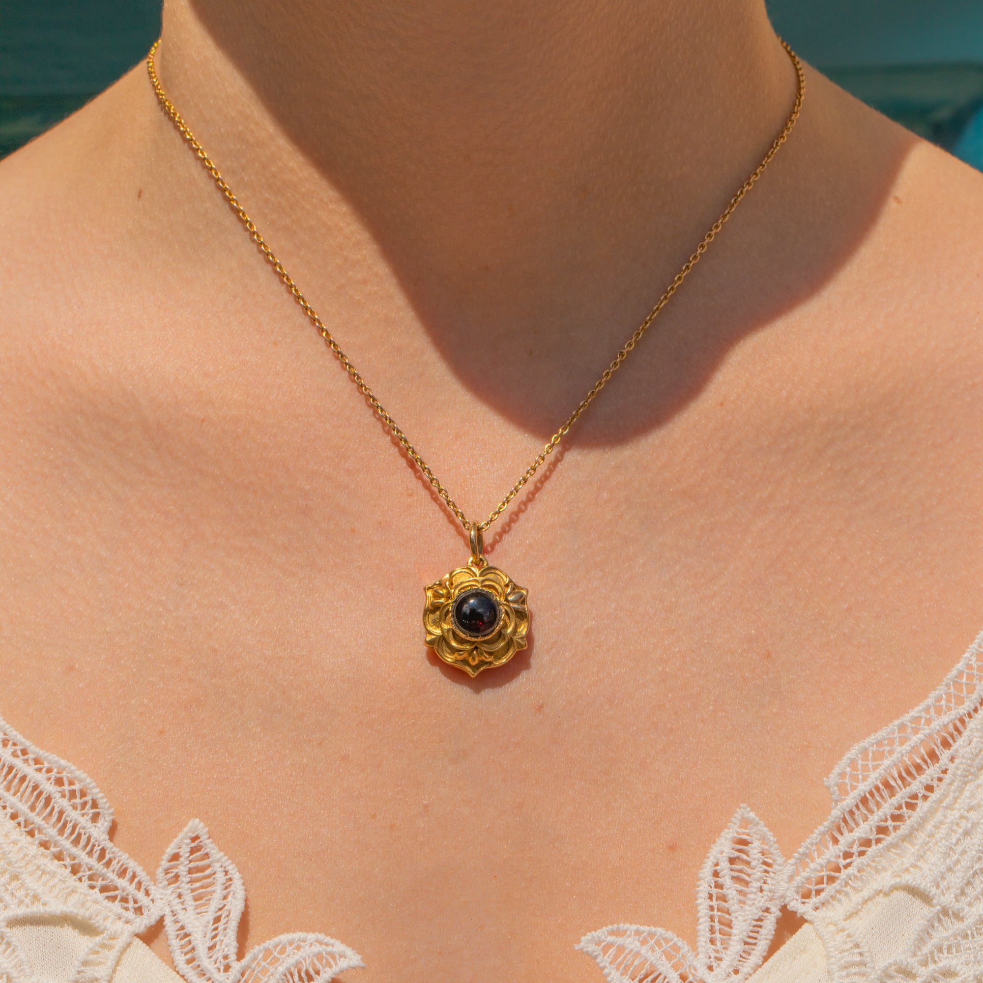 This Victorian 18ct Gold Garnet cabochon rose locket is a true beauty to behold! Inlaid with a wine hued cabochon-cut Garnet, this solid 18ct Gold locket is akin to the Tudor Rose, making this the perfect piece for history enthusiasts.