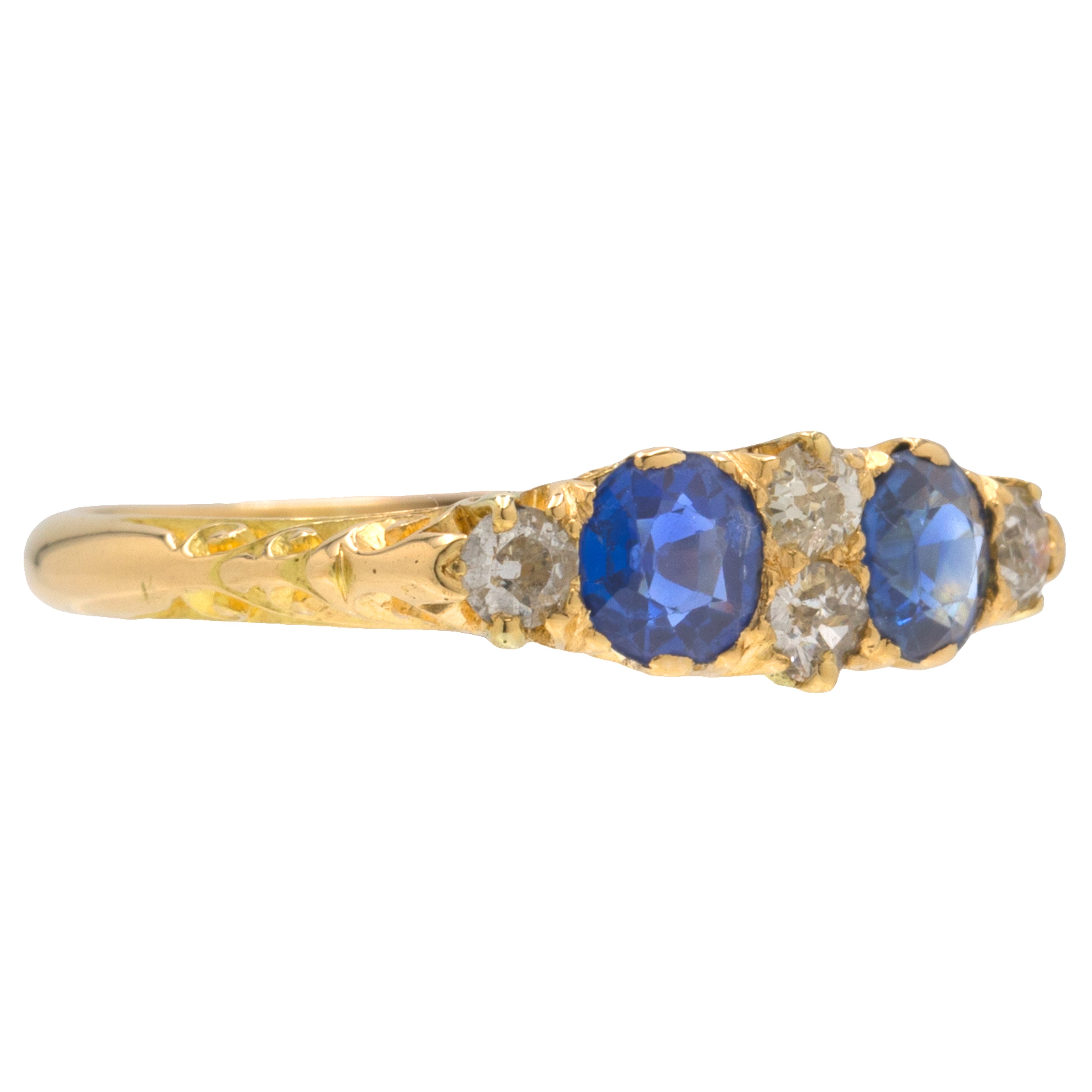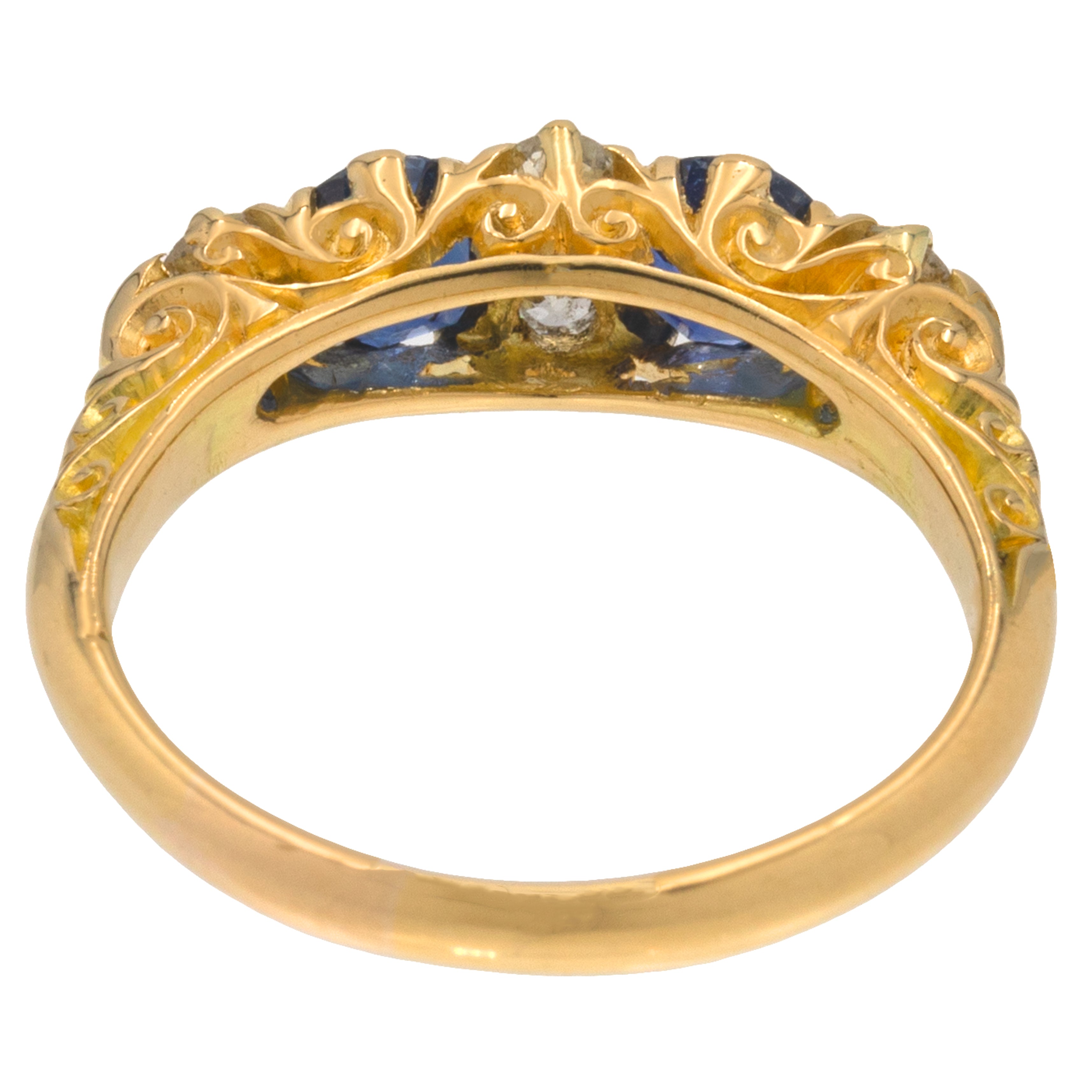 VERY GOOD TO EXCELLENT: We are pleased to present this antique Victorian 18ct Gold natural Sapphire Diamond boat ring in excellent condition. The 18ct Gold is brightly saturated and the engraved details have remained crisp. There is one minor nick to the inside of the band, but this is not noticeable when the ring is being worn. The Sapphires & Diamonds make for a lovely pairing, all free from any chips and securely set. This ring is ready to be cherished for generations to come!
