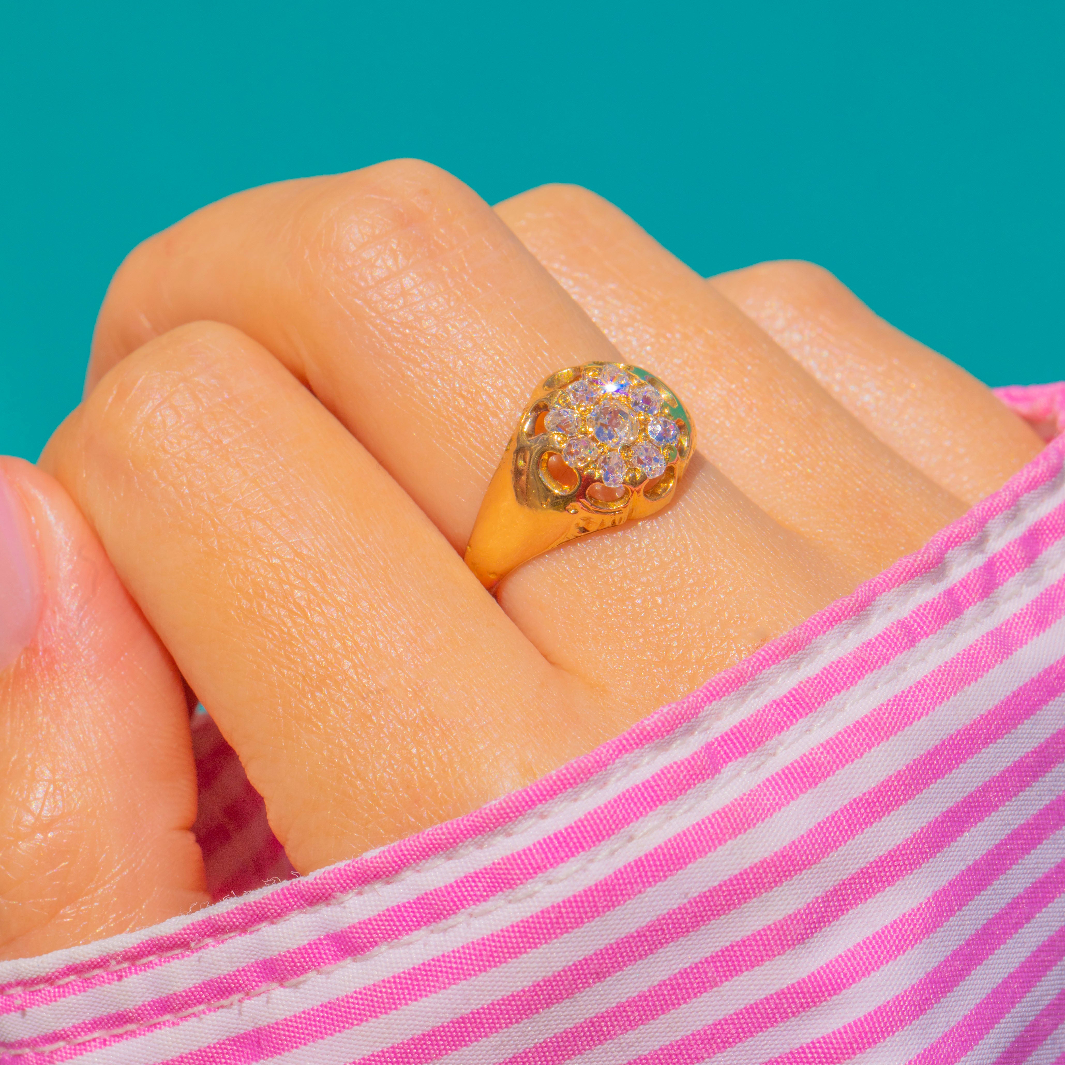 At its heart sits an Old Mine Cut Diamond, encircled by a halo of petite, well-matched Old Mine Cuts for a lively, romantic sparkle. The overall effect is opulent yet refined—classic Victorian craftsmanship with a sumptuous presence and a wonderfully sculptural silhouette in 18ct Gold.