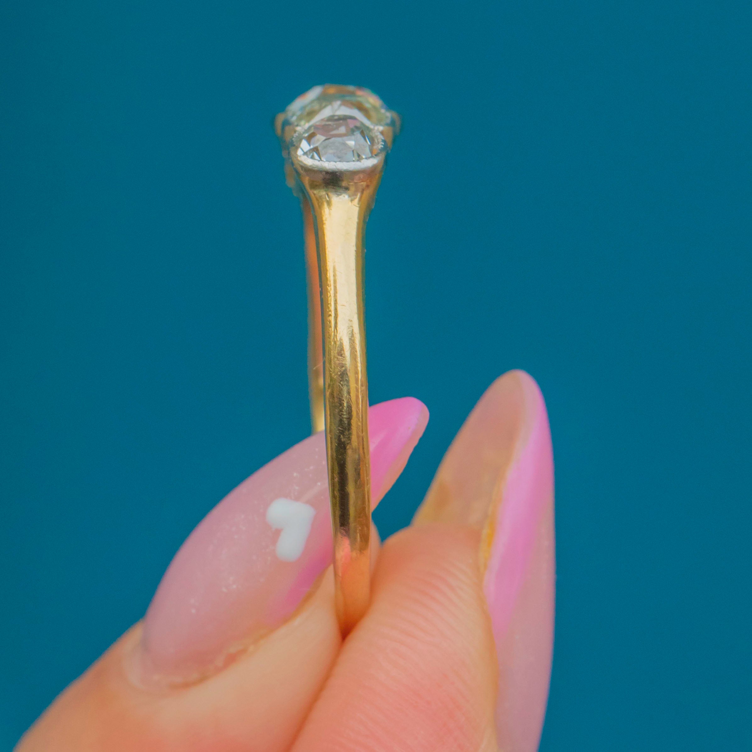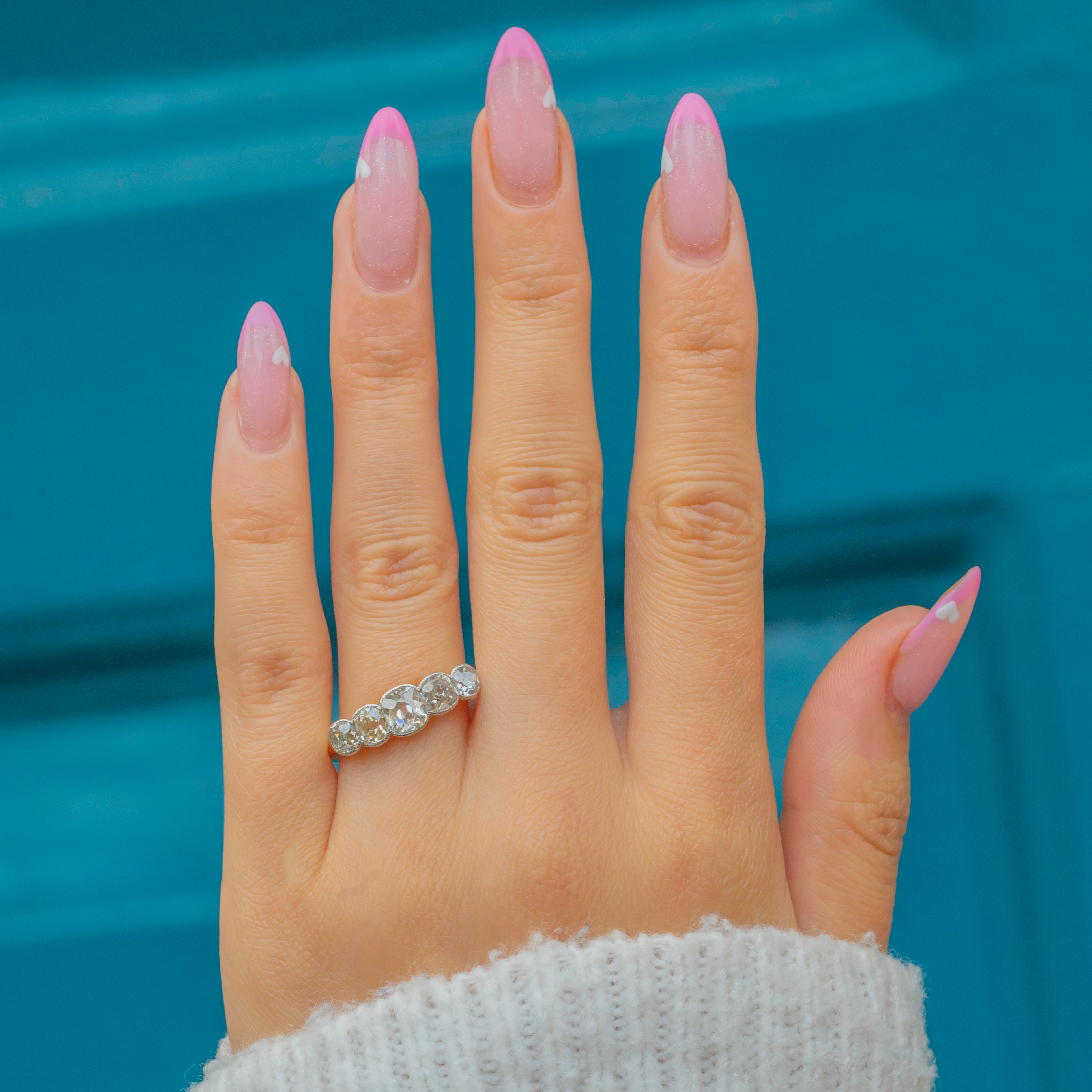 This exceptional Victorian five-stone ring is set with a lively arrangement of Old Mine Cut Diamonds, each full of antique character and brilliance. The Diamonds are set in Platinum over 18ct Gold, their gentle cushion and oval cuts sparkling with warmth and depth typical of 19th-century craftsmanship.