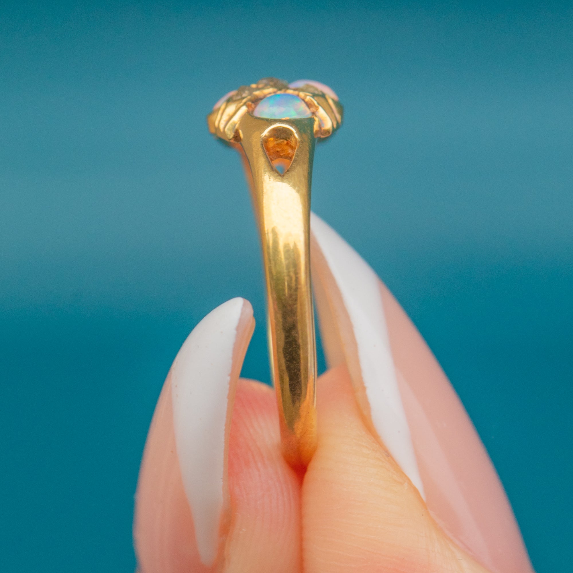 This Antique Victorian ring is crafted in rich 18ct Gold and set with luminous Opals and glittering old-cut Diamonds. The Opals display beautiful play-of-colour, flashing green, orange, and blue, while the Diamonds add a subtle sparkle that enhances the ring’s timeless charm.