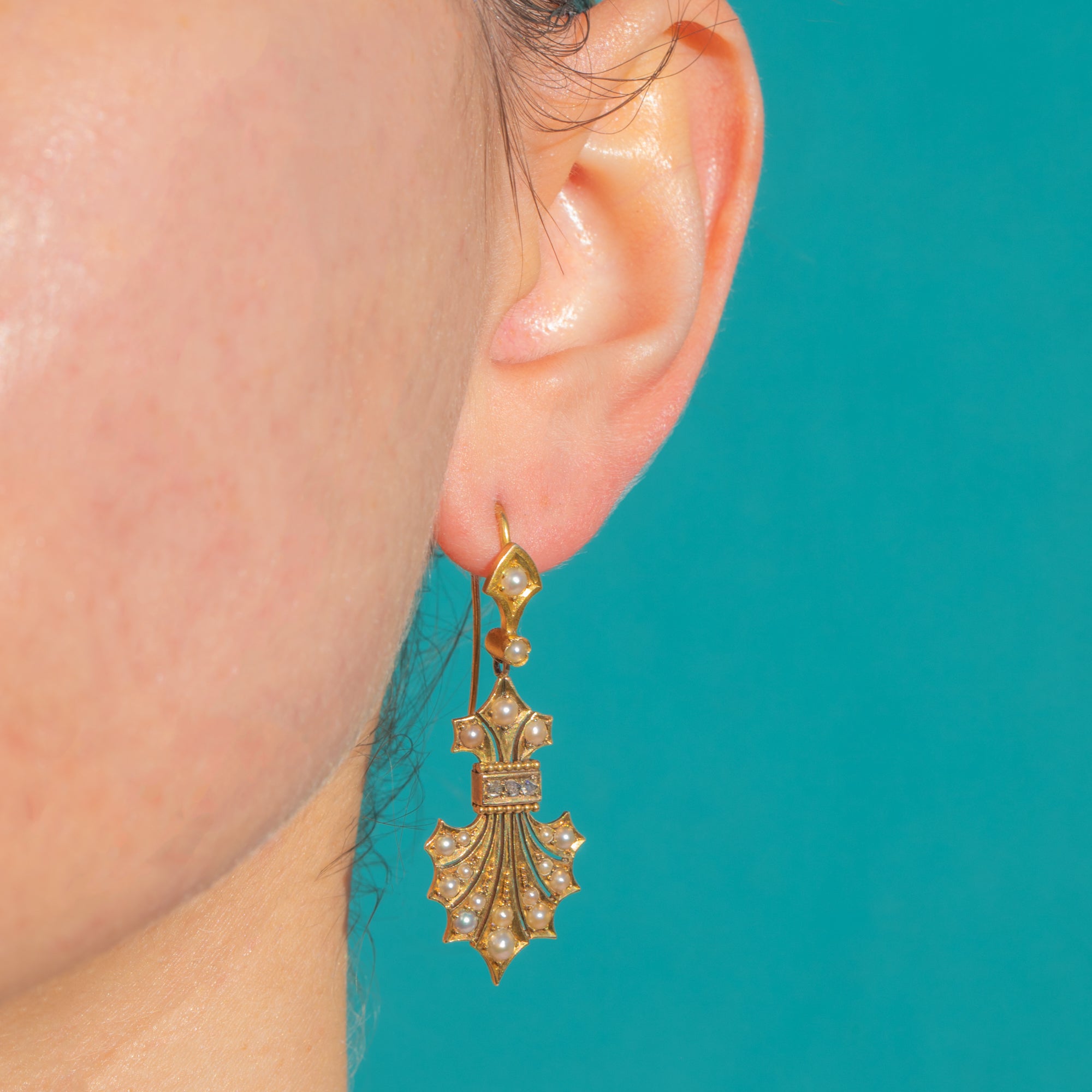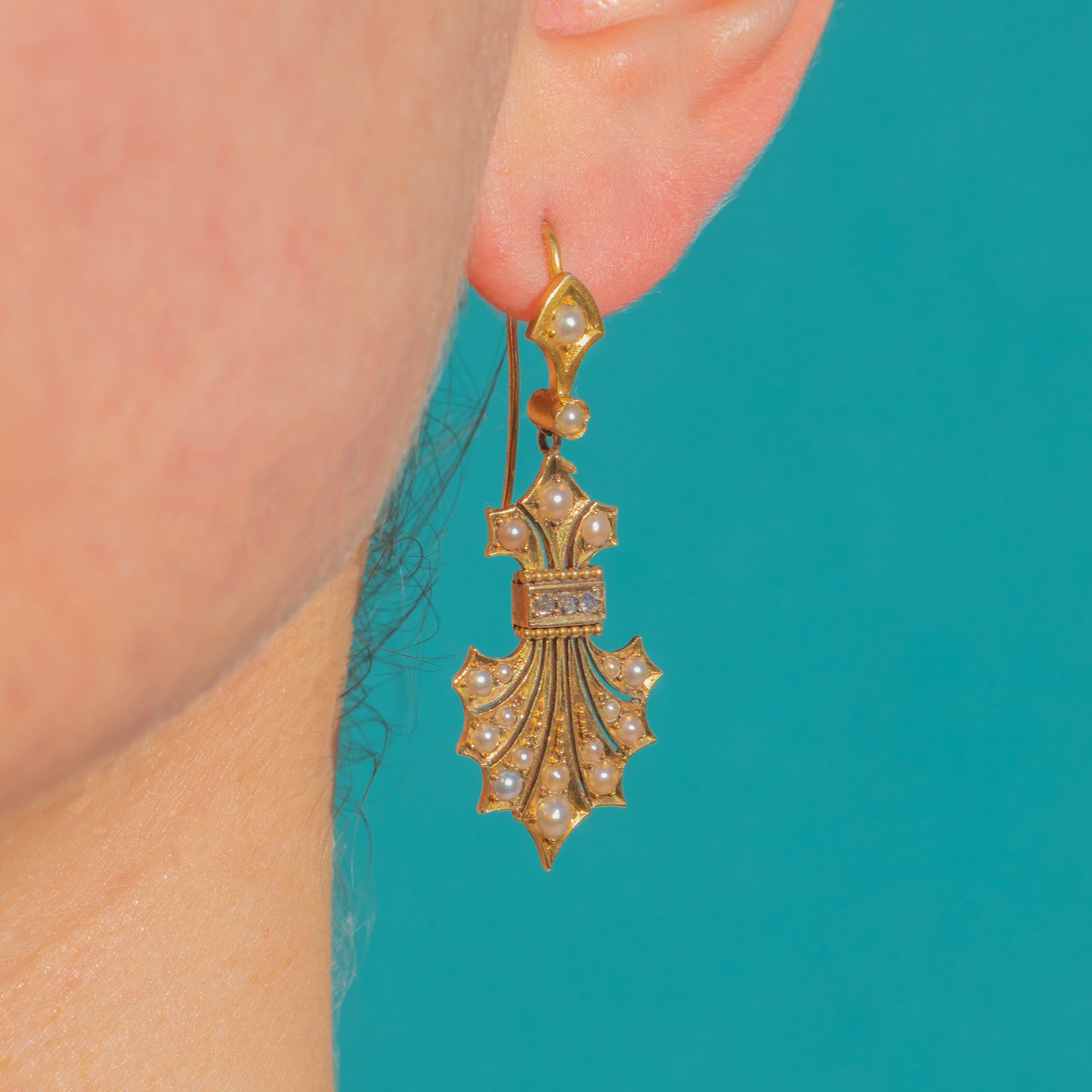 Richly ornate and utterly romantic, these Victorian Fleur de Lis drop earrings are a love letter to historic revival design. Crafted in glowing 18ct Gold, each earring cascades from a petite lozenge into a sculpted palmette fan, the surfaces alive with radiating flutes, beaded borders and delicately applied detail. Petite Pearls are scattered like dewdrops across the Gold, while a slim horizontal bar glints with Diamonds set within a contrasting pale-toned panel for a refined kiss of sparkle.