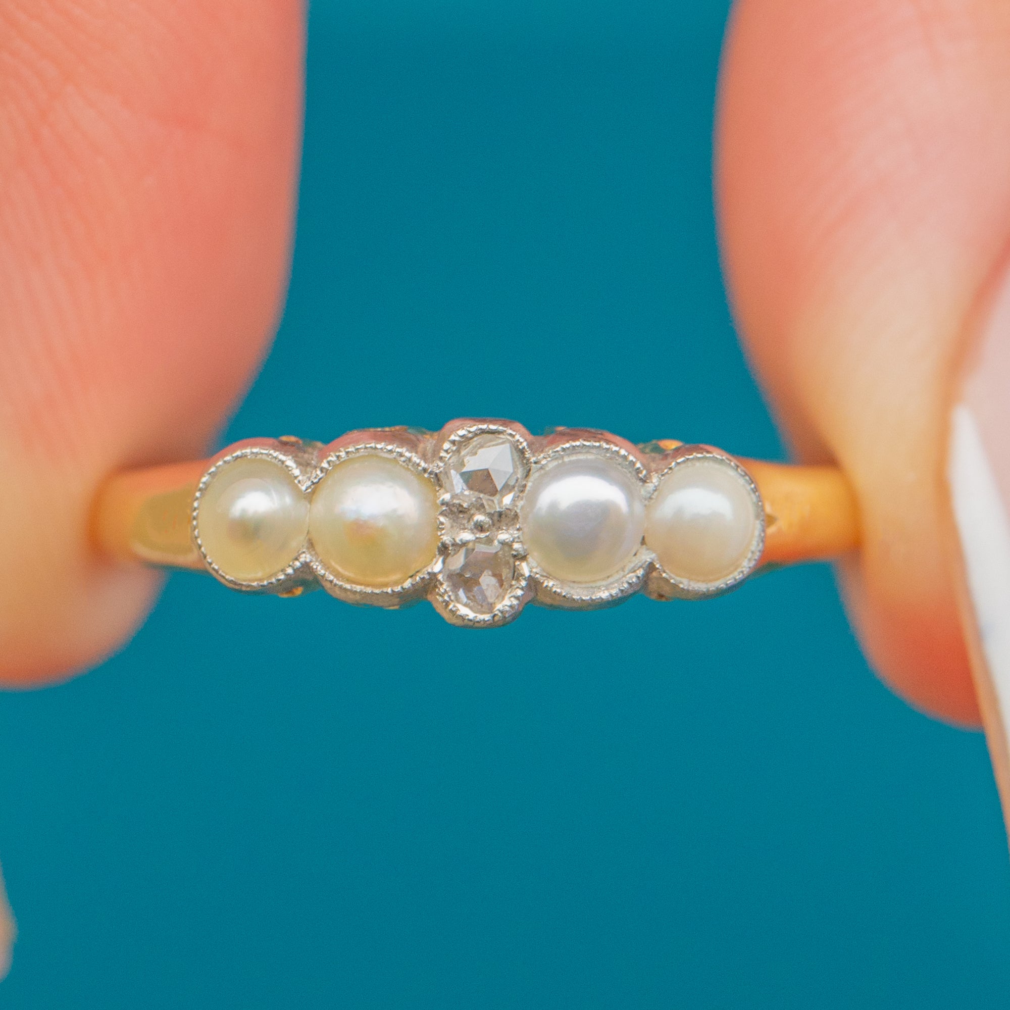 This Victorian ring is crafted in 18ct Gold and set with lustrous Pearls and twinkling rose-cut Diamonds.