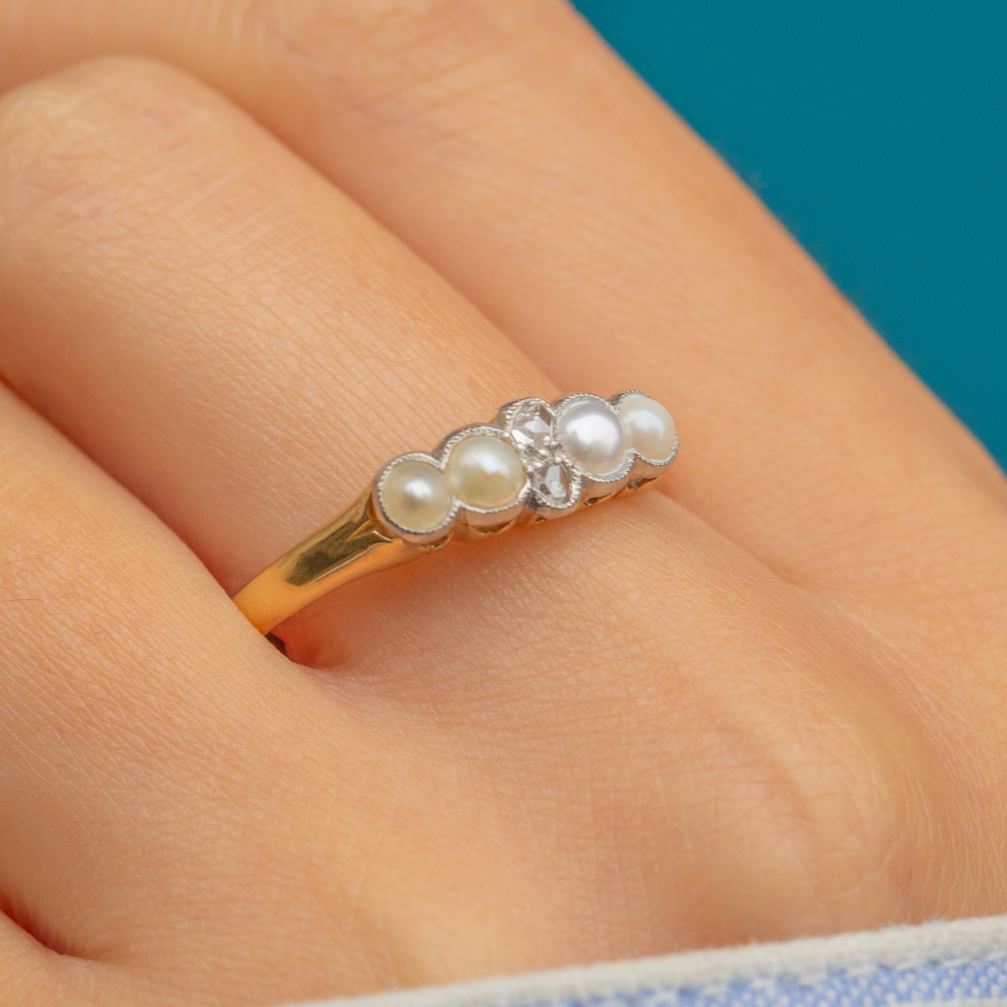 The four Pearls are neatly matched and display a beautiful soft sheen, while the Diamonds add subtle sparkle at the centre. With its romantic design and delicate proportions, this ring is a timeless treasure from the Victorian era.
