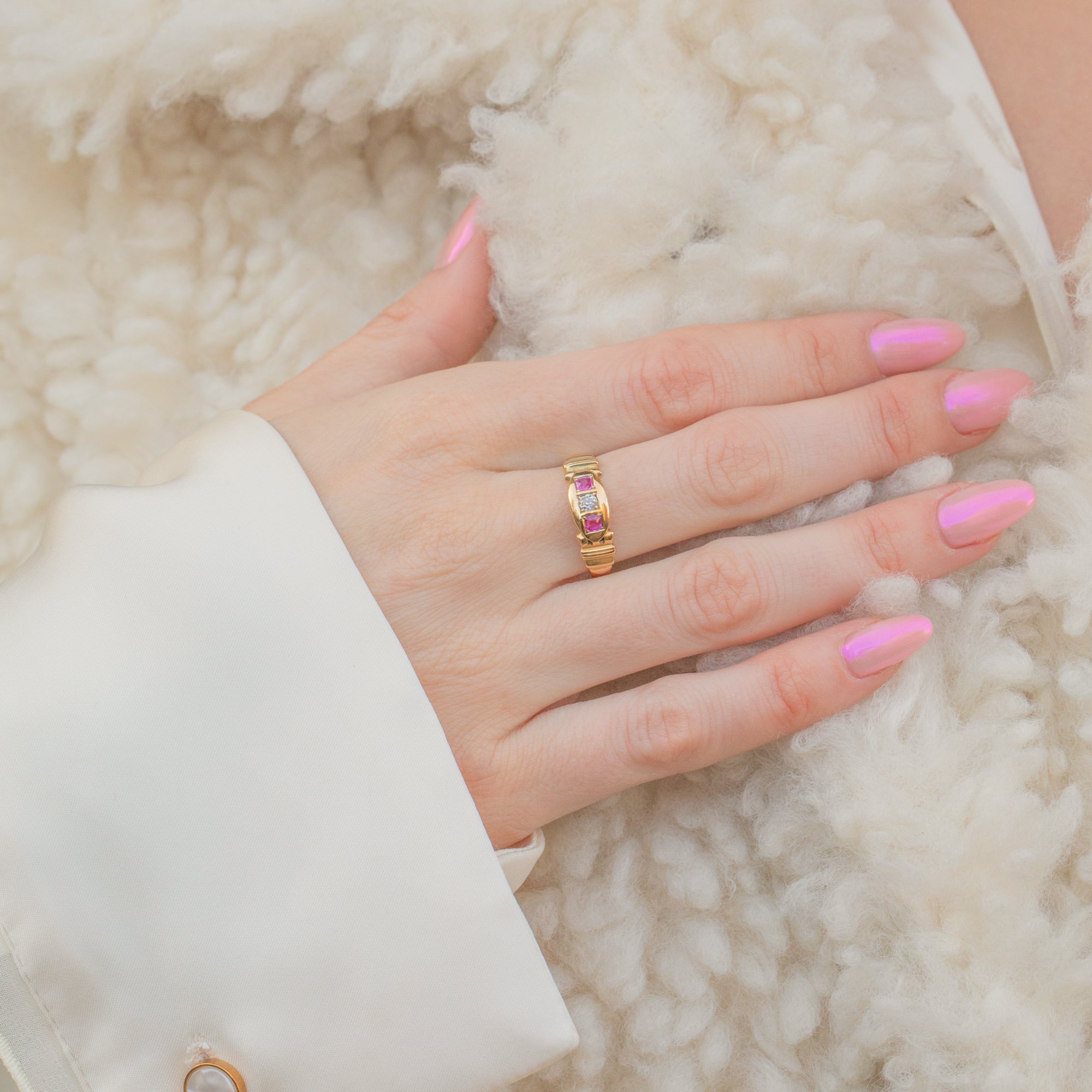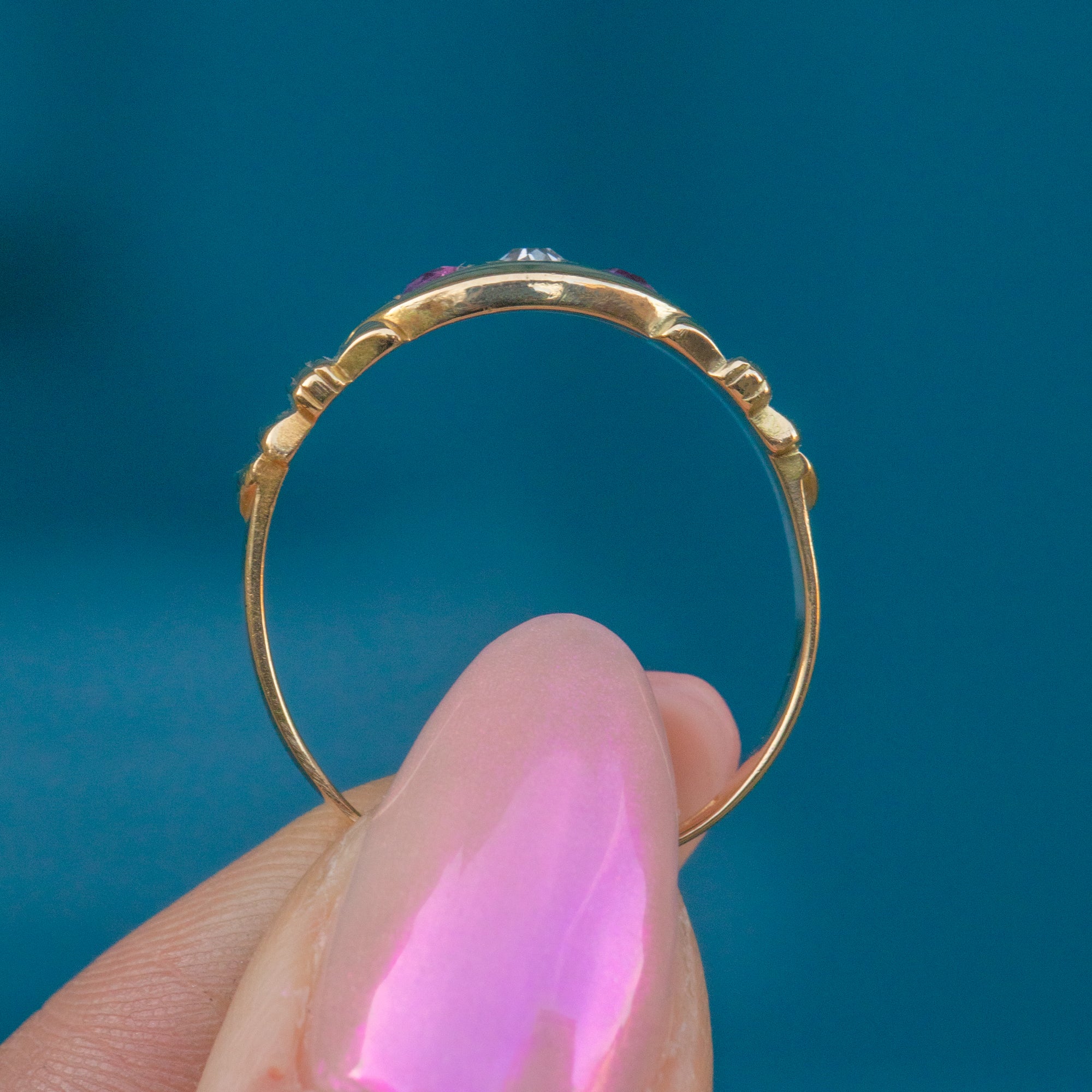VERY GOOD. This Victorian 18ct Gold Pink Sapphire and Diamond gyspy ring is in very good condition. The gemstones are securely set with only some minor surface wear, which is only visible under close inspection. Her 18ct Gold band is robust and aside from one or two scratches, is in excellent condition. The Gold is buttery and the hallmarks are crisp and clear, allowing us to accurately date this piece to 1882.