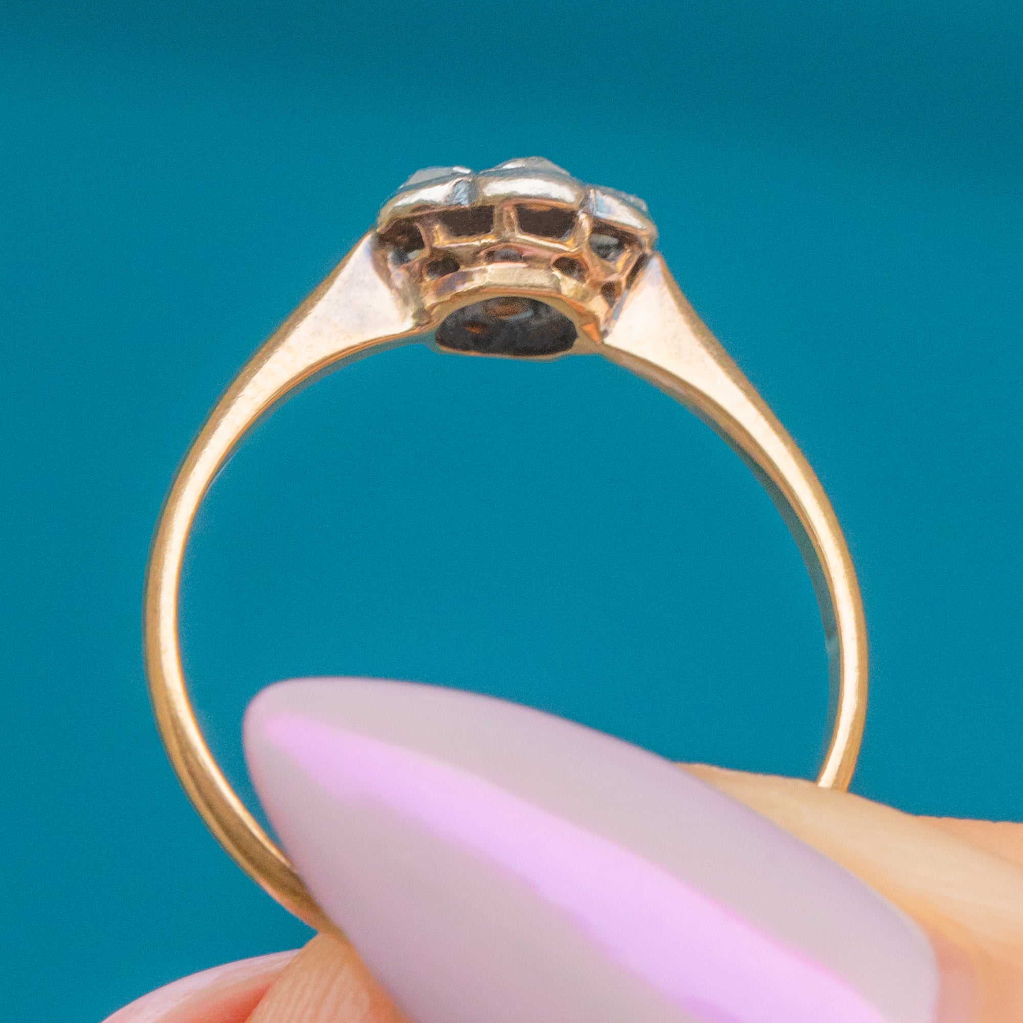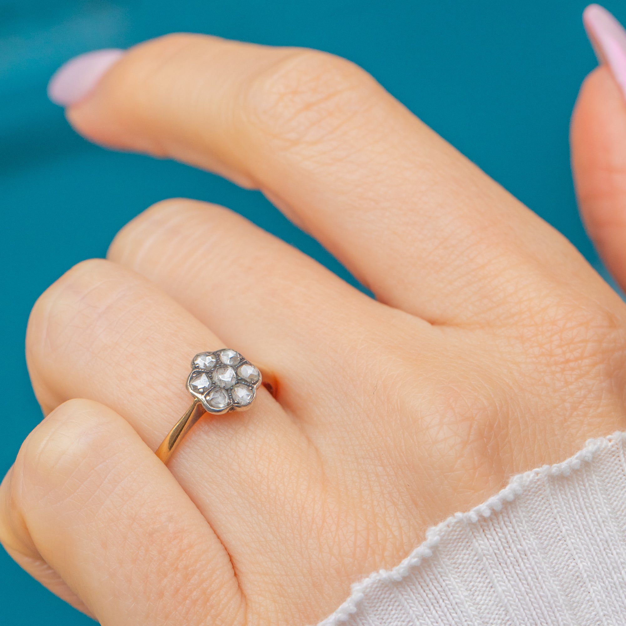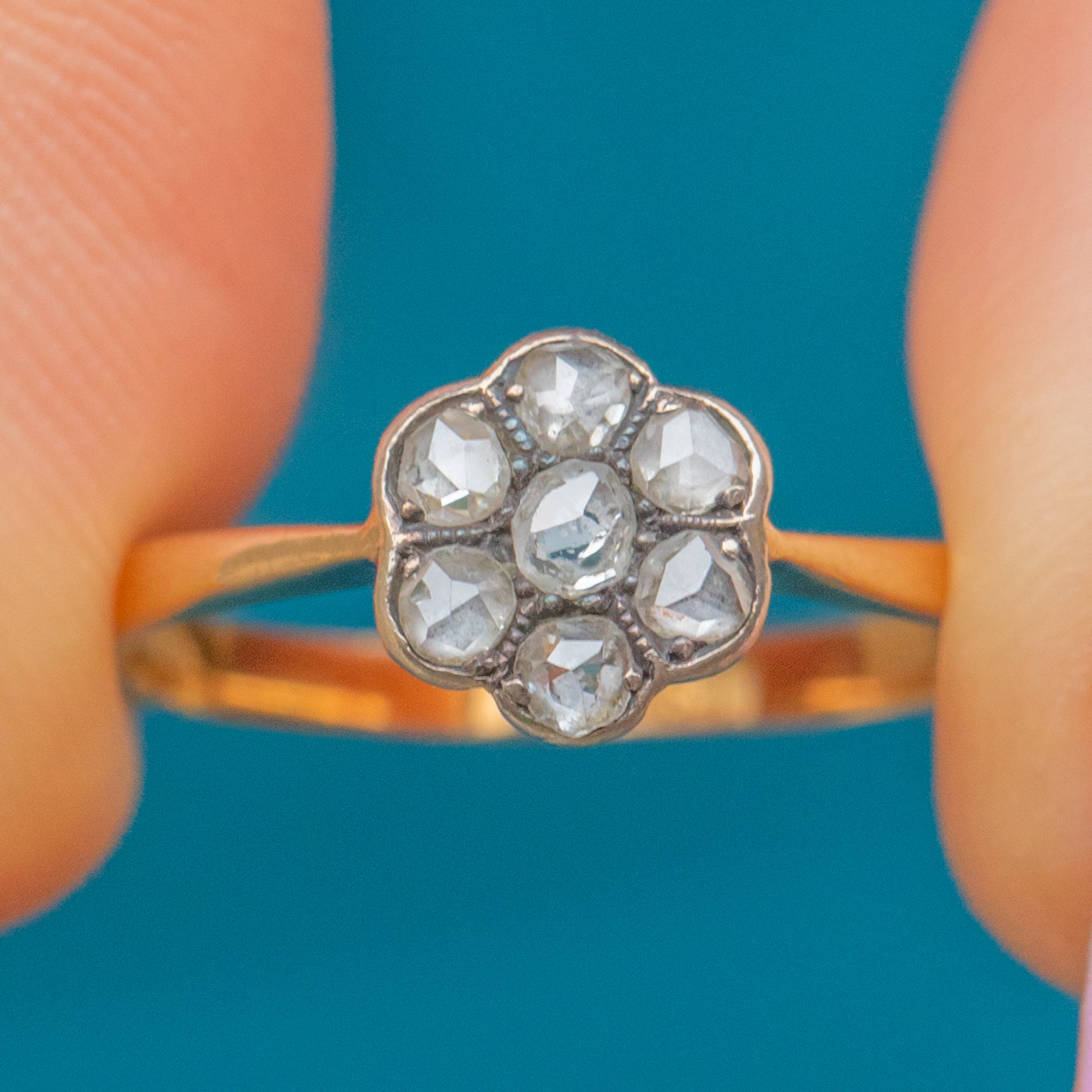 A charmingly twinkly Victorian Daisy cluster ring featuring beautifully cut Rose Diamonds arranged in a delicate floral formation, set in 18ct Gold. Each Diamond catches the light with a soft, antique sparkle that’s uniquely romantic, their glow enhanced by the warmth of the 18ct Gold band.