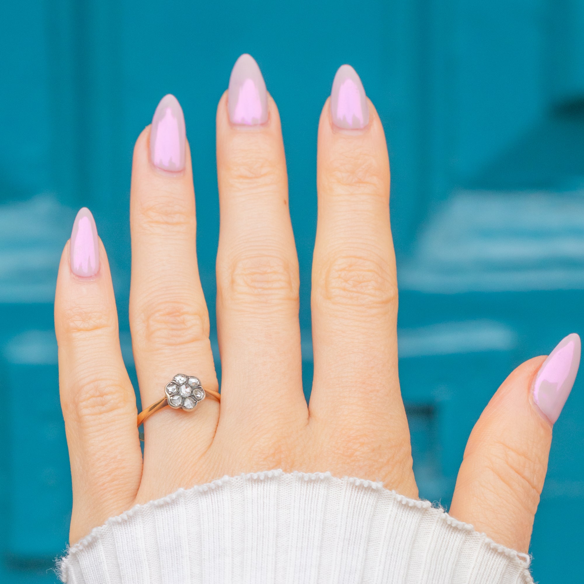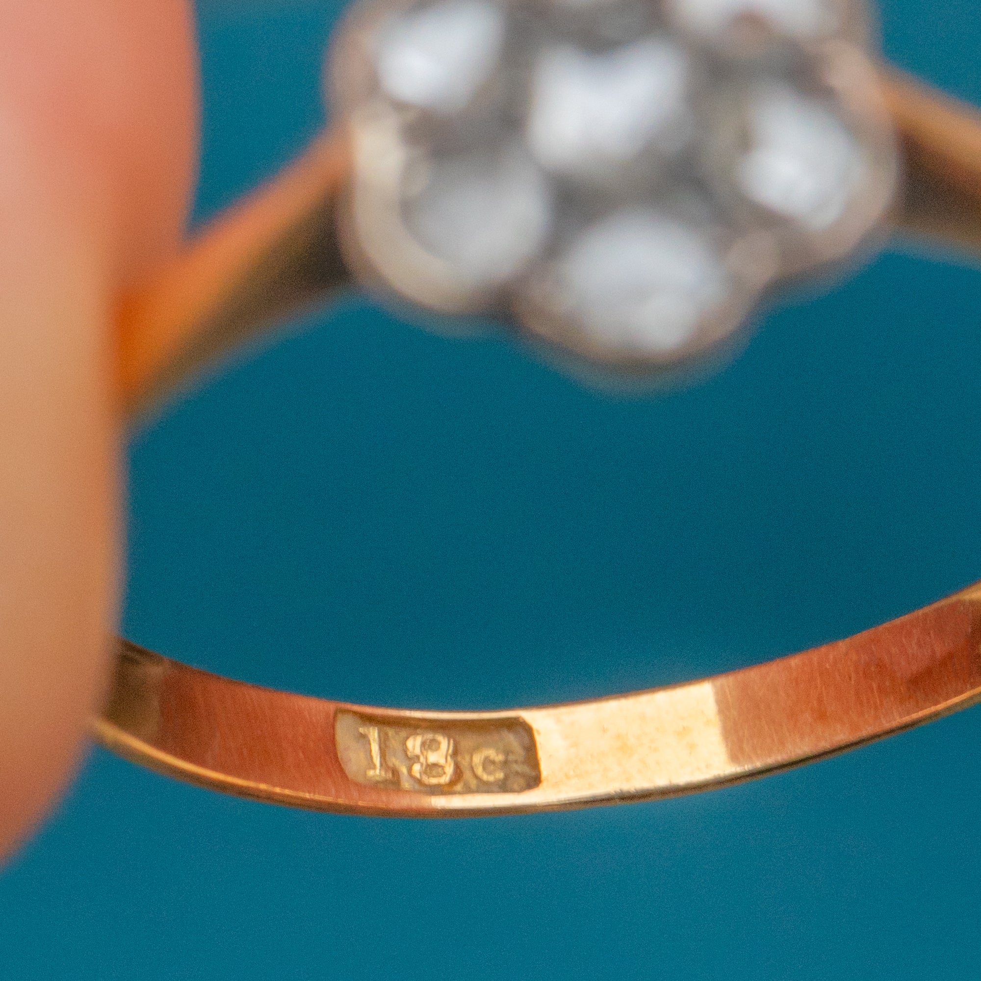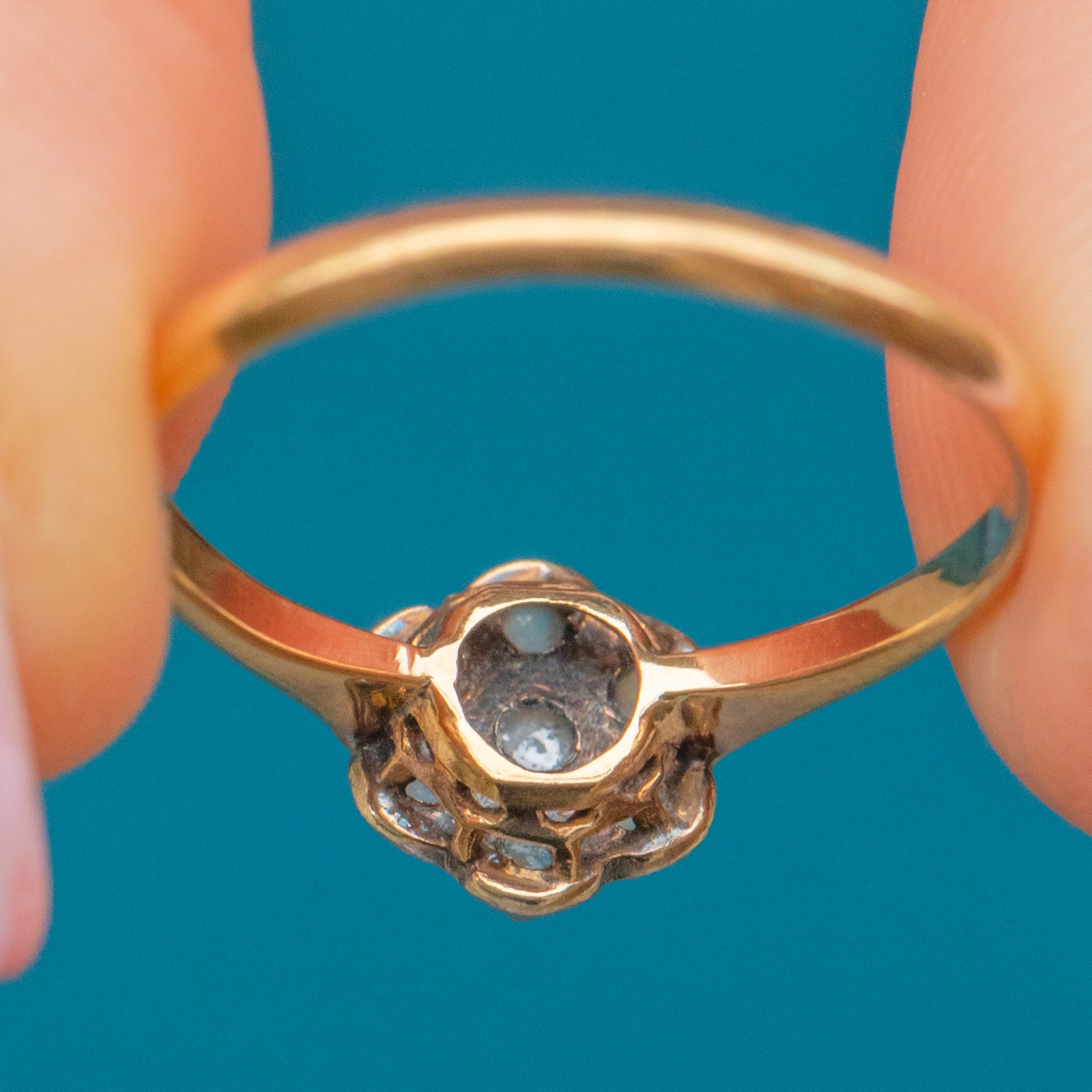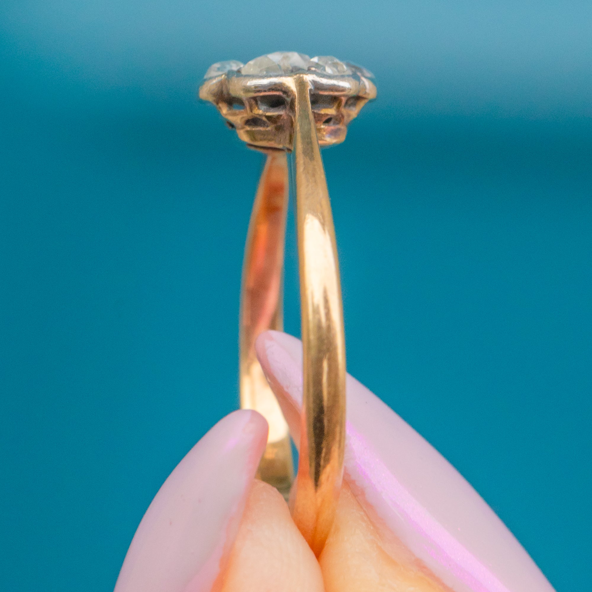 A charmingly twinkly Victorian Daisy cluster ring featuring beautifully cut Rose Diamonds arranged in a delicate floral formation, set in 18ct Gold. Each Diamond catches the light with a soft, antique sparkle that’s uniquely romantic, their glow enhanced by the warmth of the 18ct Gold band.