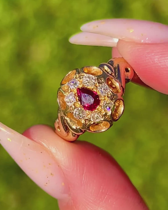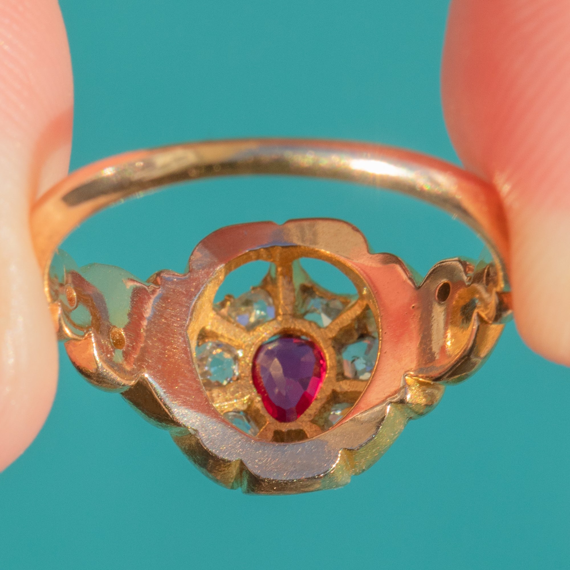 Victorian 18ct Gold Natural Ruby Pear Diamond Cluster Ring