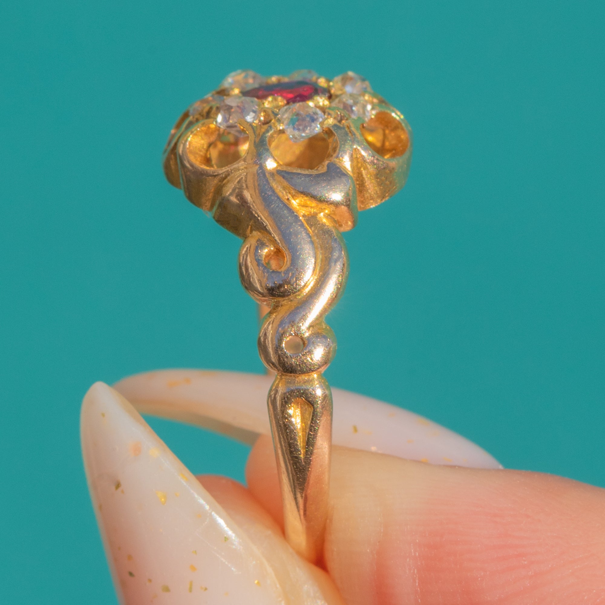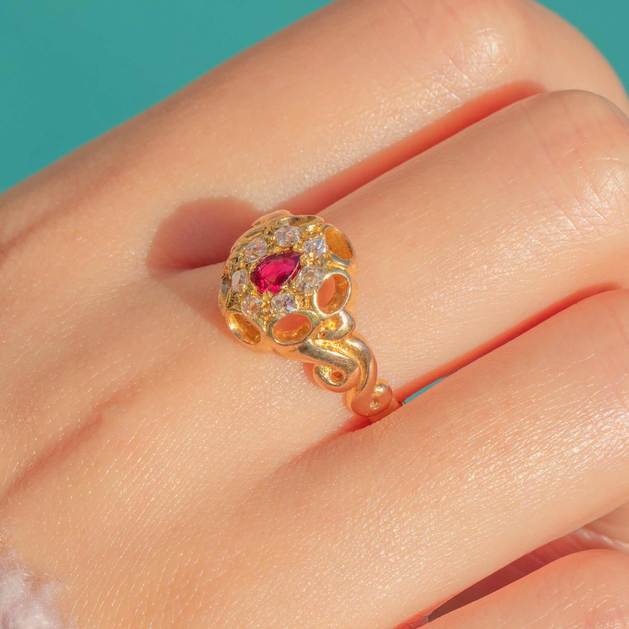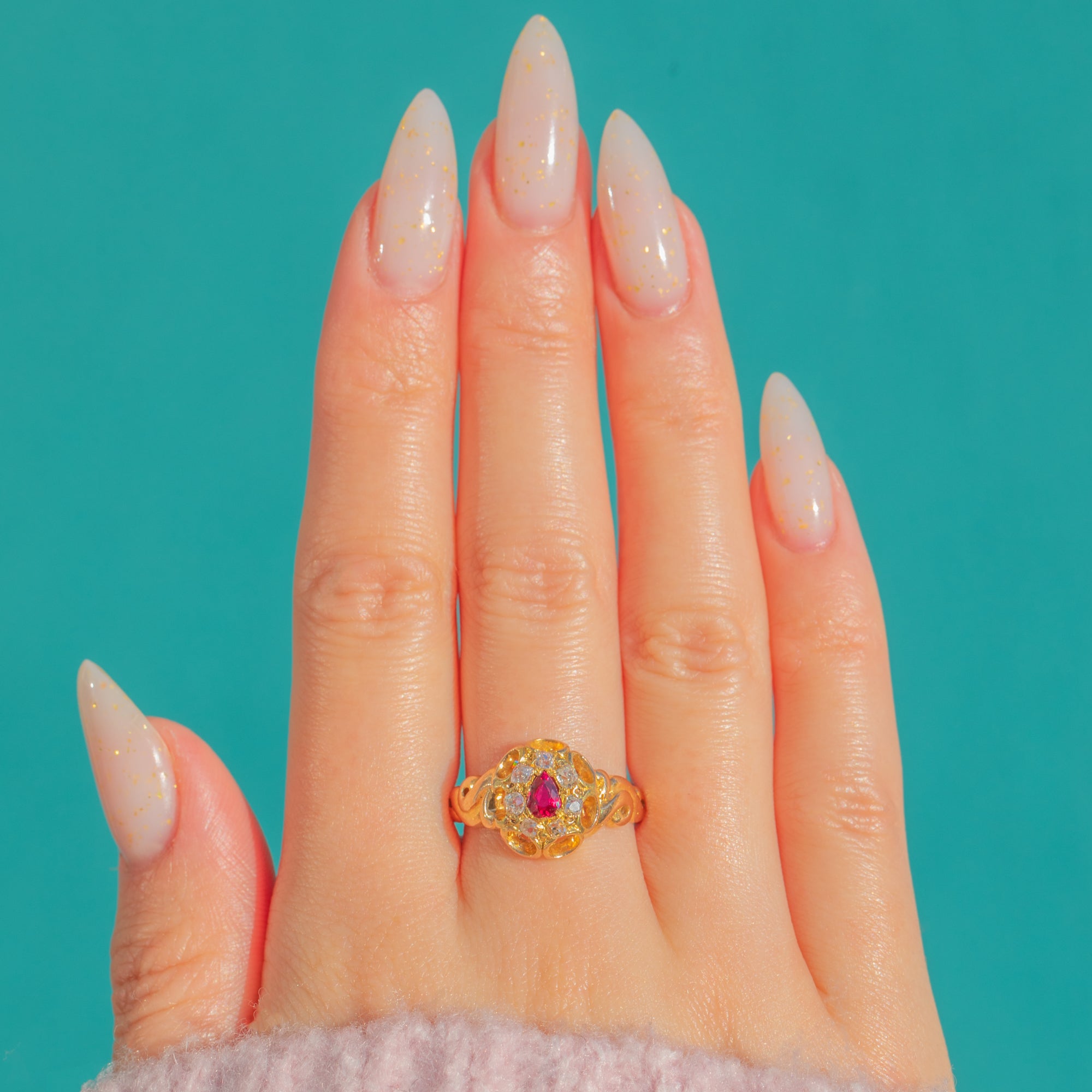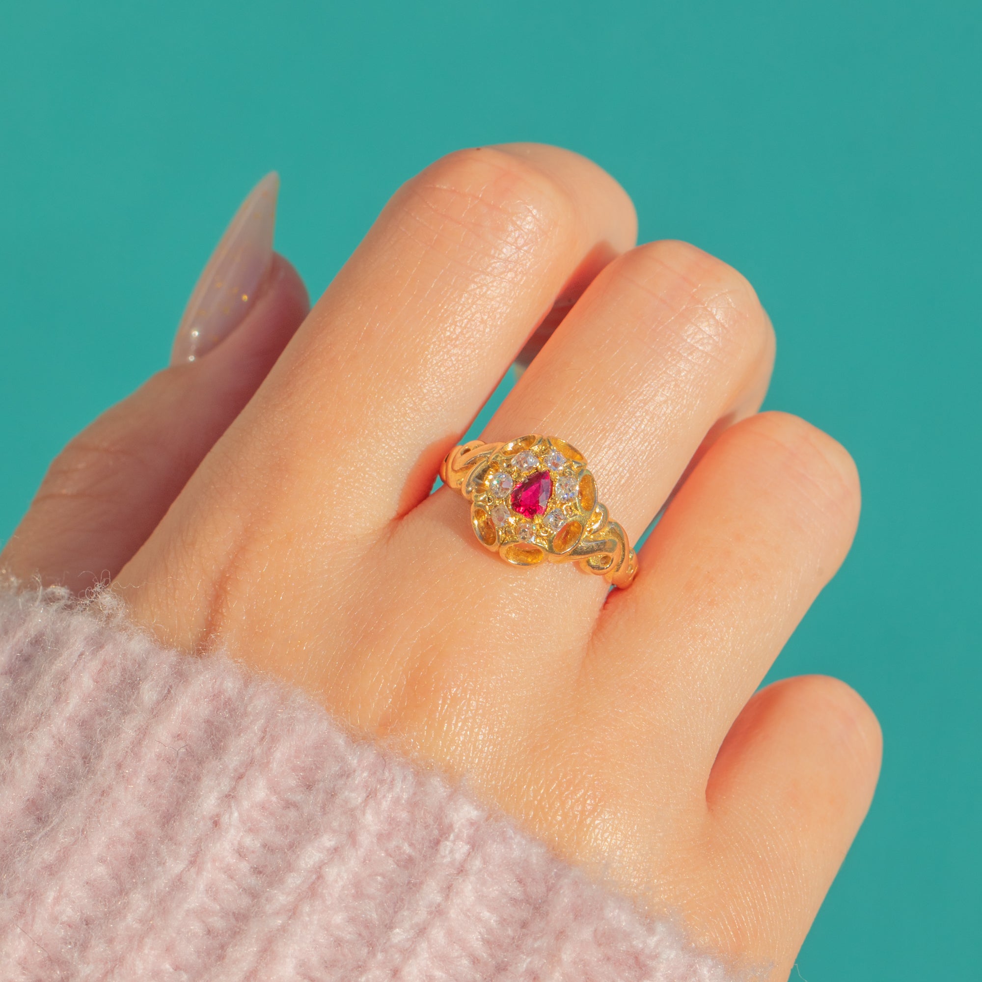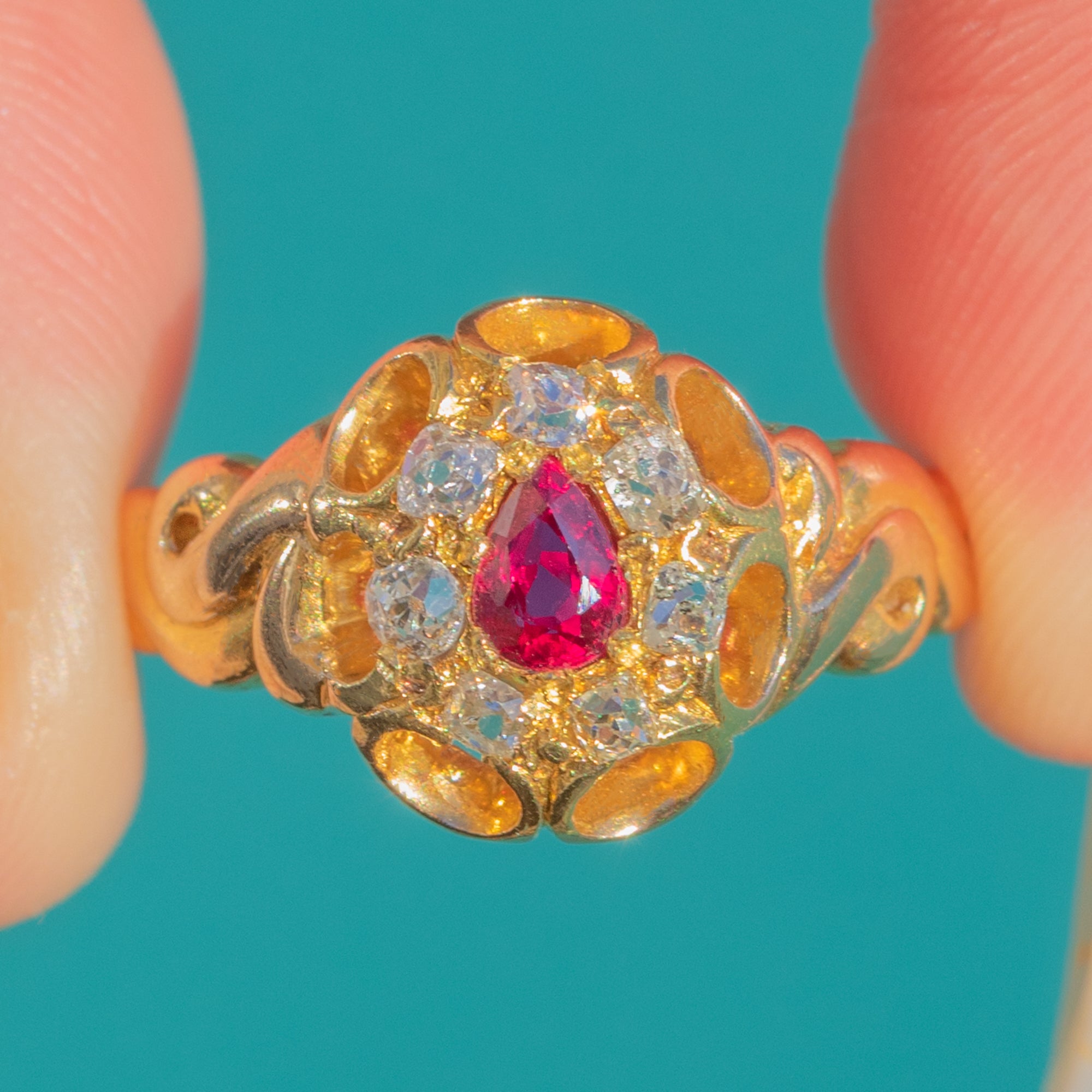 A romantic Victorian cluster that glows with warmth and history, this 18ct Gold ring showcases a vivid pear-cut 0.20ct Ruby embraced by a halo of twinkling Old Mine Cut Diamonds.