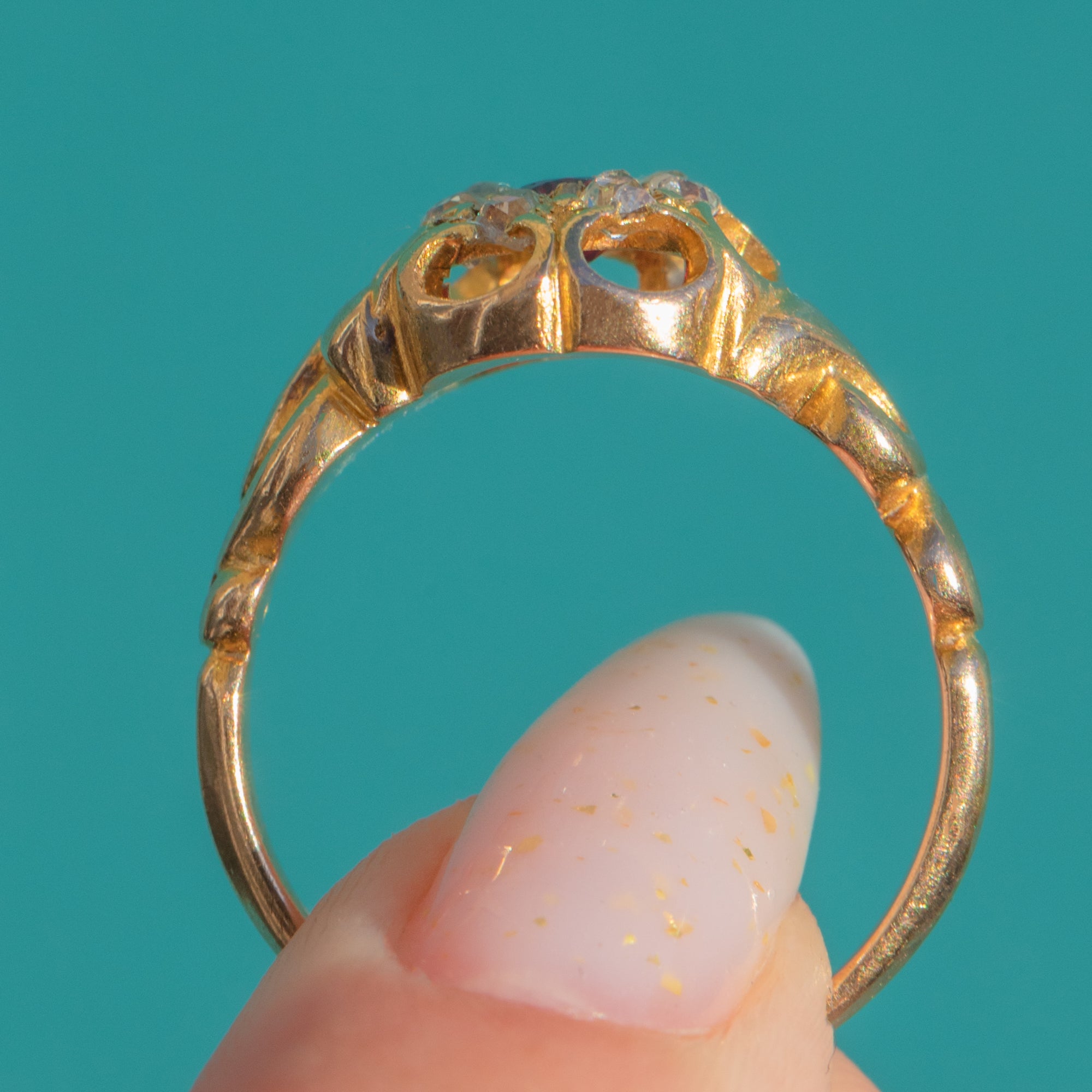 EXCELLENT: The gemstones are bright and well-matched, with no obvious chips or abrasions, and all are securely set. The Gold shows light, even surface wear and a gentle patina commensurate with age; beads/prongs and the pierced gallery are intact and well-preserved. The shank is strong with no visible signs of repair or resizing.