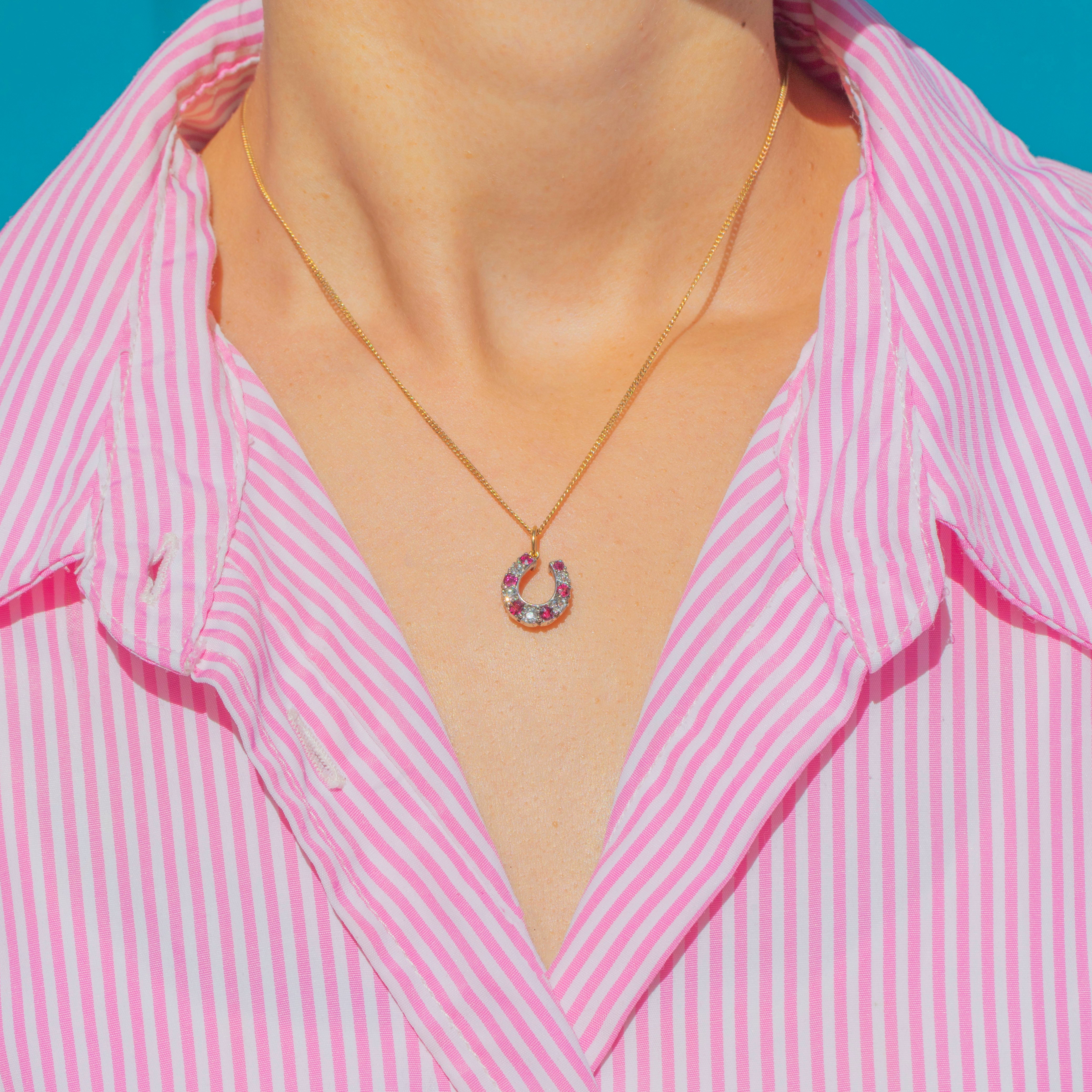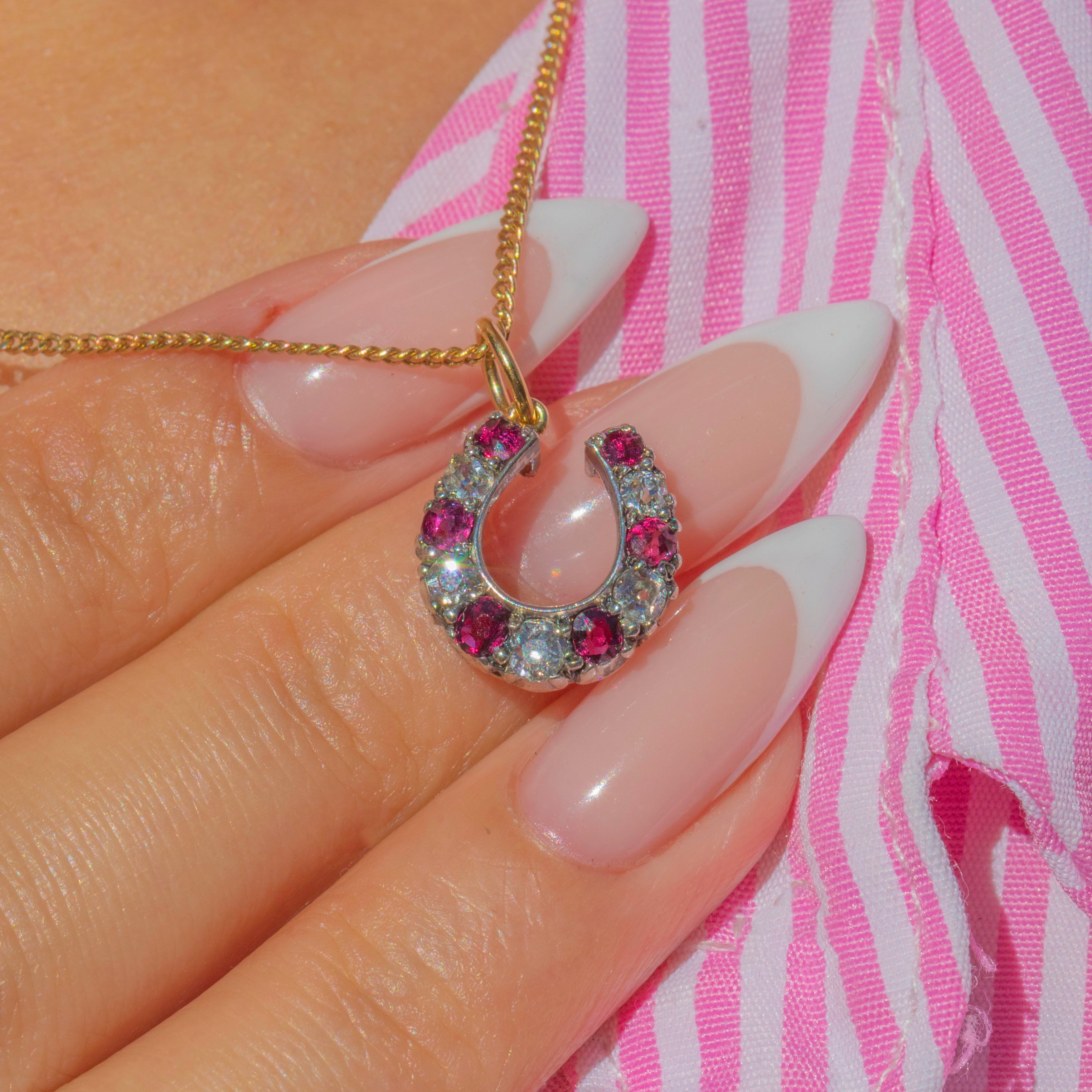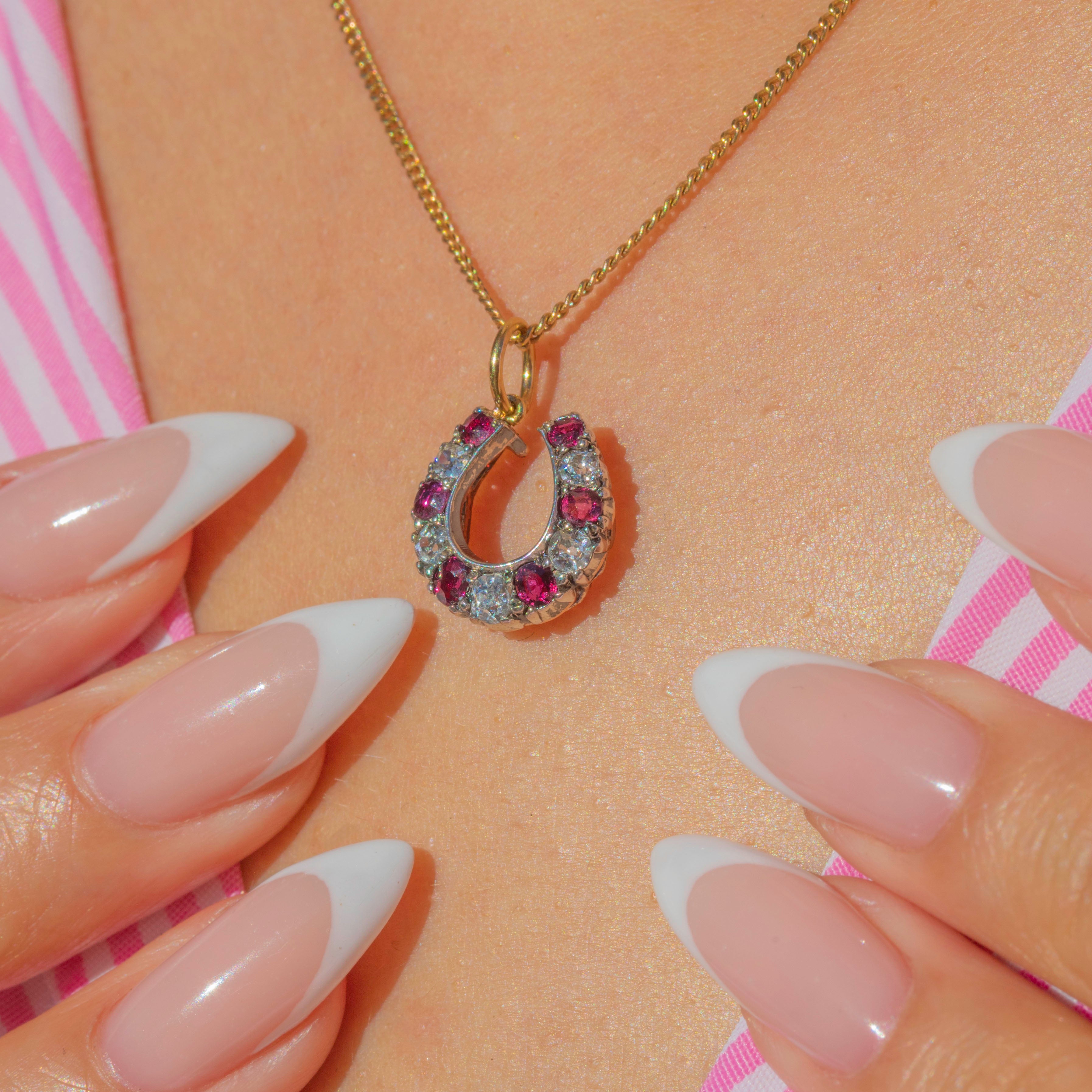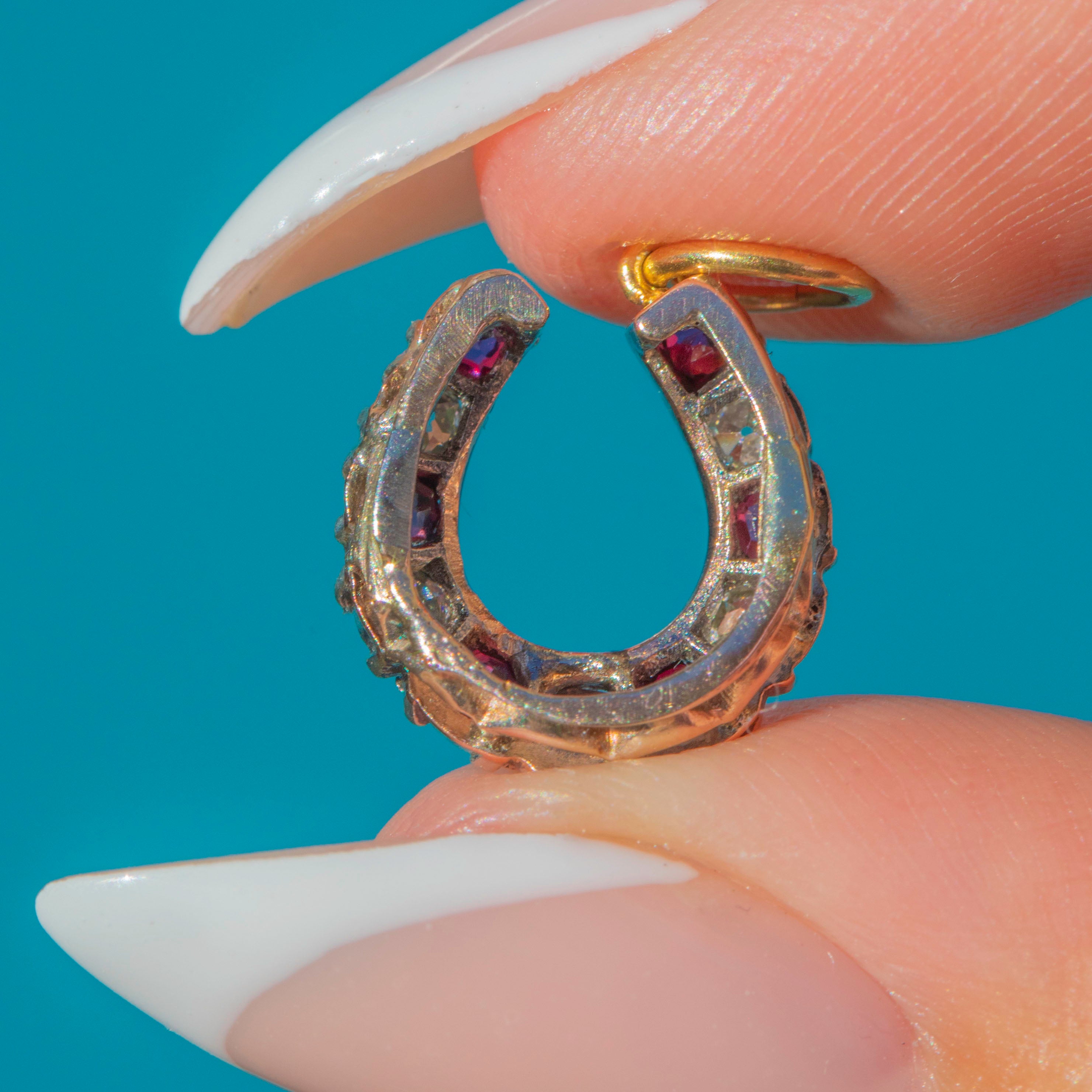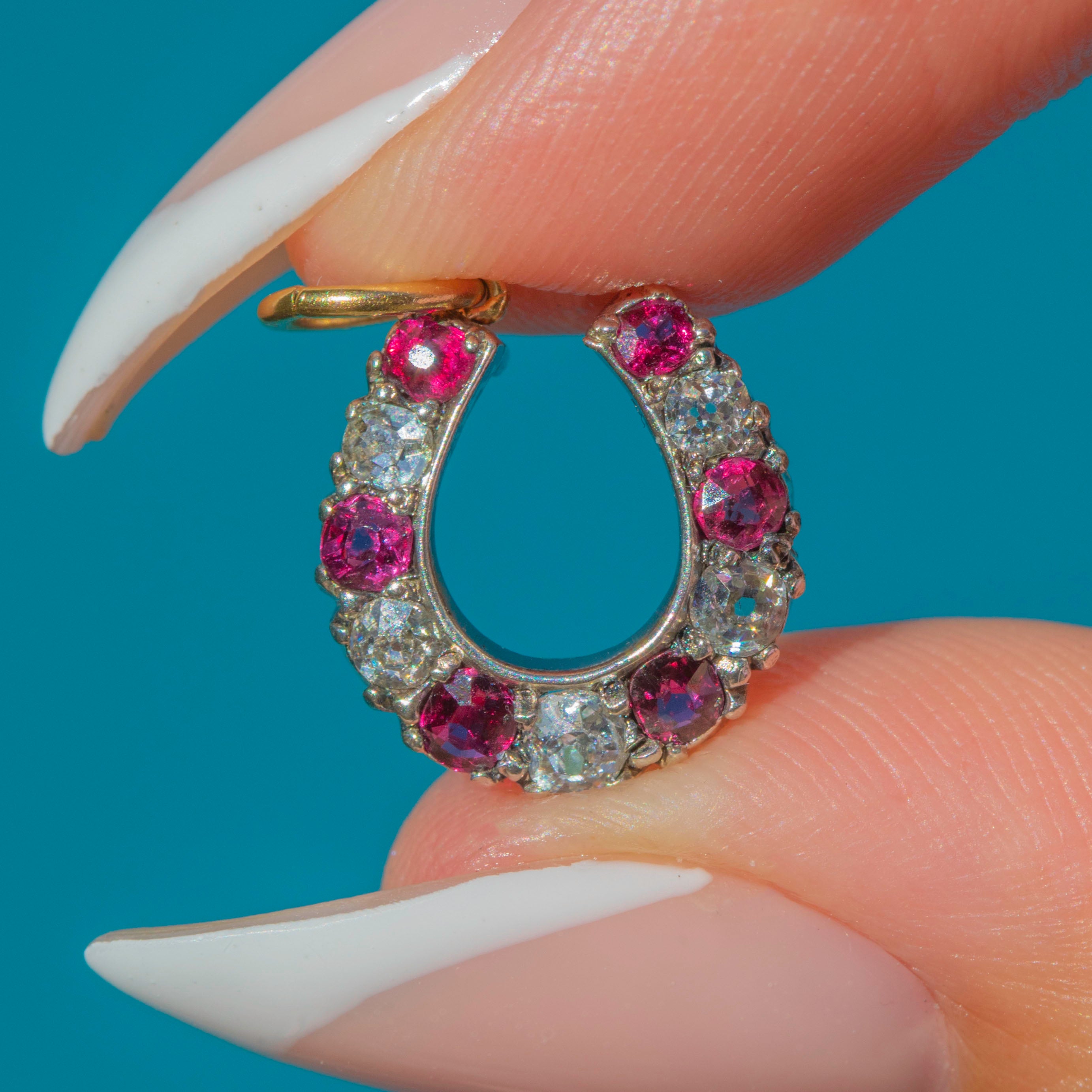 A delightful Victorian charm modelled as a lucky horseshoe, set with alternating Rubies and Old Mine Cut Diamonds. The gemstones are set in Silver for extra brightness, while the rest of the piece is crafted in rich 18ct Gold. Each stone sparkles with character, creating a classic and timeless motif that has been cherished for centuries.
