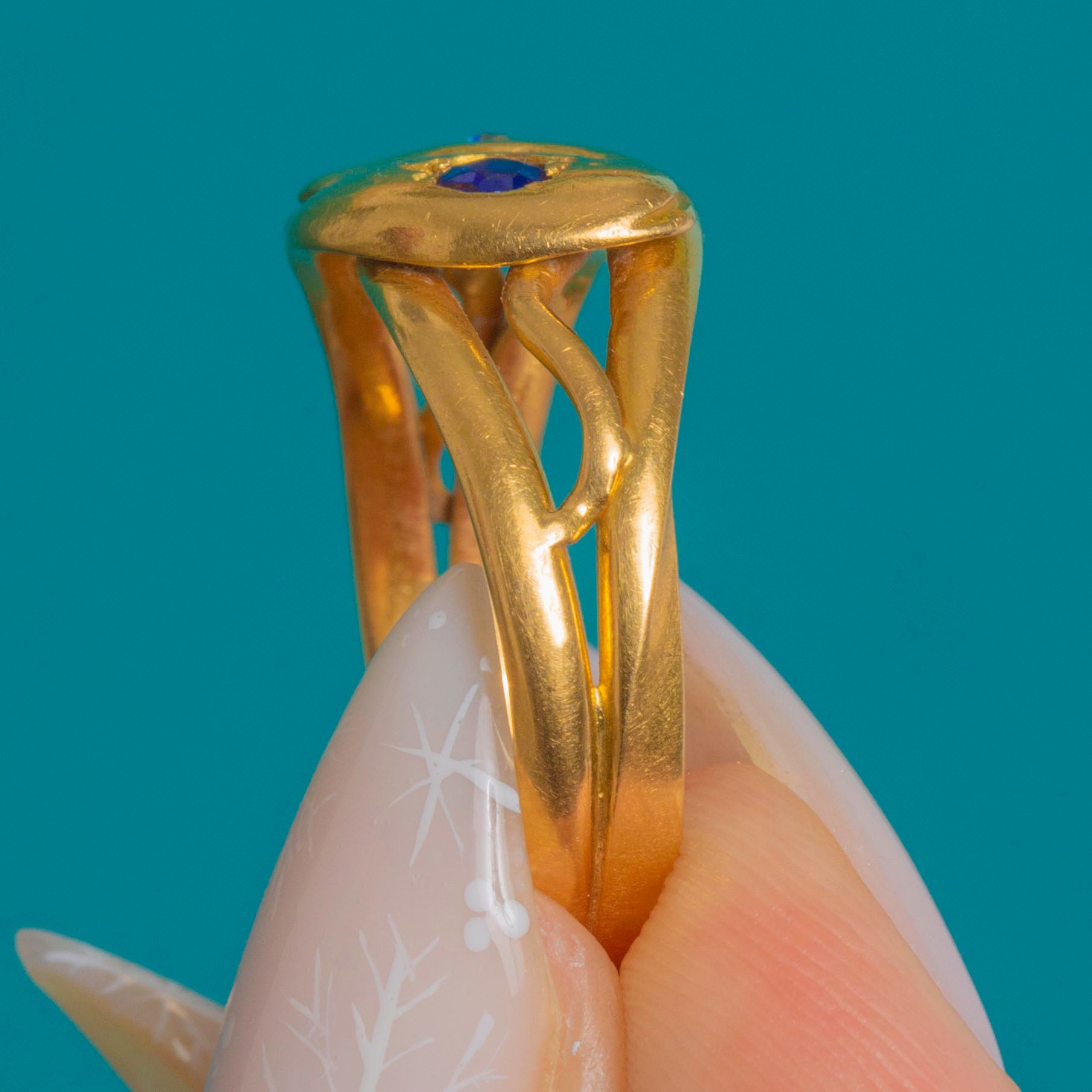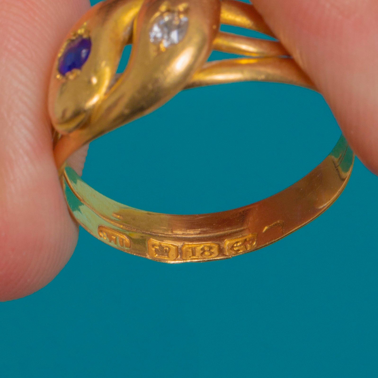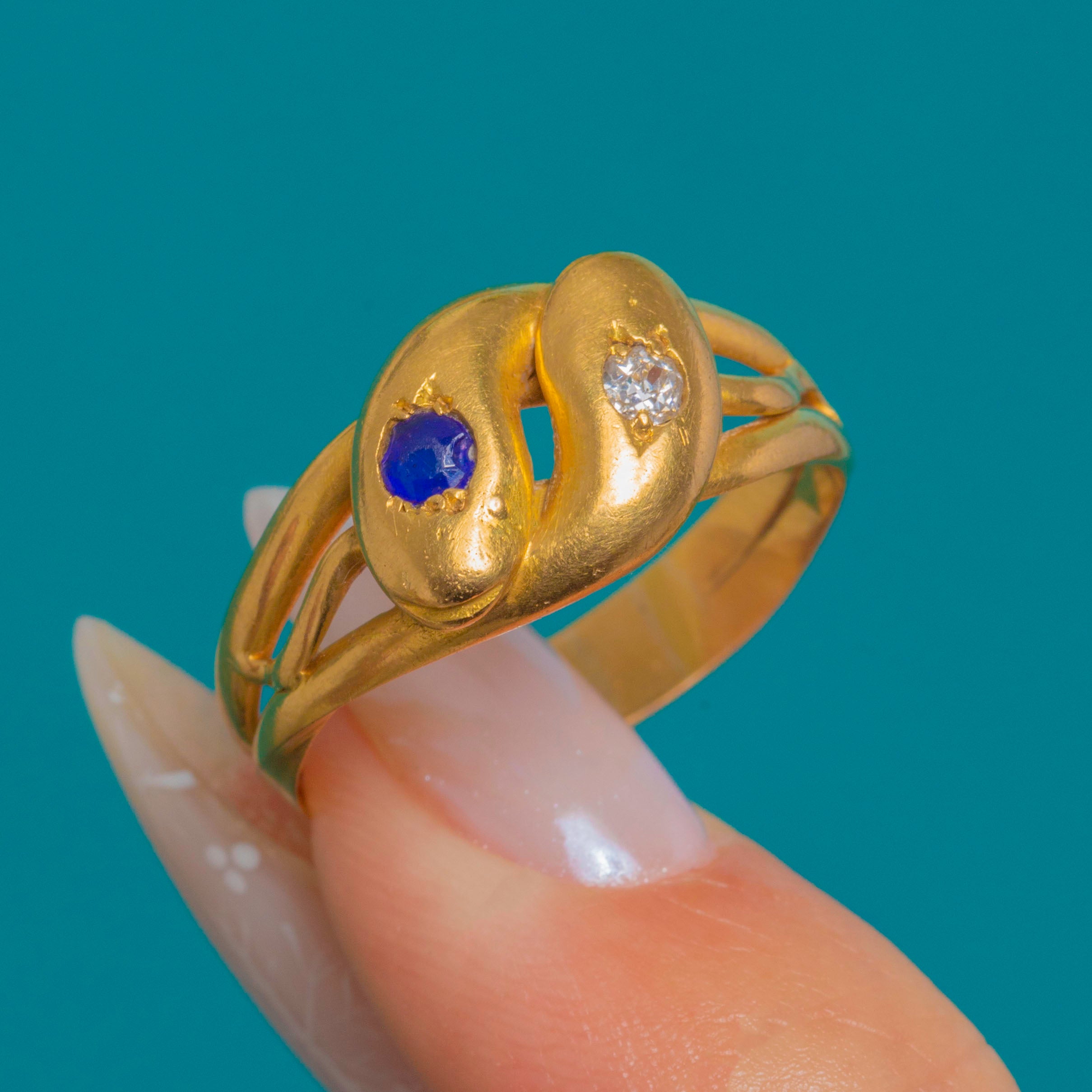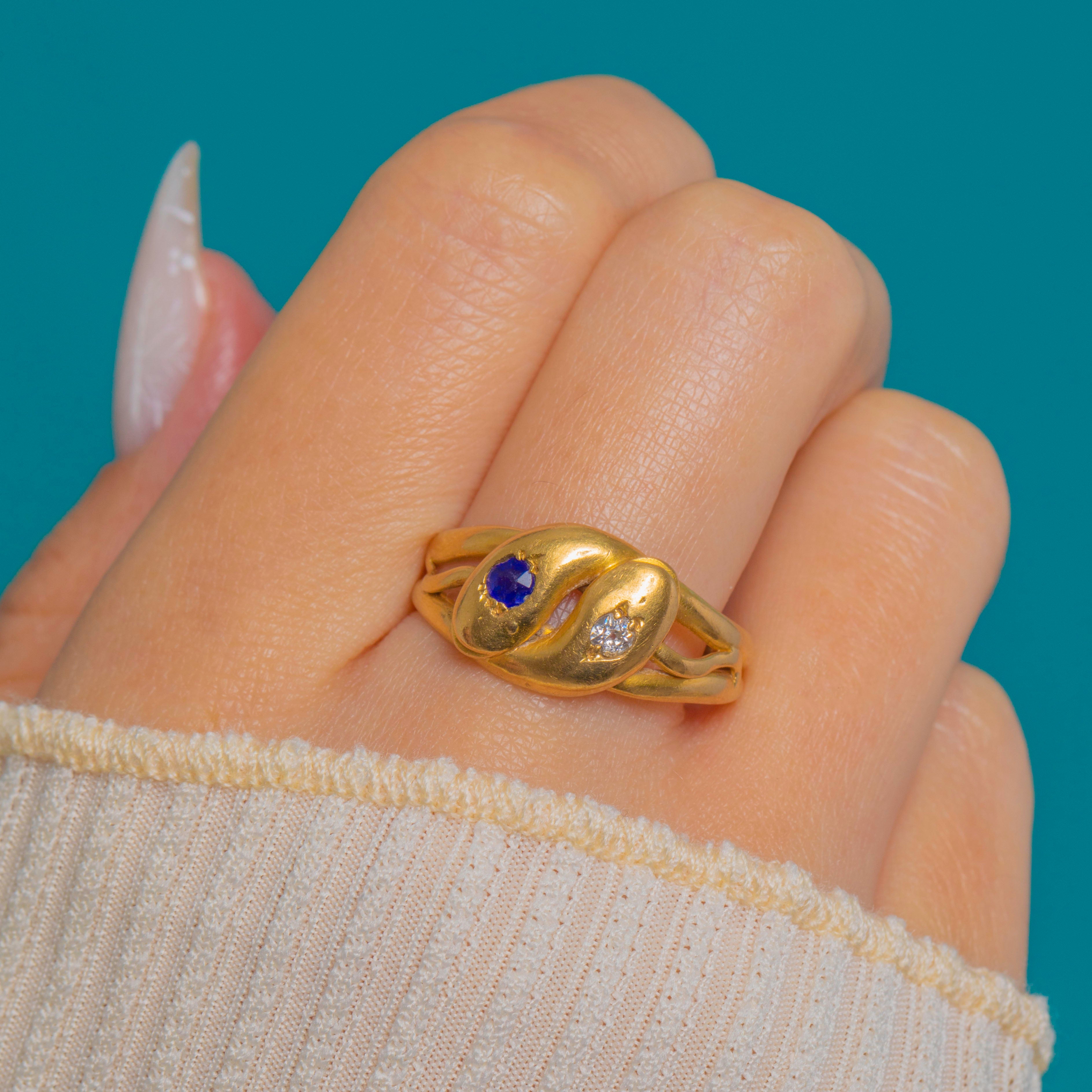 A quintessential Victorian treasure, this entwined double-snake ring is crafted in rich 18ct Gold. Two smooth serpent heads meet in a graceful bypass, each gypsy-set with a deep blue Sapphire on one, the other with a bright Diamond. The low, sculptural profile and split shoulders taper elegantly into a plain shank for a sleek, comfortable fit.