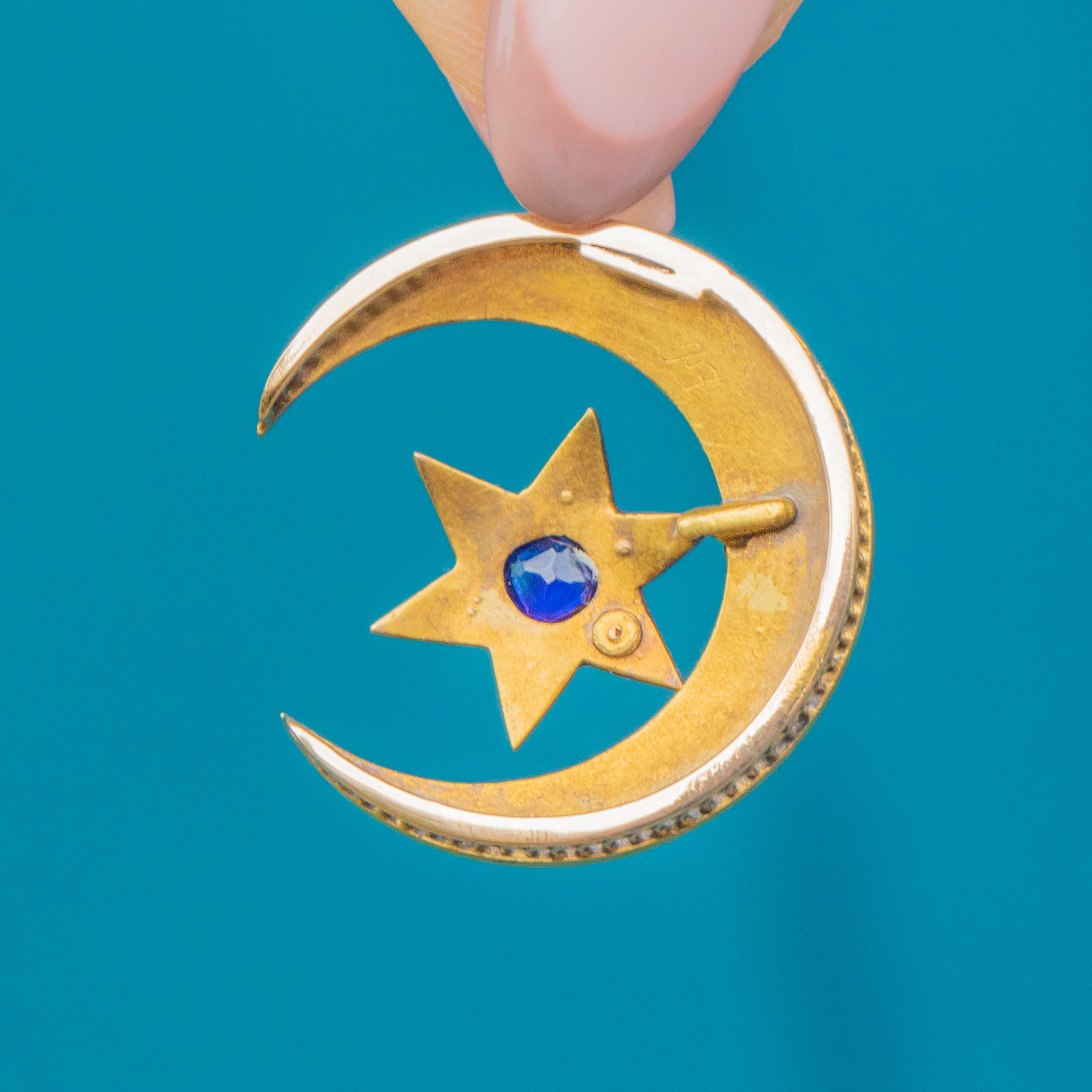 Victorian 18ct Gold Sapphire Pearl Crescent Moon & Star Pendant