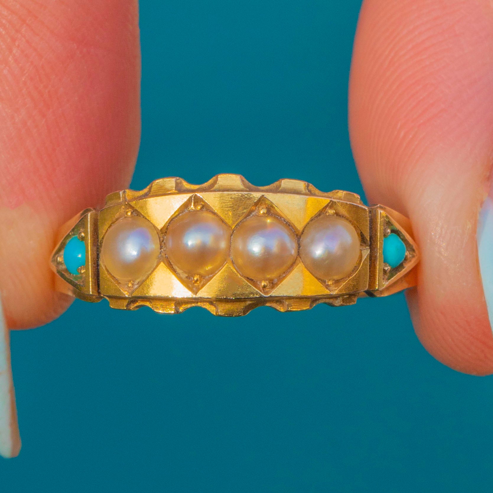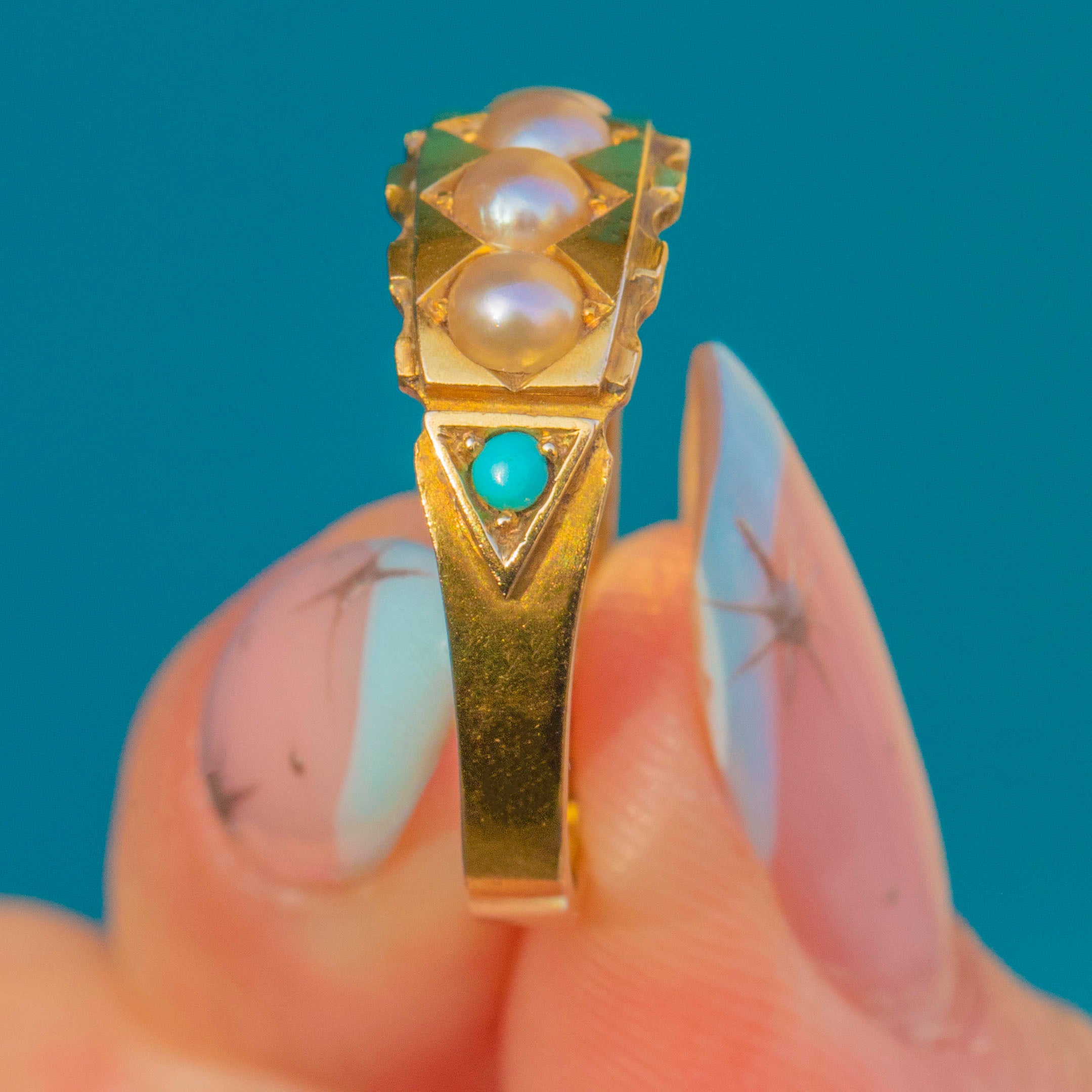 EXCELLENT: Pearls and Turquoise are secure and display gentle age-appropriate surface character with beautiful lustre and colour. The Gold shows light surface wear and a mellow antique patina; the decorative edges remain crisp with slight softening at the highest points. The band is smooth, and the full set of English hallmarks are fully legible.