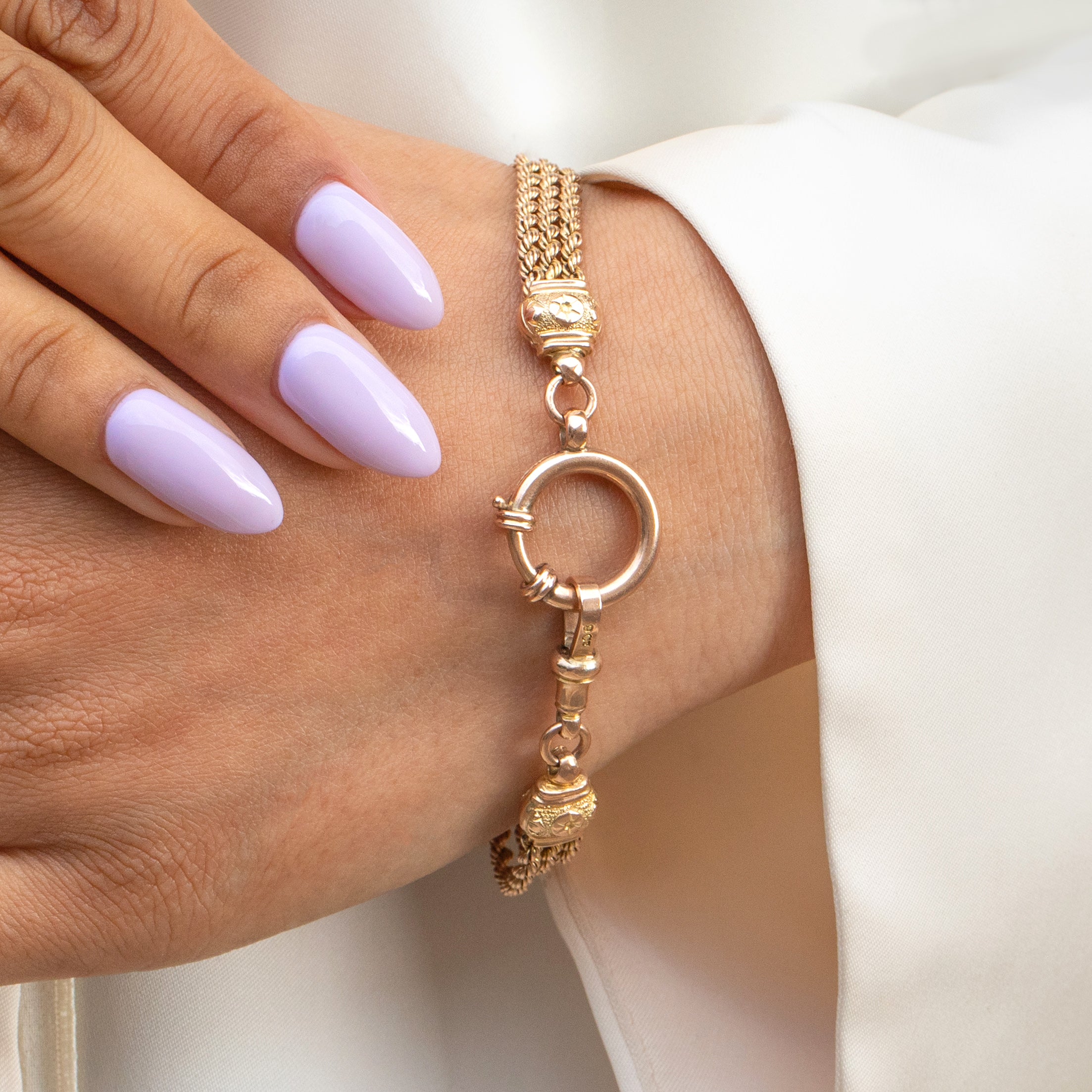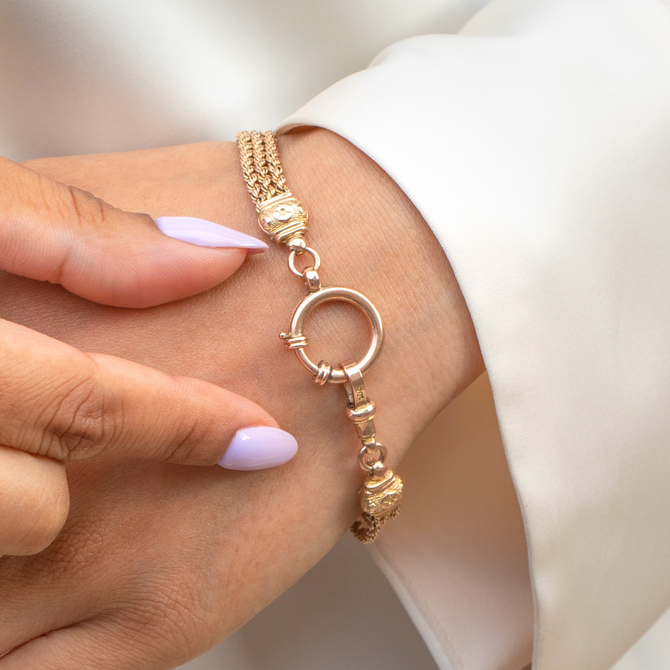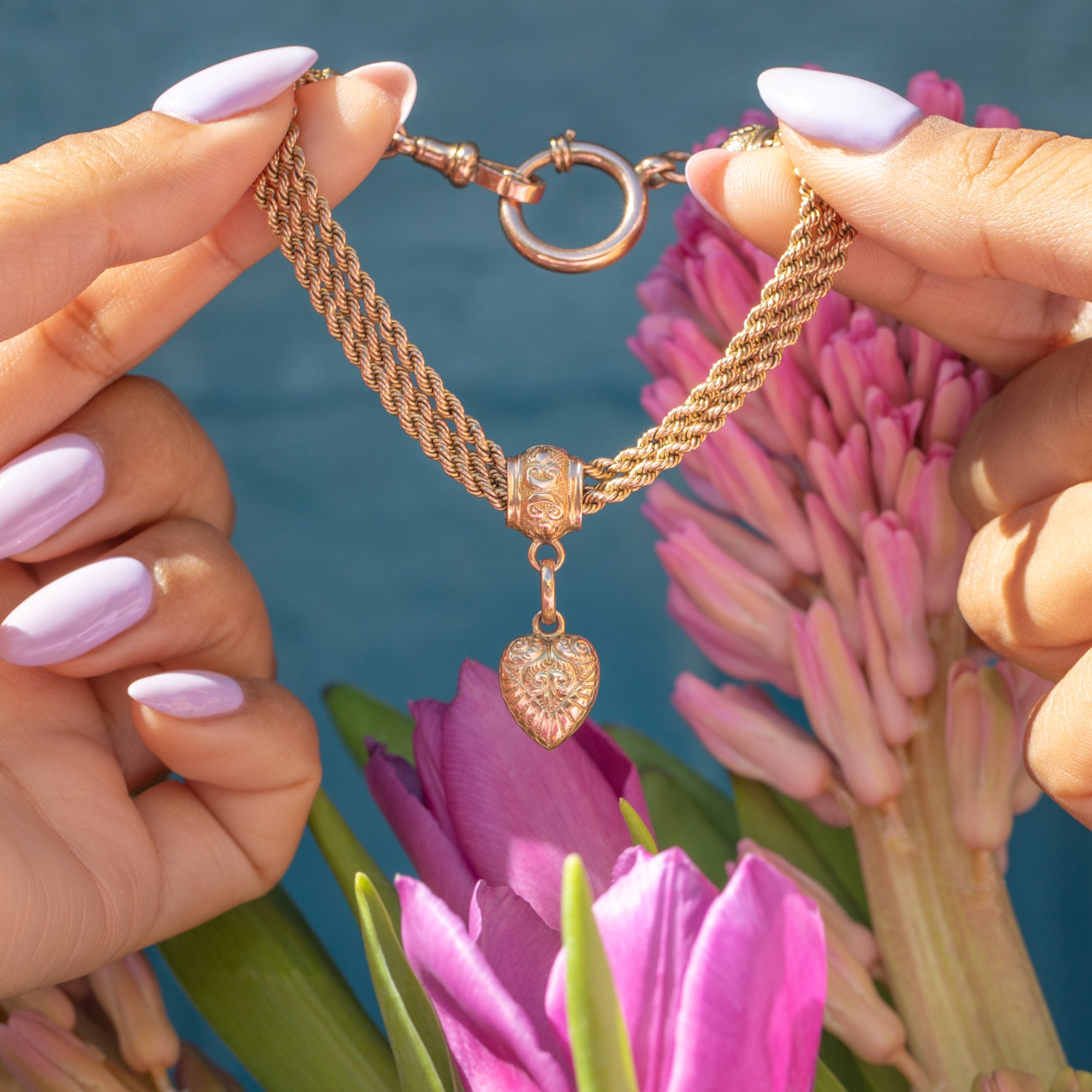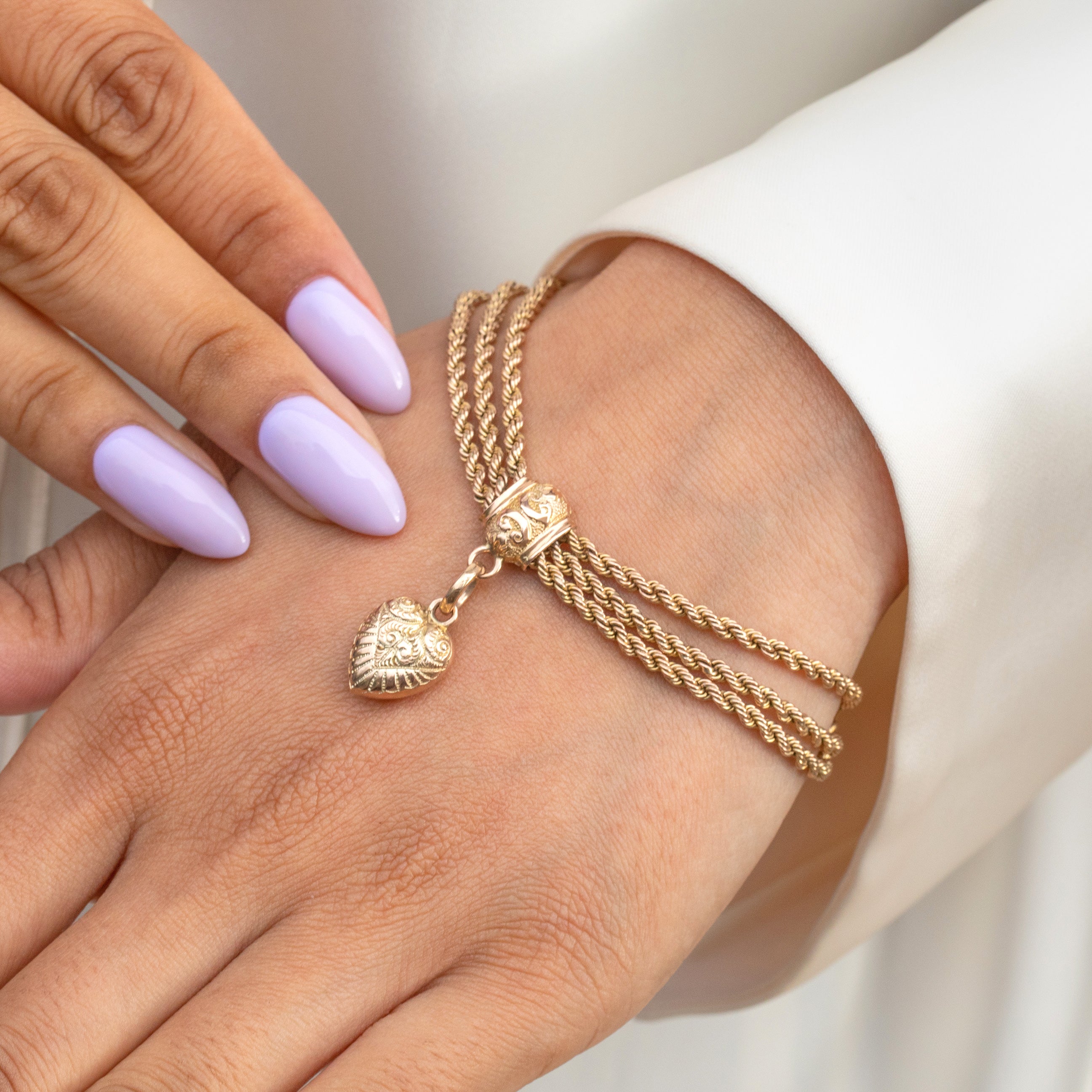 At the centre of attention hangs a puffy heart charm, delicately engraved with swirling patterns, suspended between three strands of chunky rope chains. Crafted from solid 9ct Gold throughout, this antique Albertina bracelet will bring undeniable luxury to your attire!