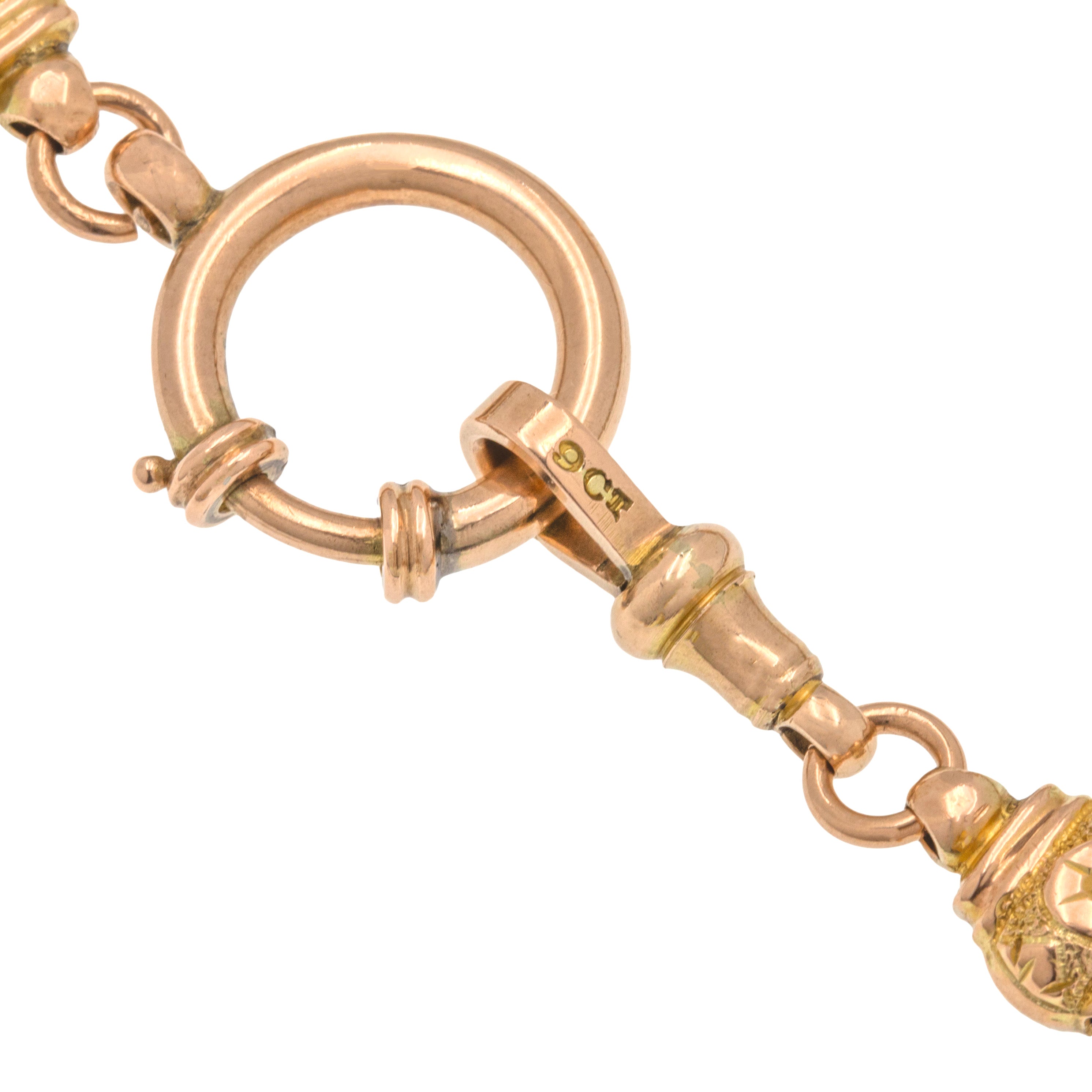 This exquisite Victorian 9ct Gold Albertina bracelet, complete with an engraved puffy heart, has been made with meticulous attention to detail and drapes across the wrist with elegance. The gentle curves and intricate detailing perfectly capture the craftsmanship of the Victorian era, closing with no less than a bolt-ring and dog-clip.
