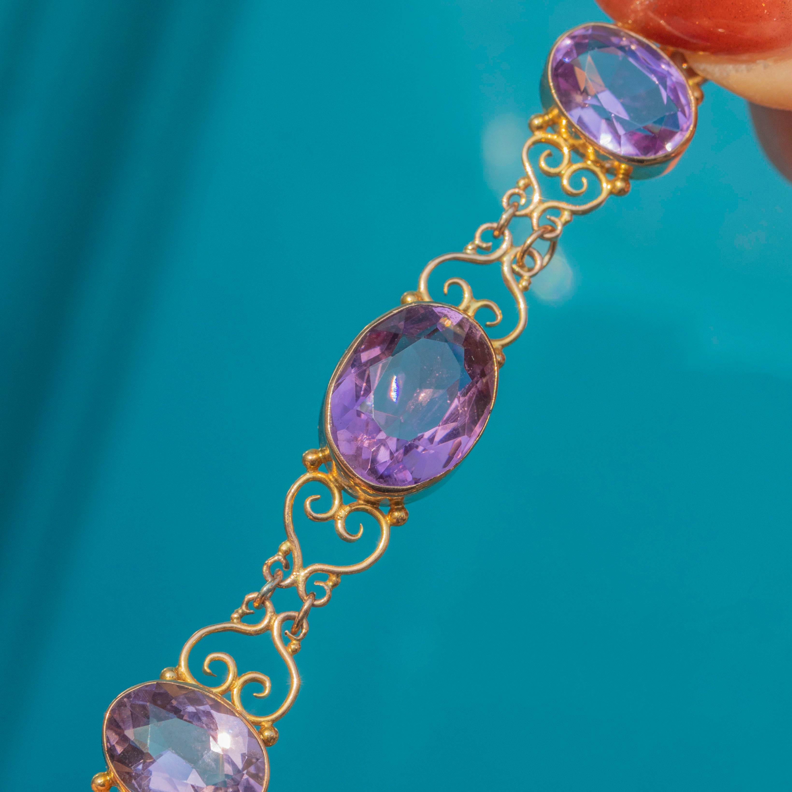 Orantely formed and exuding antique charm, this Victorian 9ct Gold Amethyst bracelet will make an enchanting addition to your collection! The seven irresistible Amethysts, with a combined weight of 22.98ct, have been exquisitely faceted and shimmer with lavender and lilac hues.