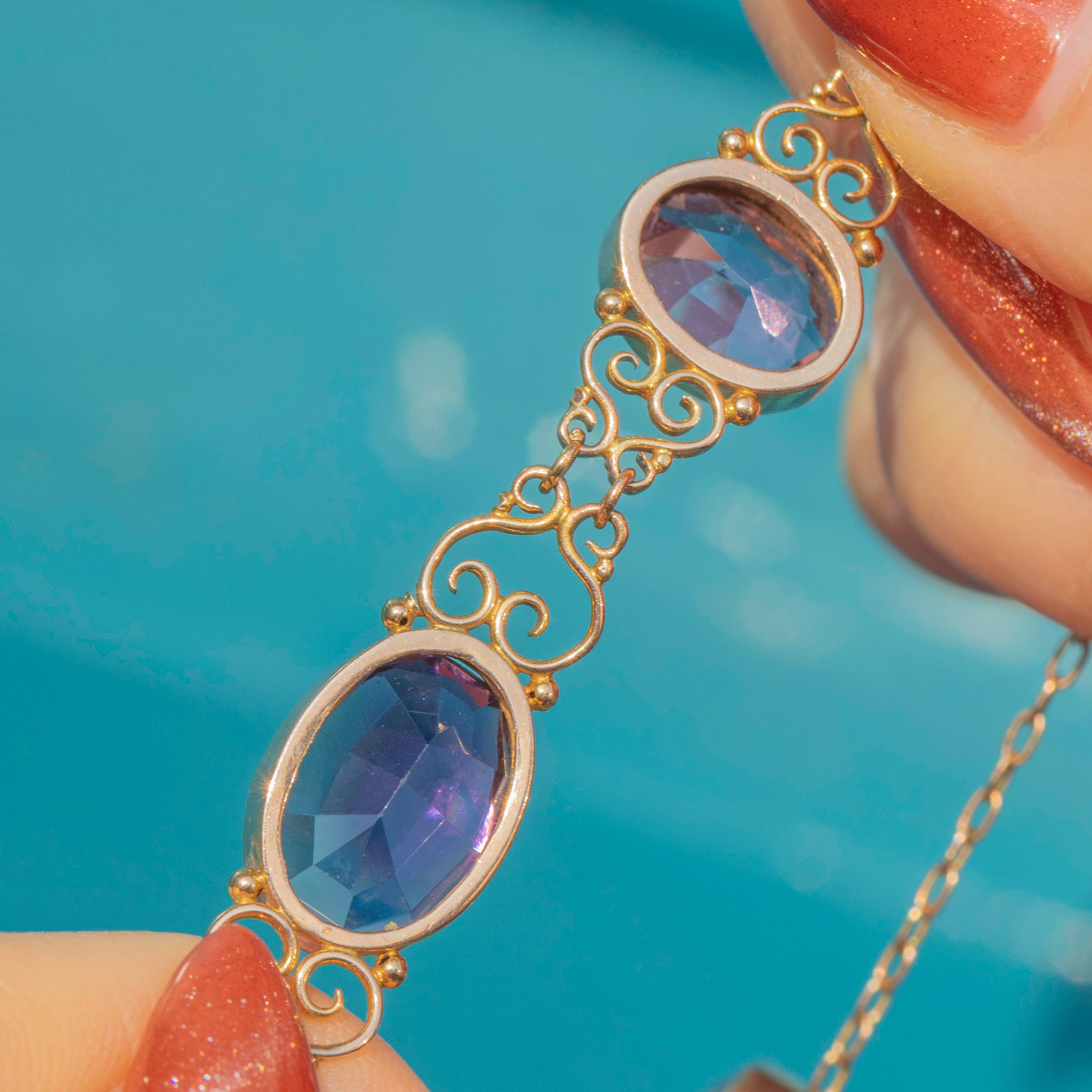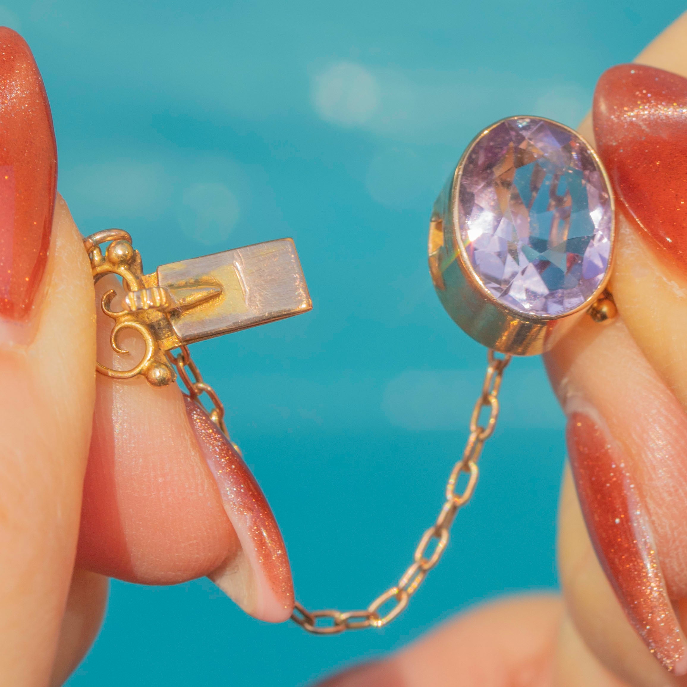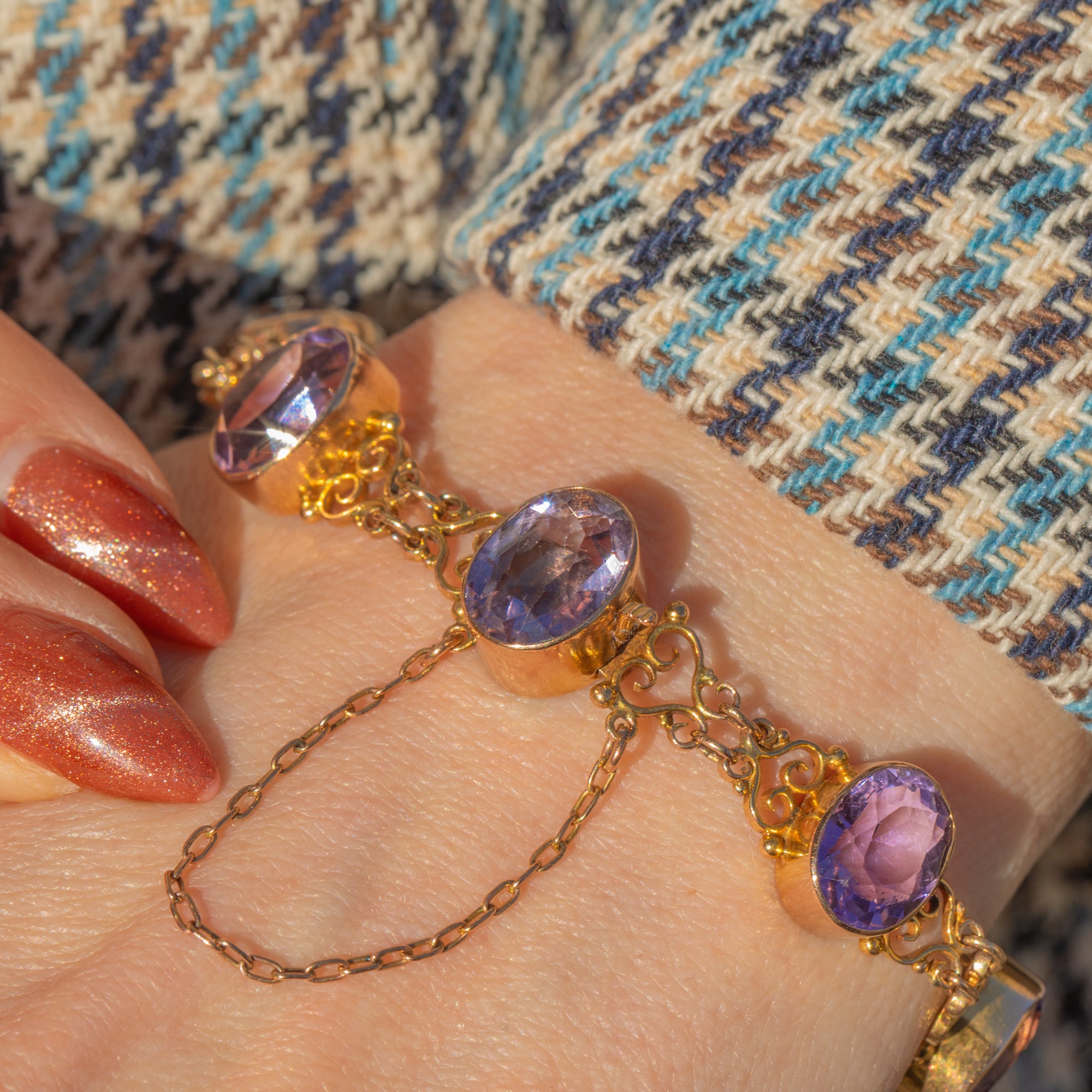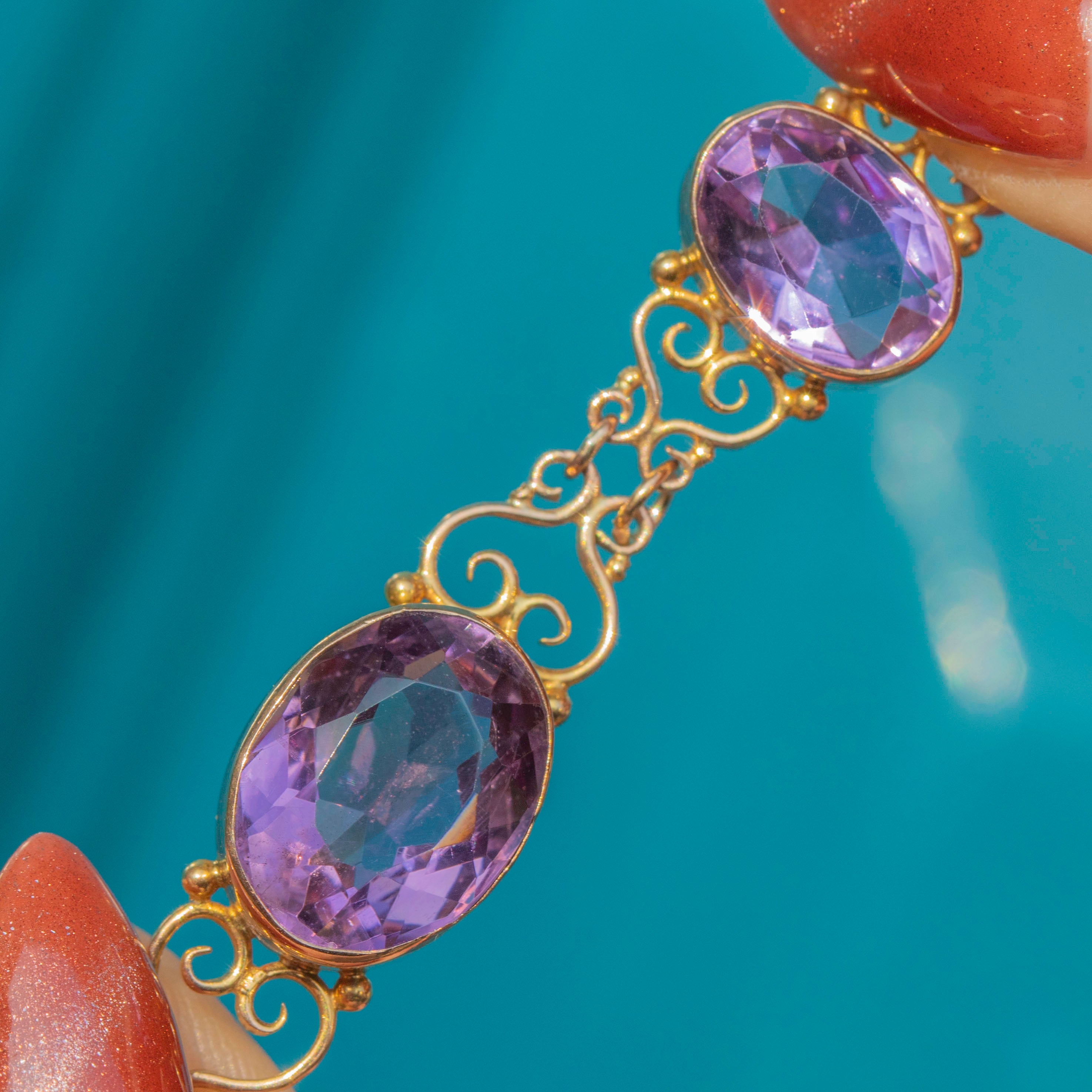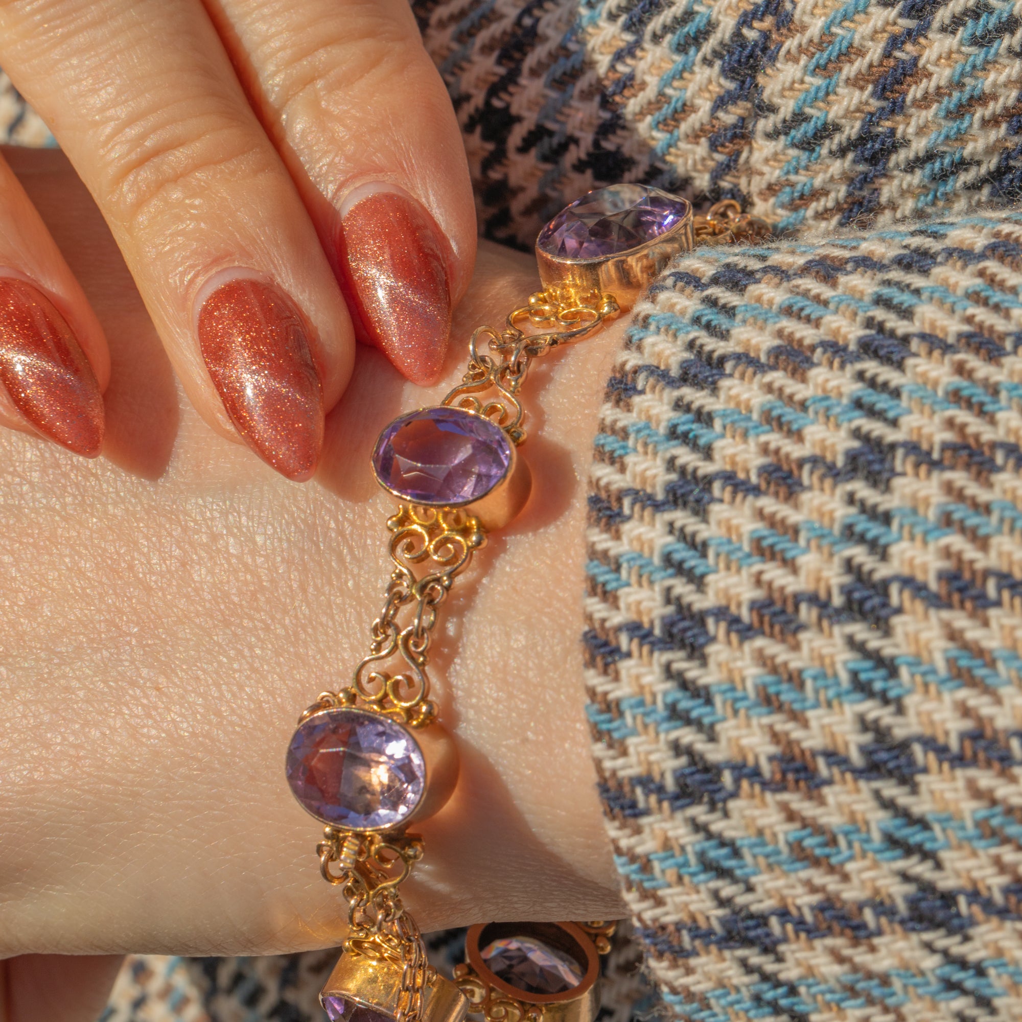 The Amethysts are wrapped up in buttery 9ct Gold bezels and connected by curved heart-shaped links, adding a romantic finishing touch. This antique Amethyst bracelet is a celebration of Victorian craftsmanship and will betow your wrist with endless splendour!