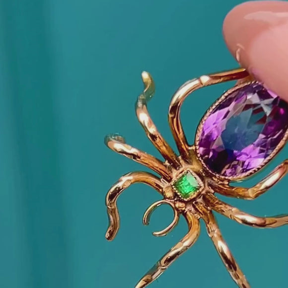 This Victorian 9ct Gold Amethyst Emerald spider pendant will instantly have you caught in its web of mystique!