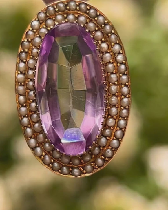This is a beautiful antique 18ct Gold Amethyst Pearl pendant! One of our favourite Victorian jewellery pairings, this pendant is an easy 'yes' with her rich purple Amethyst and the double row of seed Pearls.