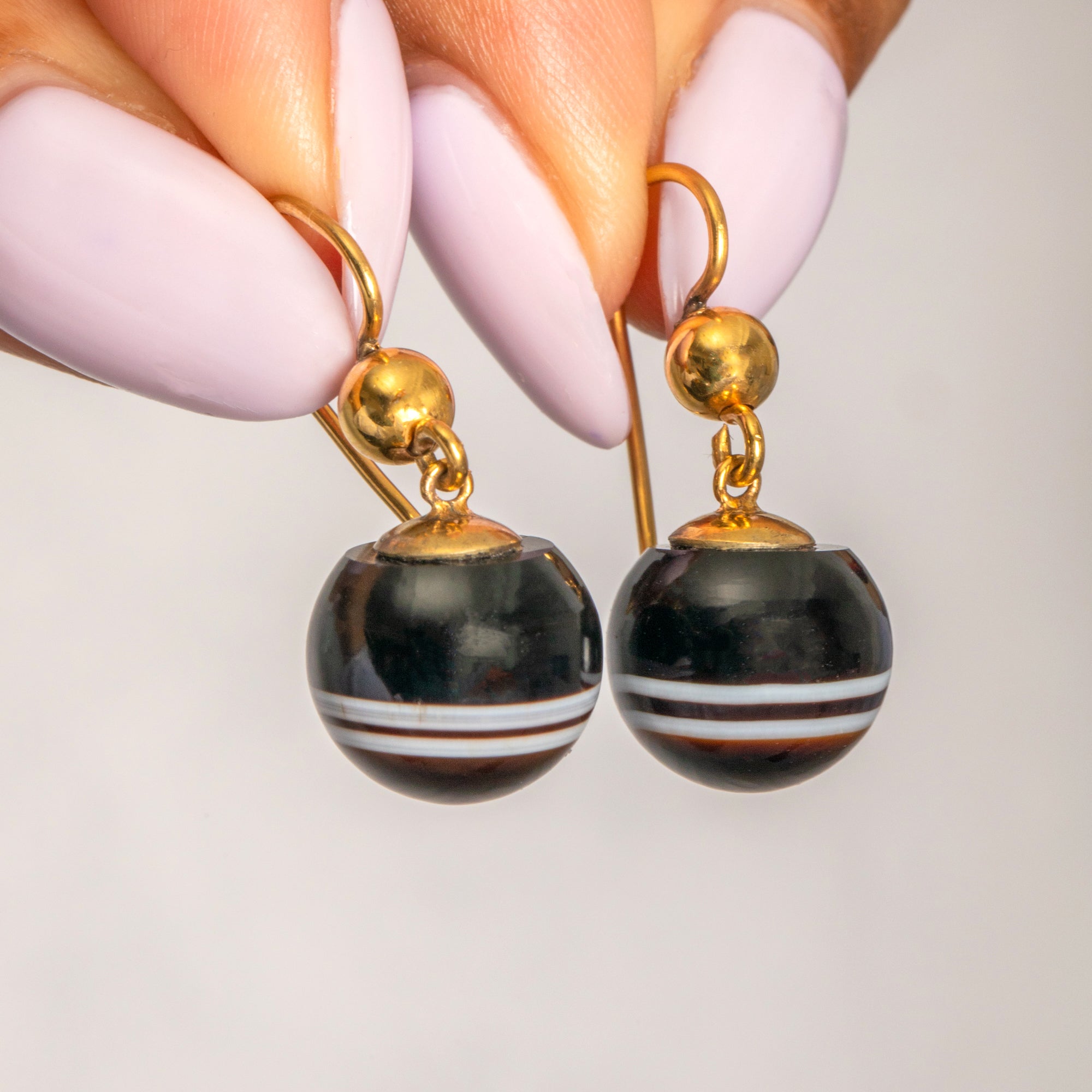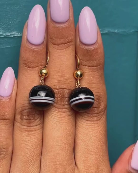 Victorian 9ct Gold Banded Agate Orb Earrings