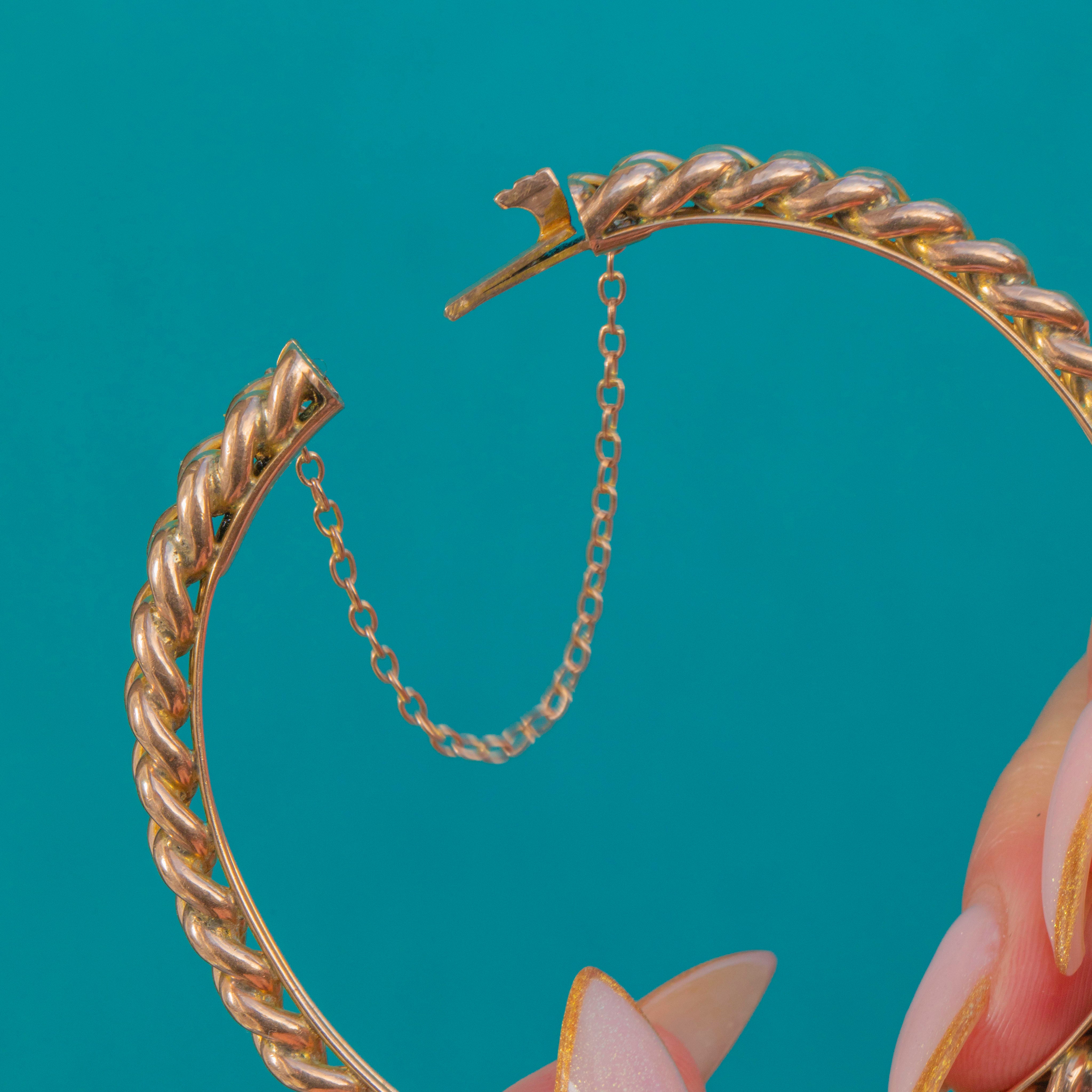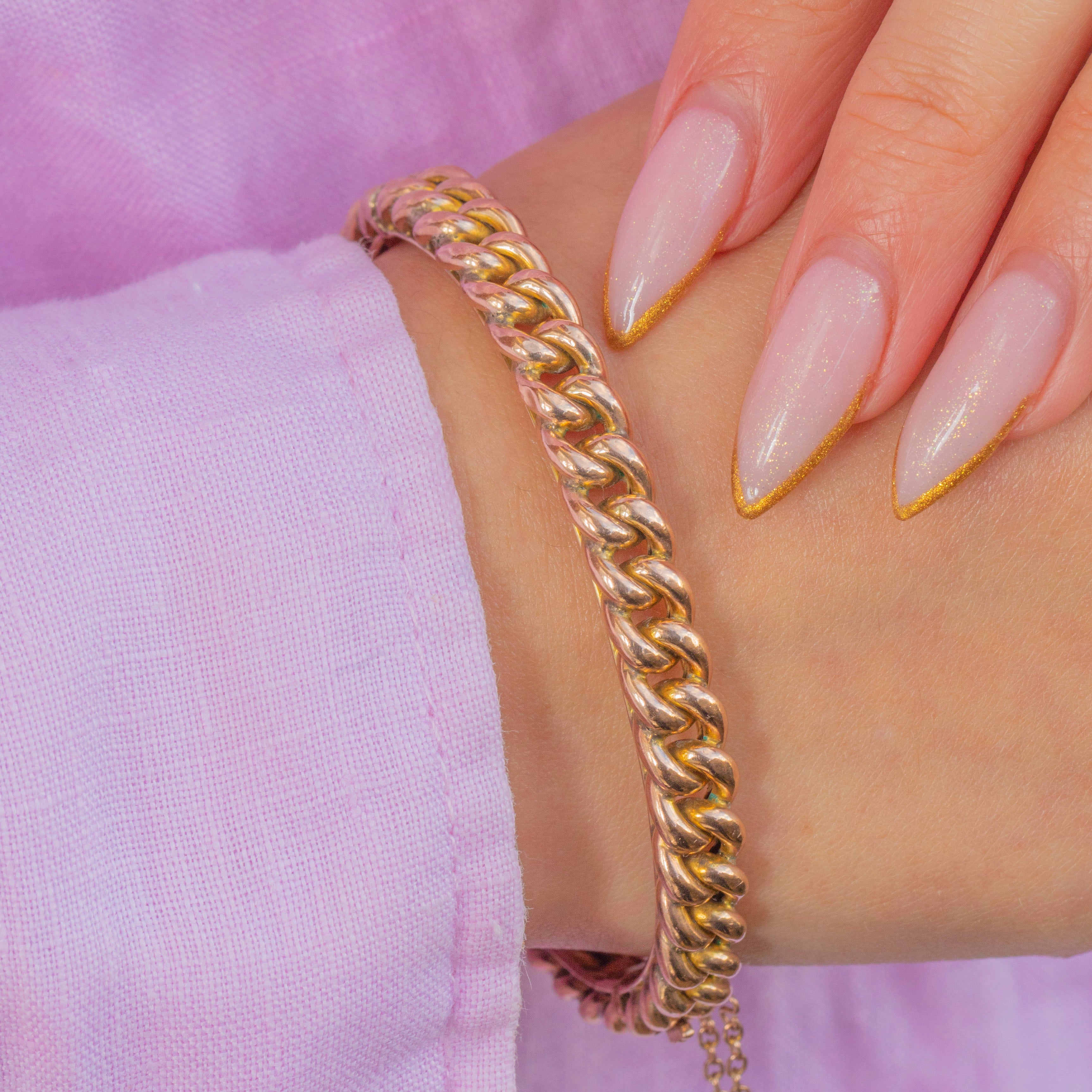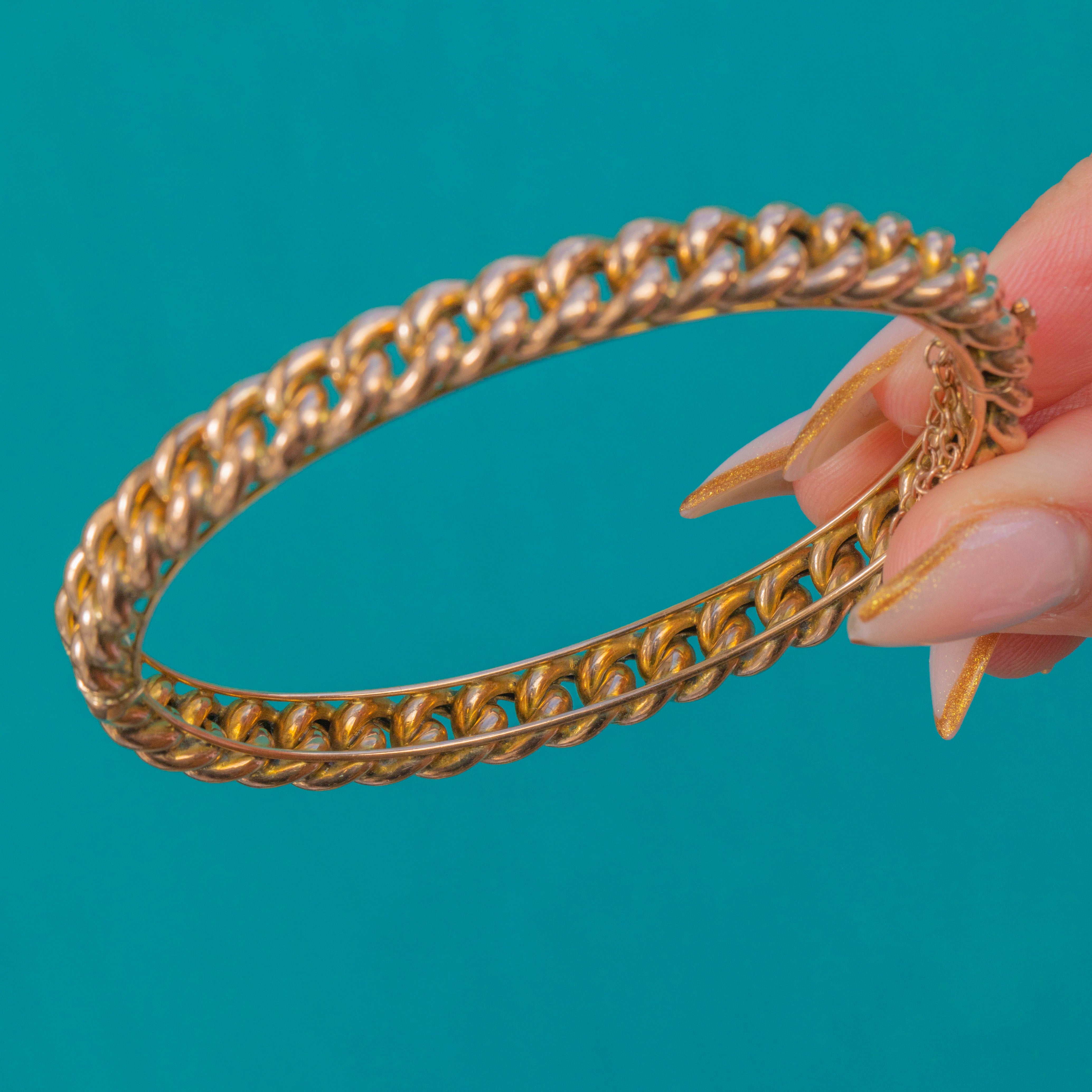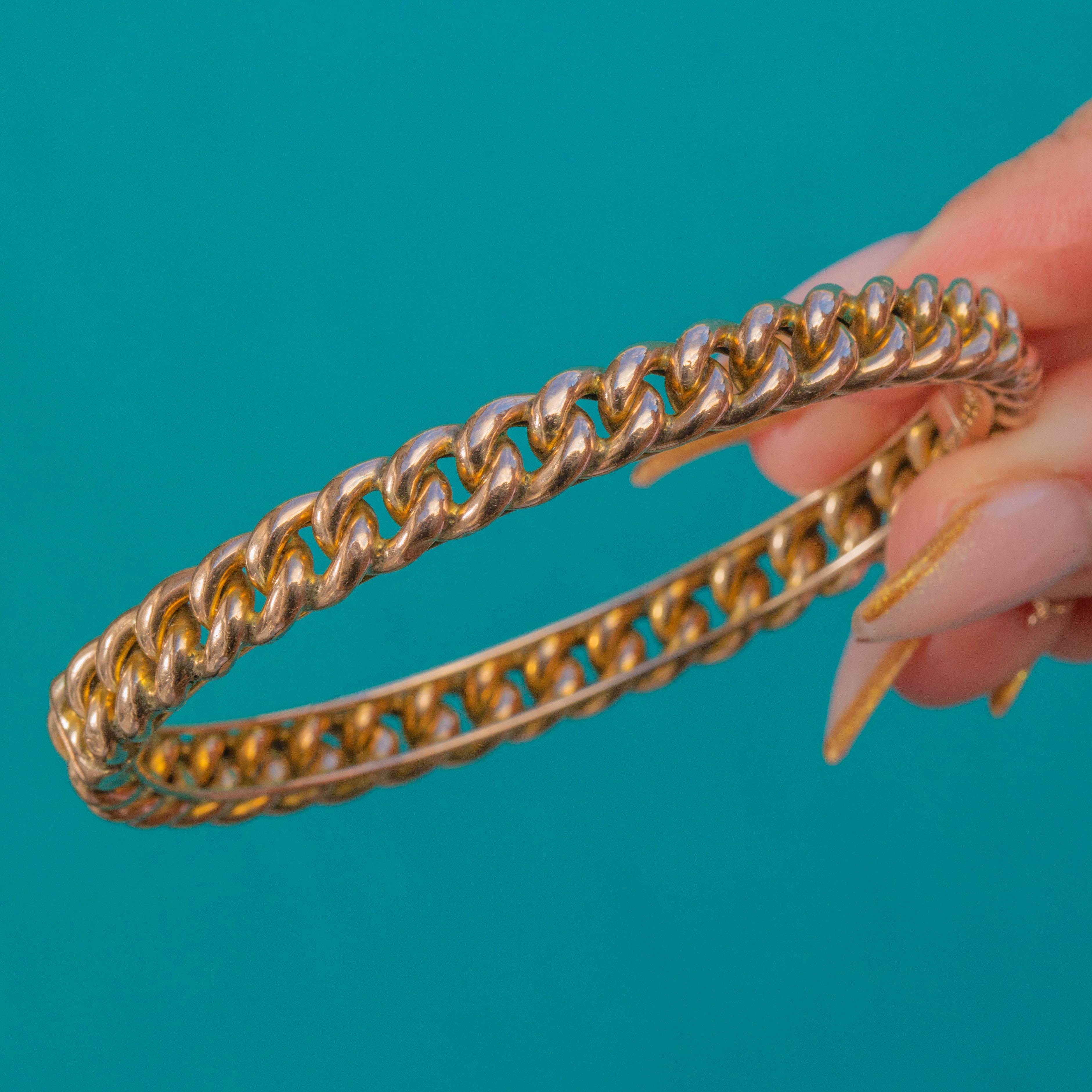 This antique 9ct Gold curb bangle is a gorgeous Victorian classic, dating to circa 1900. The rounded curb links form a smooth, continuous row of Gold around the wrist, giving it a sleek yet substantial feel.