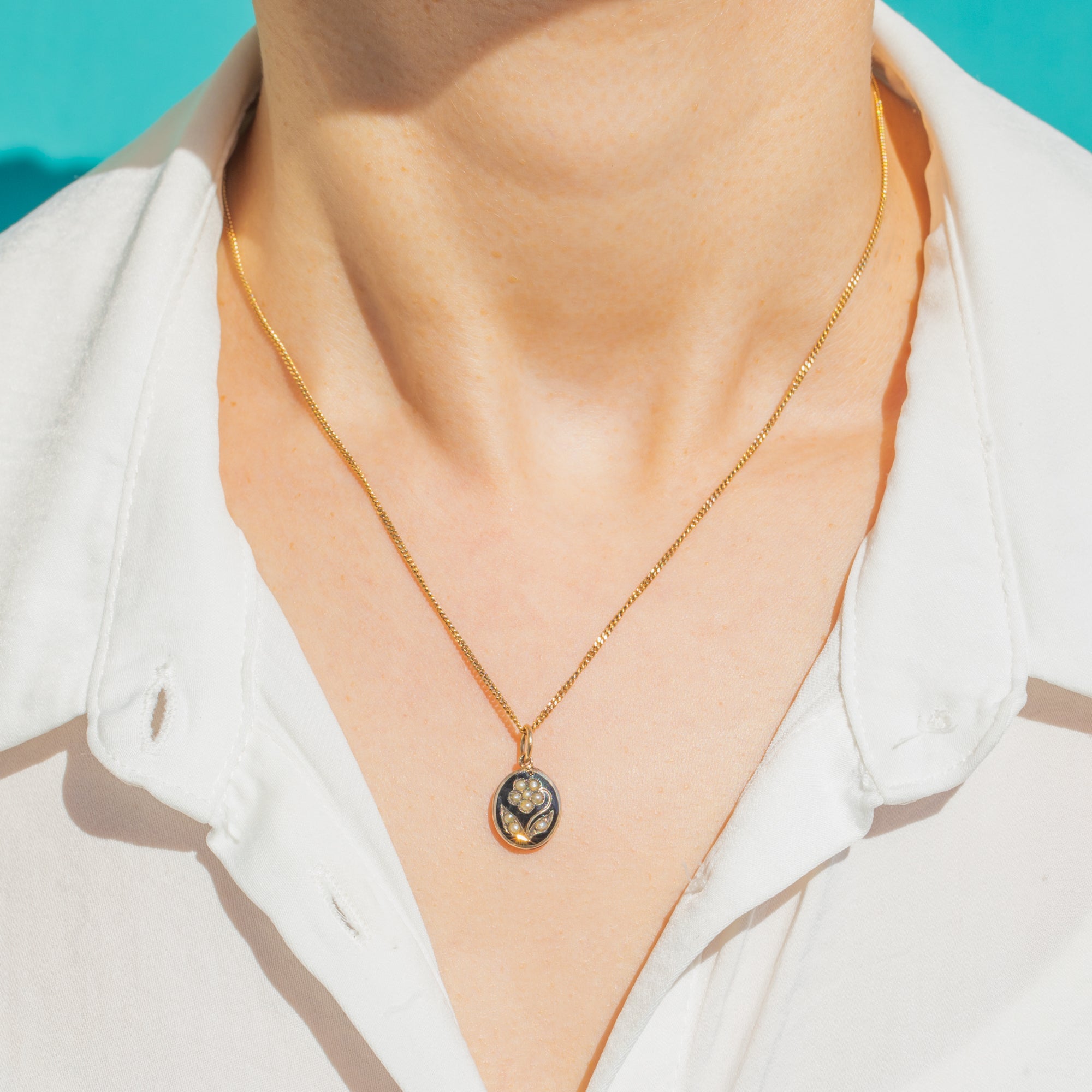 Lovingly crafted with Seed Pearls arranged as a tiny bloom on a glossy Enamel ground, the gold bezel and simple jump ring complete the refined medallion silhouette. A timeless token of remembrance with enduring Victorian charm.
