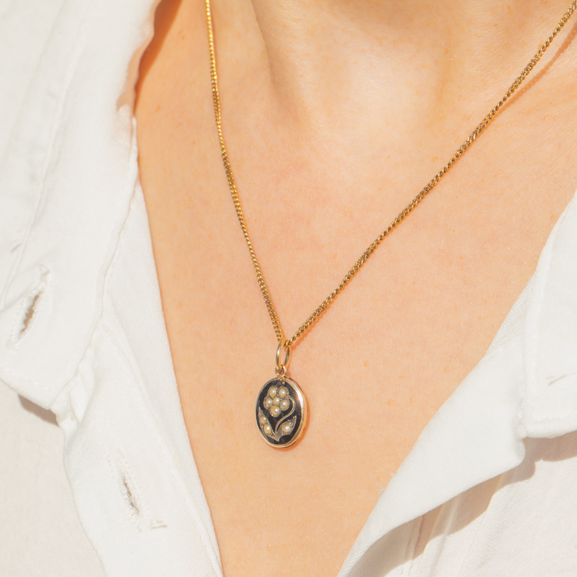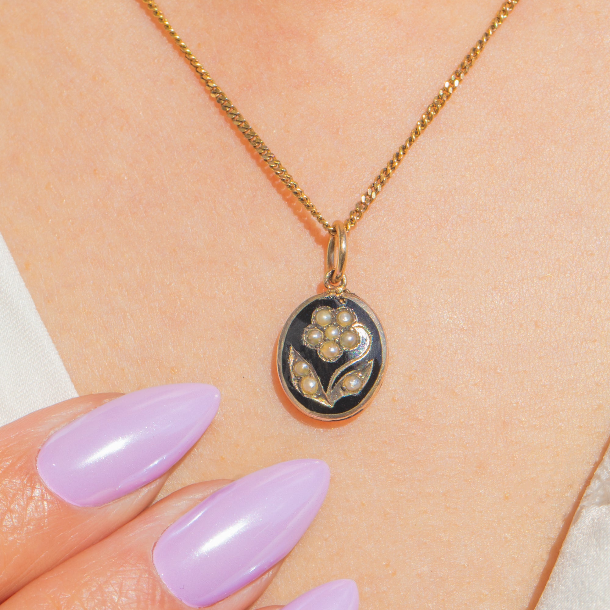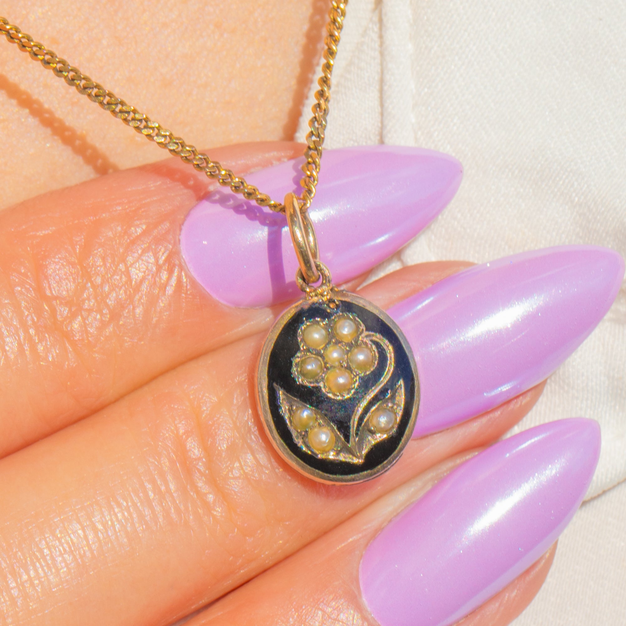 A sweet antique mourning charm, this petite oval pendant pairs inky Black Enamel with a luminous Seed Pearl forget-me-not set in warm 9ct Gold. The high-contrast palette and tender floral motif capture the sentiment and elegance of Victorian design in miniature.