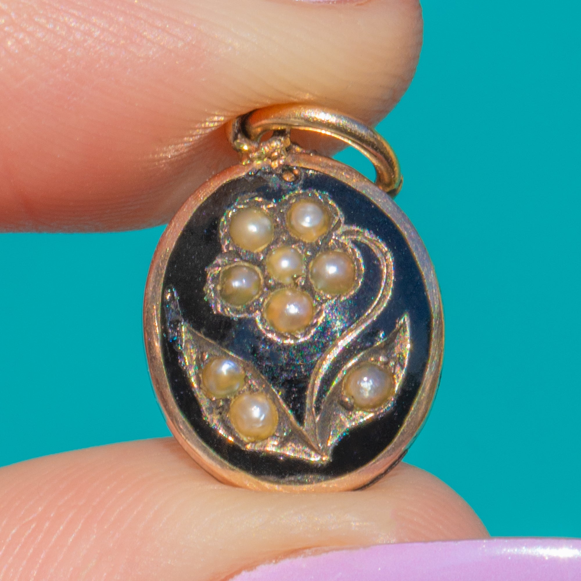 VERY GOOD: The Black Enamel remains glossy with light surface wear and no obvious chips visible to the eye. Seed Pearls are intact and well-matched with gentle, age-appropriate nacre wear. The 9ct Gold bezel and hasp show minor abrasions and a soft patina consistent with age, with no visible repairs.