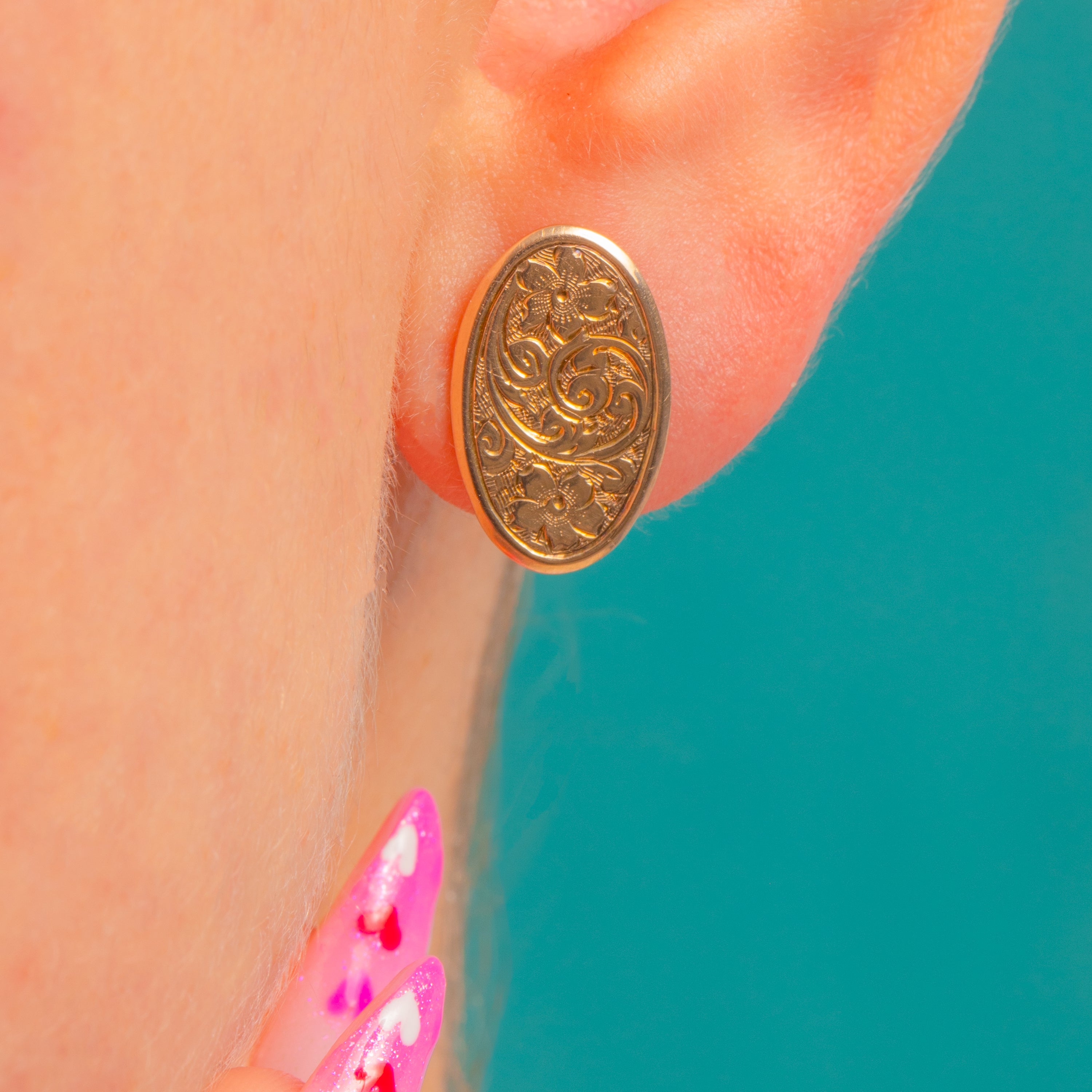 Delicately ornate and unmistakably Victorian, these 9ct Gold oval studs are miniature works of art. Each face is richly engraved with scrolling foliage and tiny five-petaled flowers, the polished relief glowing against a finely textured, stippled ground. A softly raised rim frames the design, lending a refined, button-like profile in warm, buttery Gold.