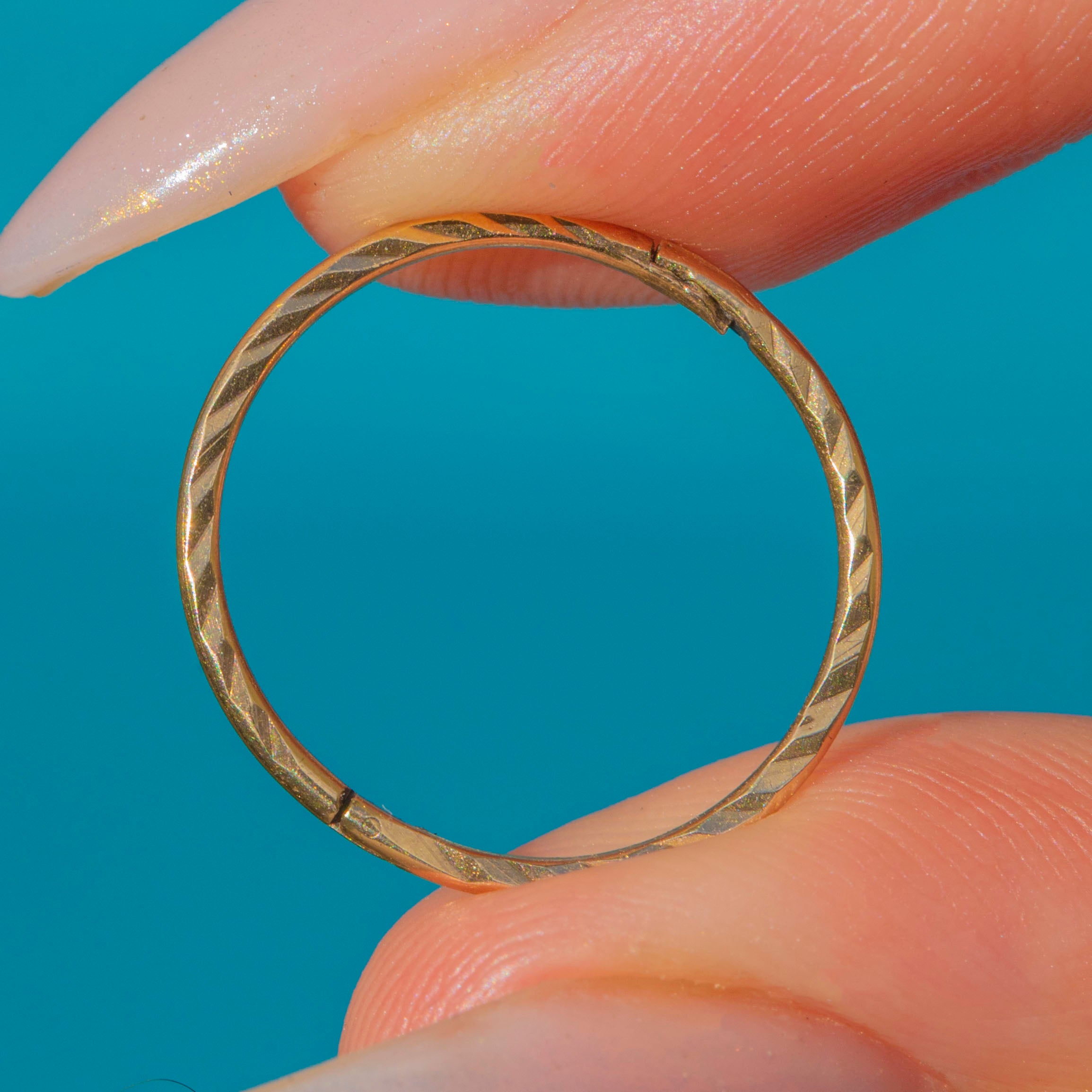 A fine pair of Antique Victorian sleeper hoop earrings, crafted in 9ct Gold. These pretty hoops measure 16mm in diameter, snug and comfortable for everyday wear. The Gold has a soft antique hue, enriched with subtle faceting that gives the surface a gentle sparkle.