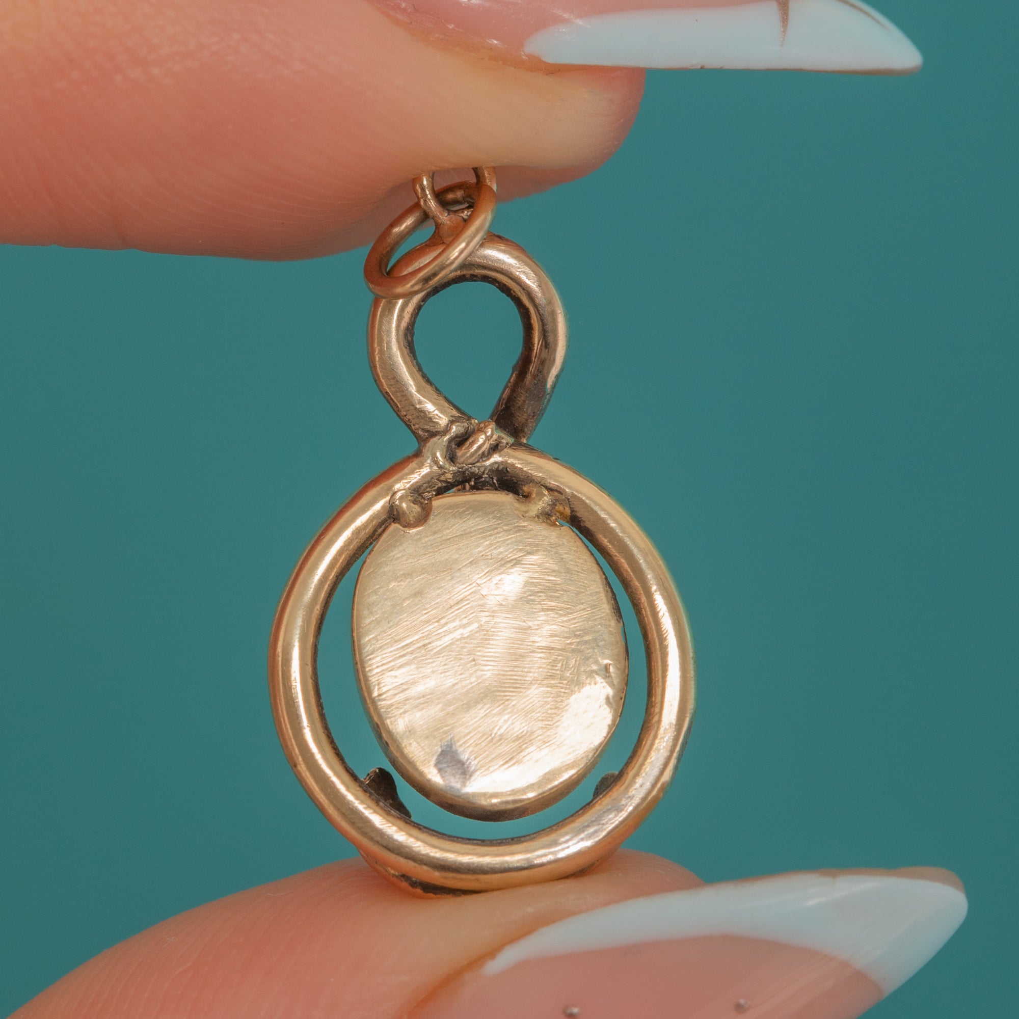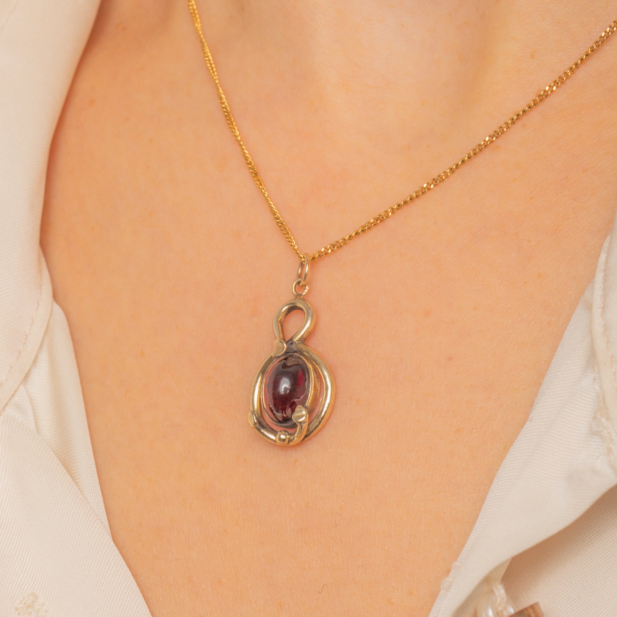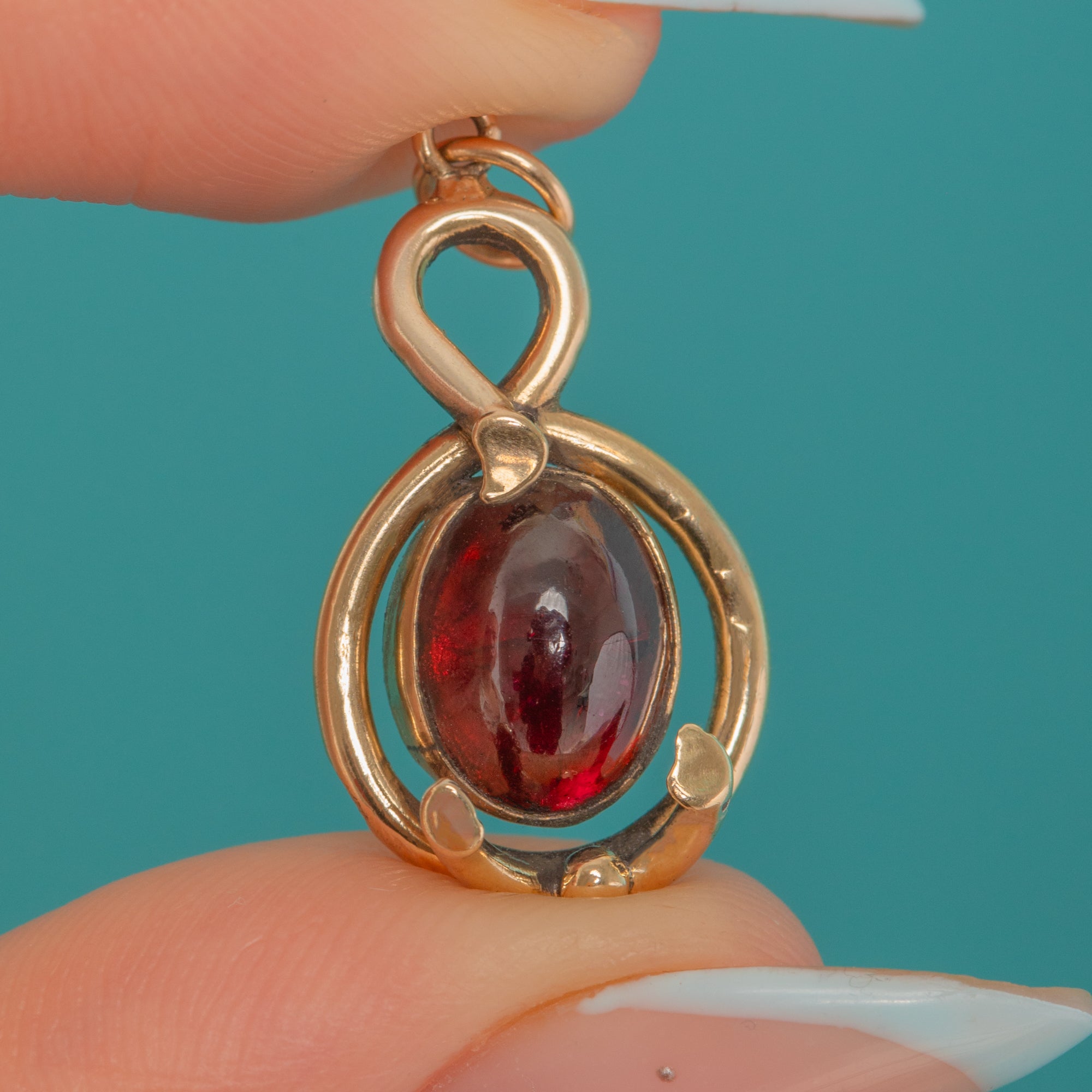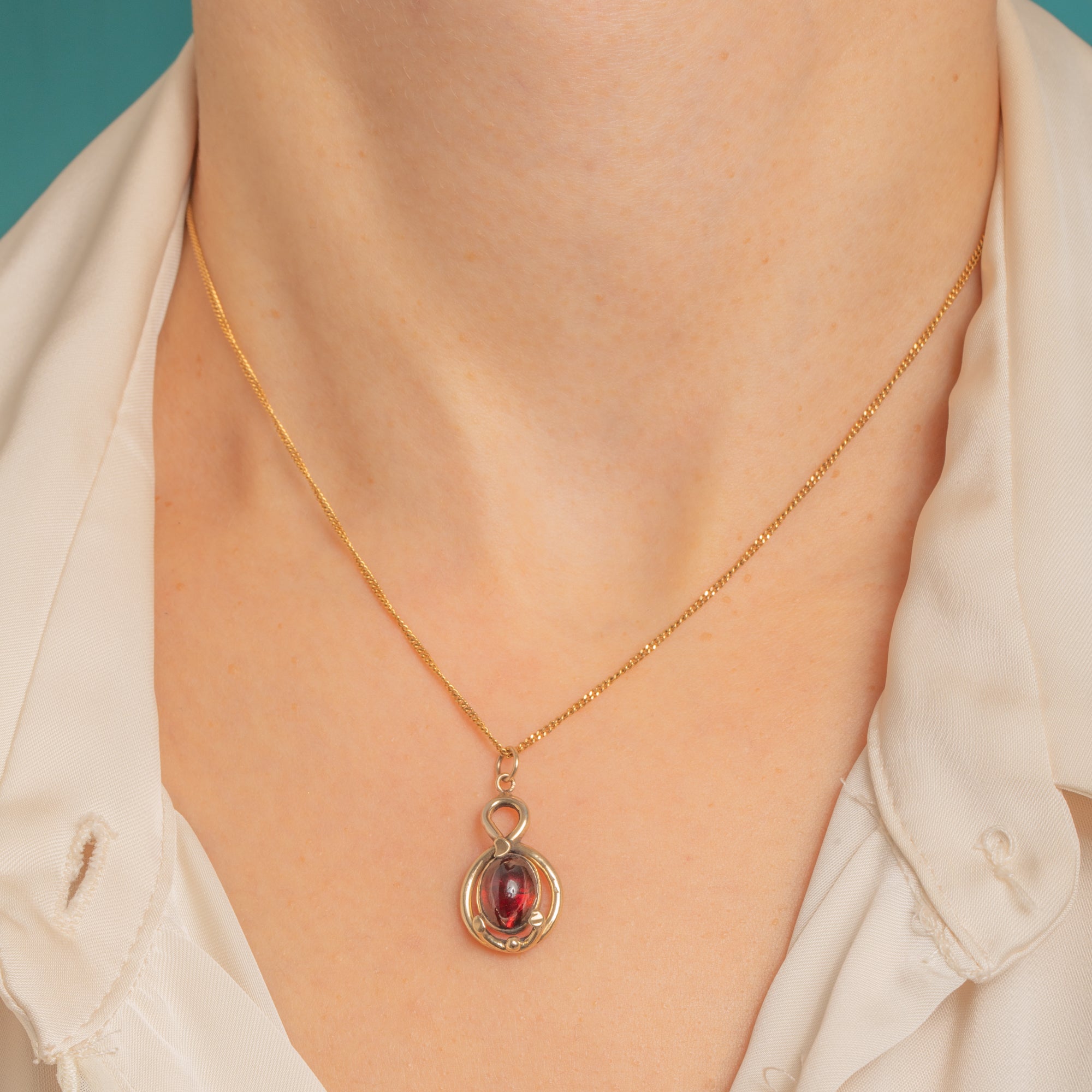 A romantic Victorian Garnet pendant with all the elegance of the era. A deep wine-red oval cabochon sits high in a smooth collet, framed by delicate openwork whiplash scrolls and a graceful figure‑8 top. Petite bead-like accents and softly flowing lines give this jewel a poised, organic allure.