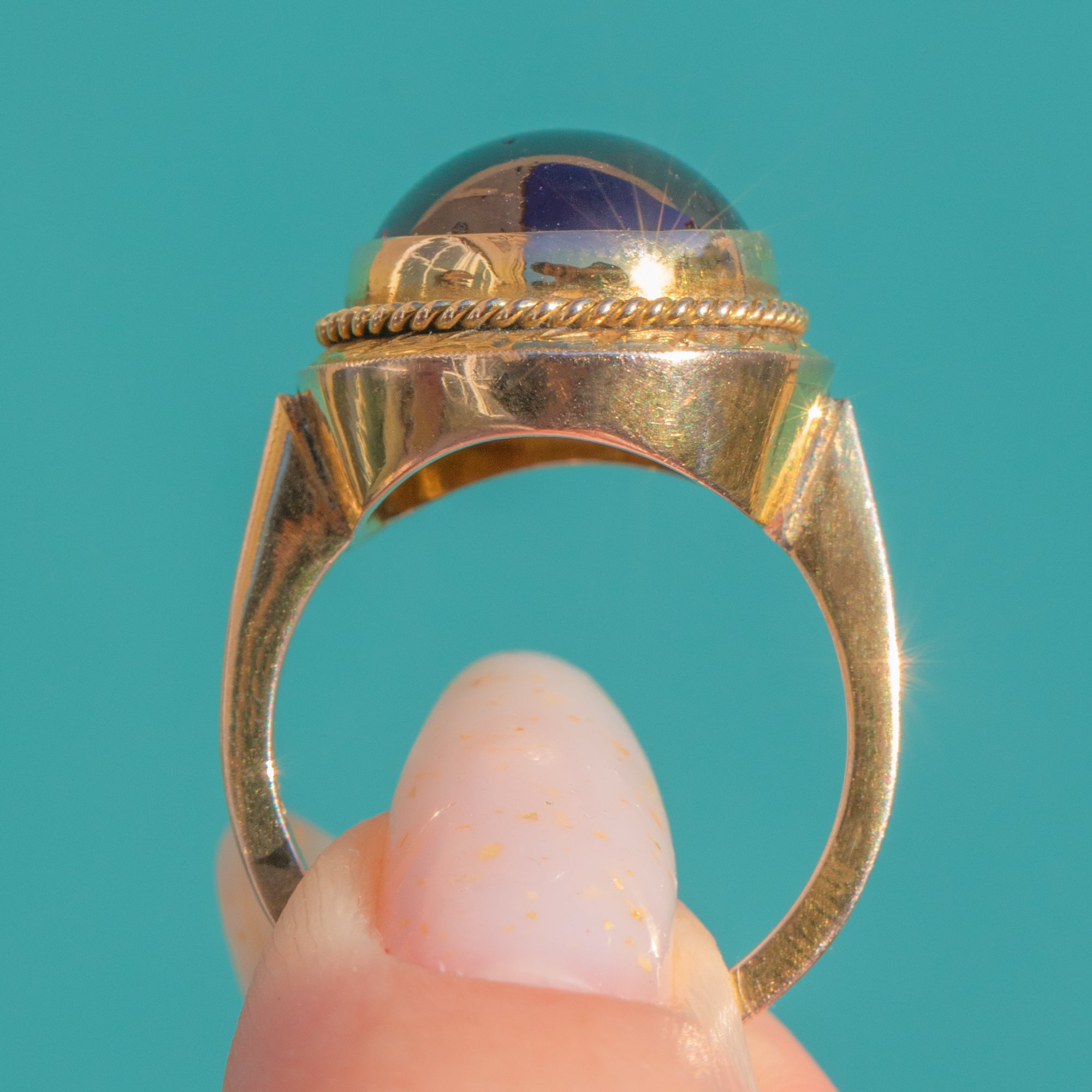A striking Victorian Garnet solitaire, this luscious cabochon glows a deep wine-red from a bold, sculptural setting in bright yellow 9ct Gold. The round, high-domed 4.75ct Garnet is cradled in a tall bezel atop a circular platform, its edge framed with classical rope‑twist for beautiful texture and definition.