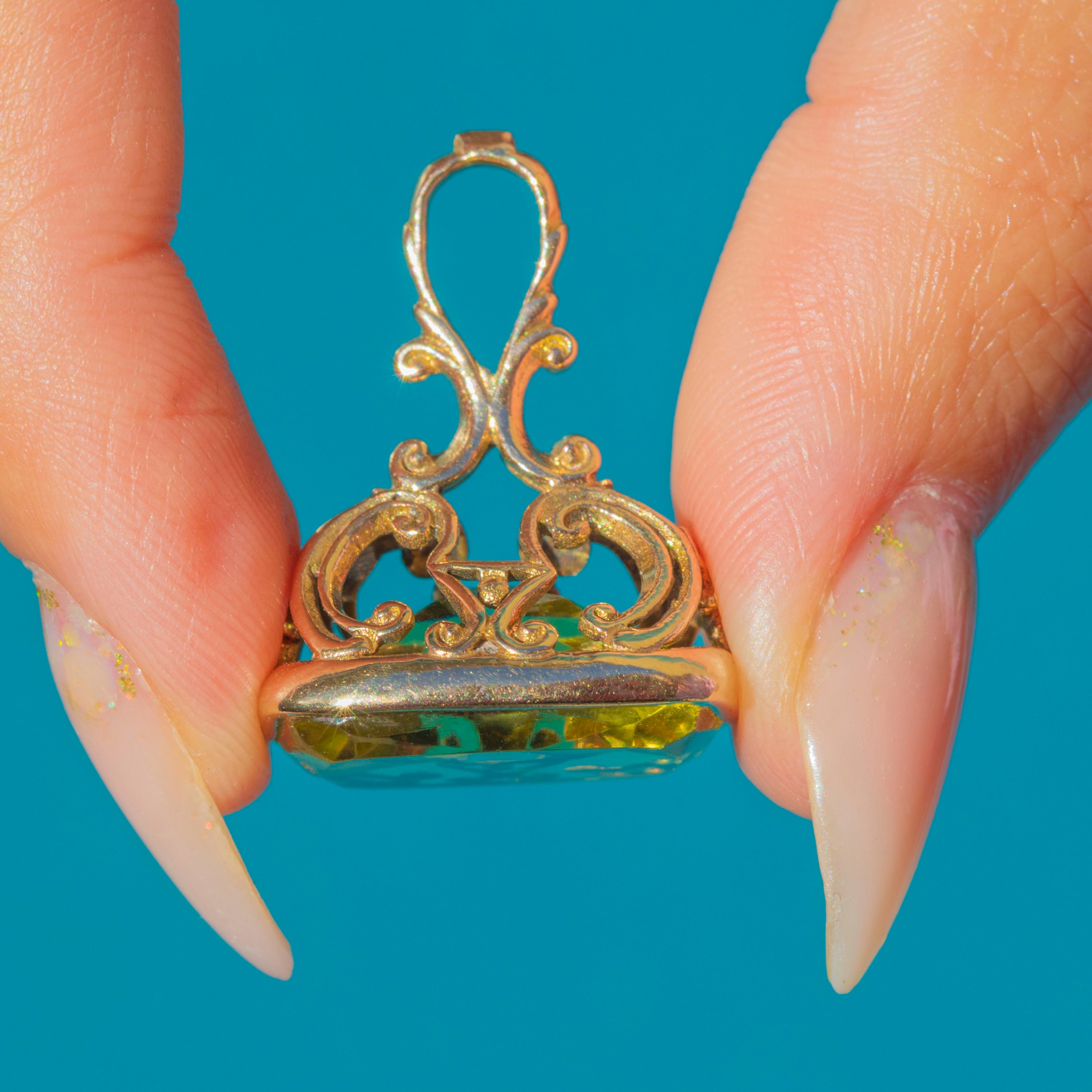 This Victorian fob features a bold green Paste stone set in a 9ct Gold mount with decorative scrollwork shoulders. The vibrant glass gem has a bright, lively presence, catching the light beautifully with its large faceted surface.