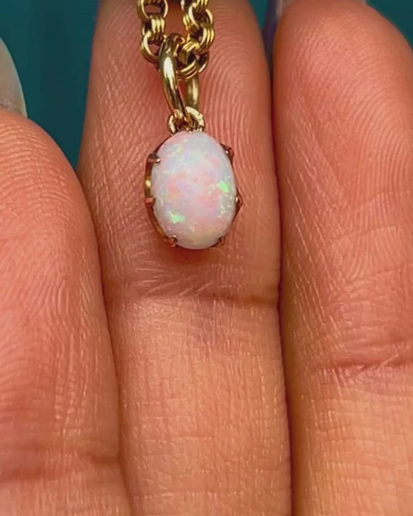 This Victorian 9ct Gold Opal charm is the magical piece you need in your jewellery collection! A dreamy 0.60ct milky natural Opal is displayed within 9ct Gold crown-like claws, exhibiting electric rainbows in the light.