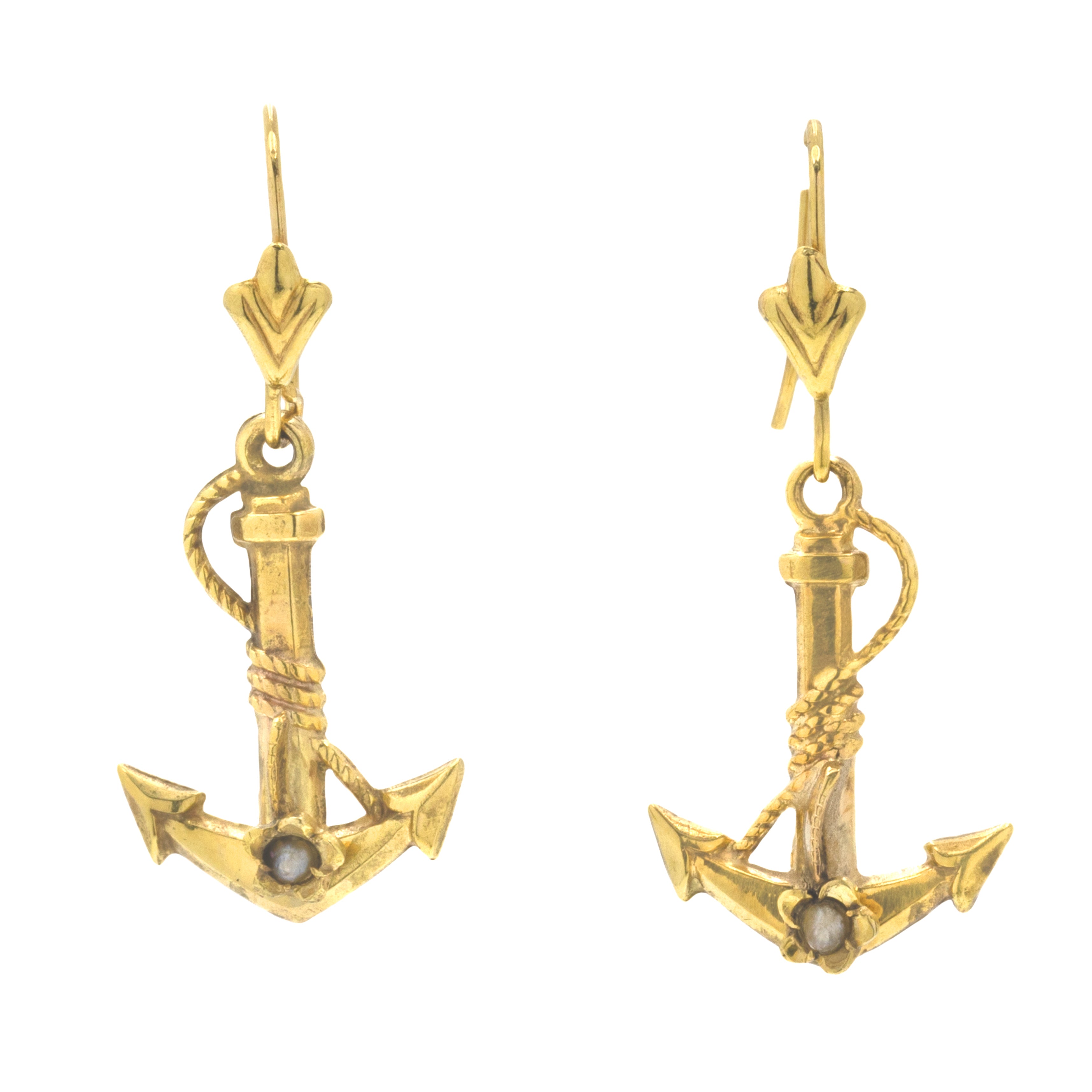 Ahoy! This pair of Victorian 9ct Gold Pearl anchor earrings are a wonderful find! A characterful choice, these antique earrings have been crafted from buttery 9ct Gold and are inlaid with a seed Pearl at their centre.